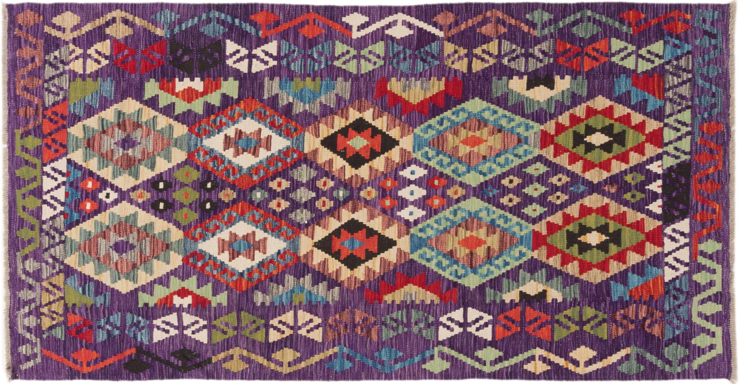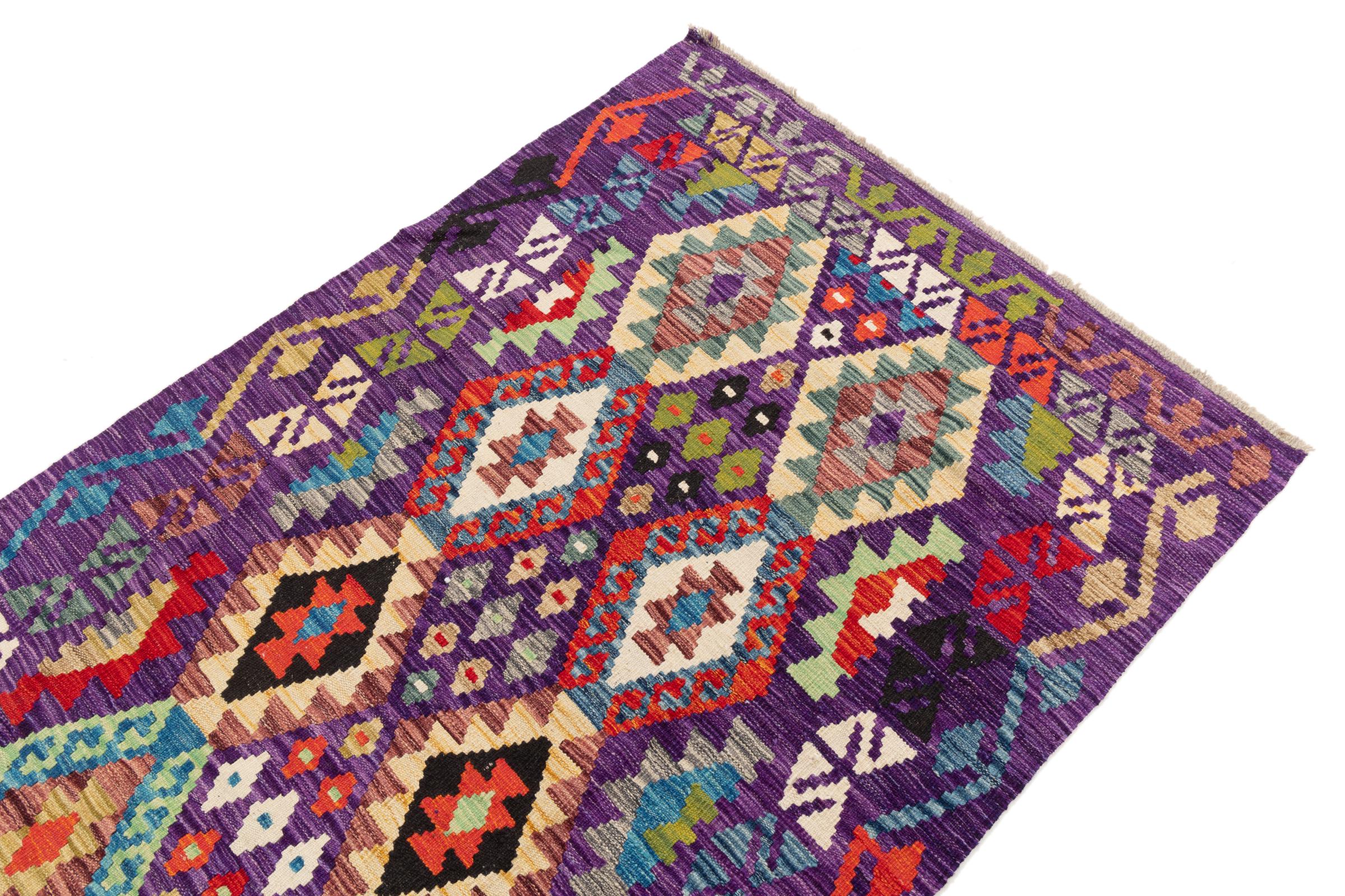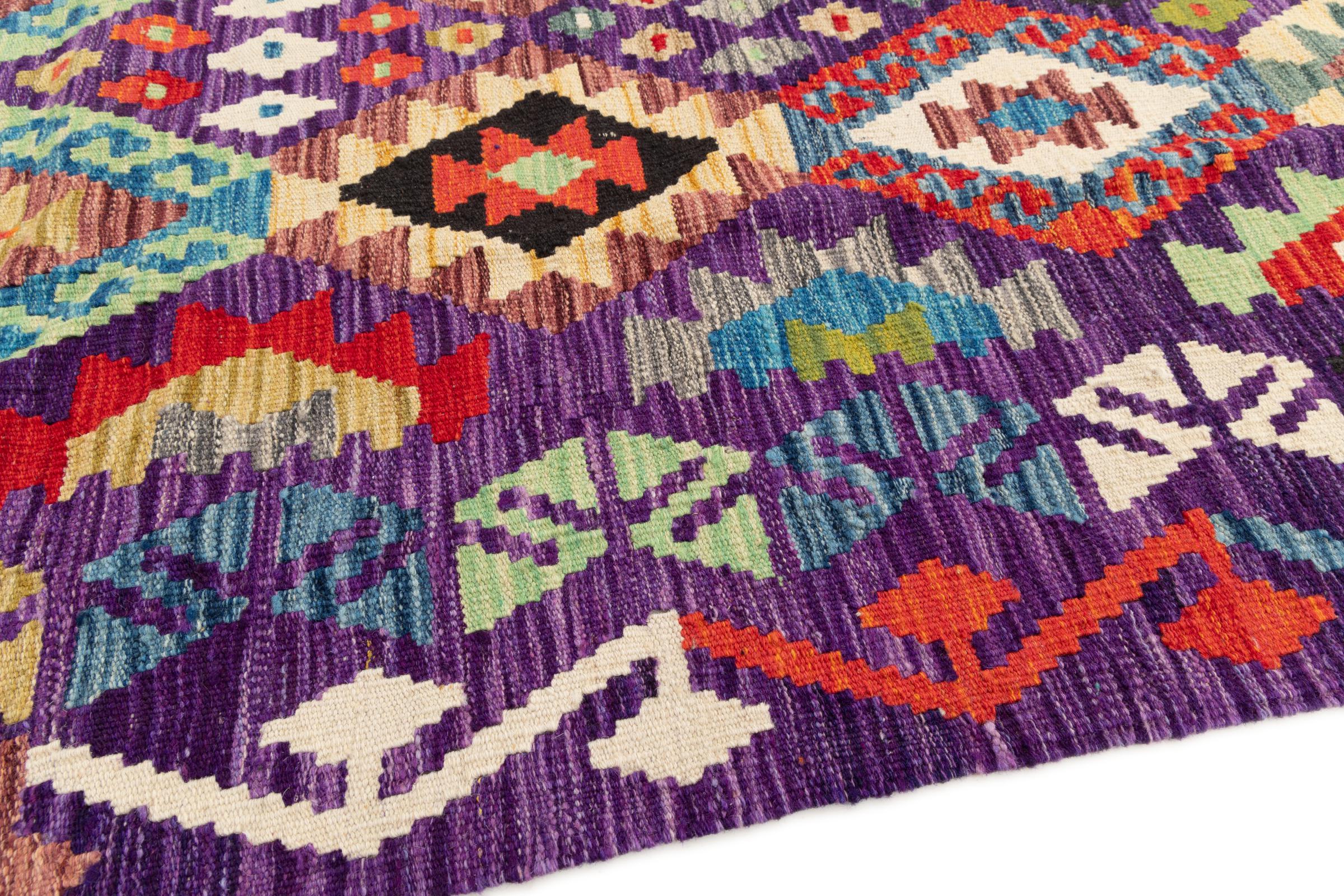 This handwoven Kilim Afghan is a wonderful and unique piece of art. Hard to believe that these modern colours and patterns have already been used centuries ago. This carpet has been woven by hand in old tradition in Afghanistan. It delivers a portion of contemporary history, which you won't find in this specific design a second time. It consists of high-grade natural wool and gives your home a personalised touch.