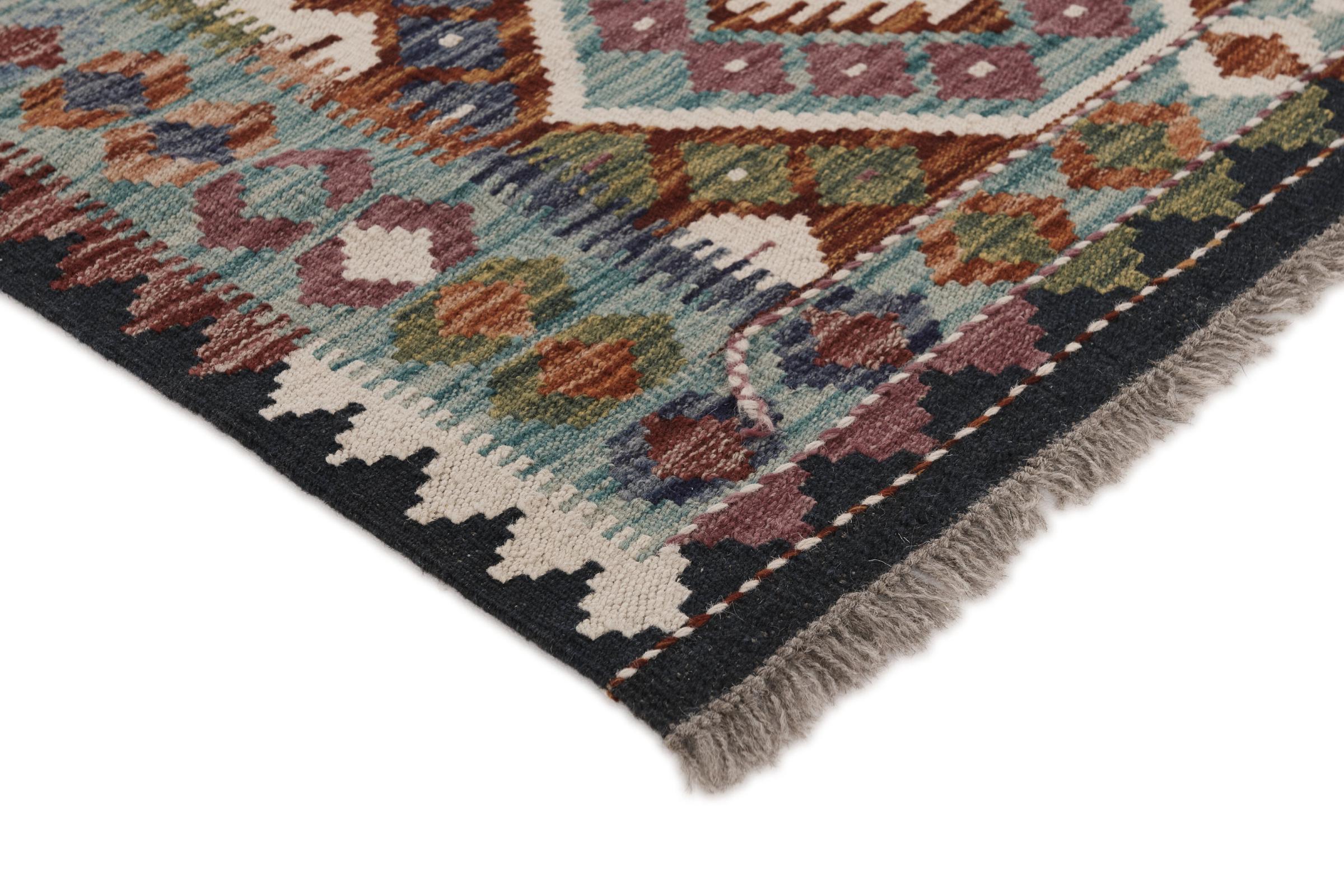 This handwoven Kilim Afghan is a wonderful and unique piece of art. Hard to believe that these modern colours and patterns have already been used centuries ago. This carpet has been woven by hand in old tradition in Afghanistan. It delivers a portion of contemporary history, which you won't find in this specific design a second time. It consists of high-grade natural wool and gives your home a personalised touch.