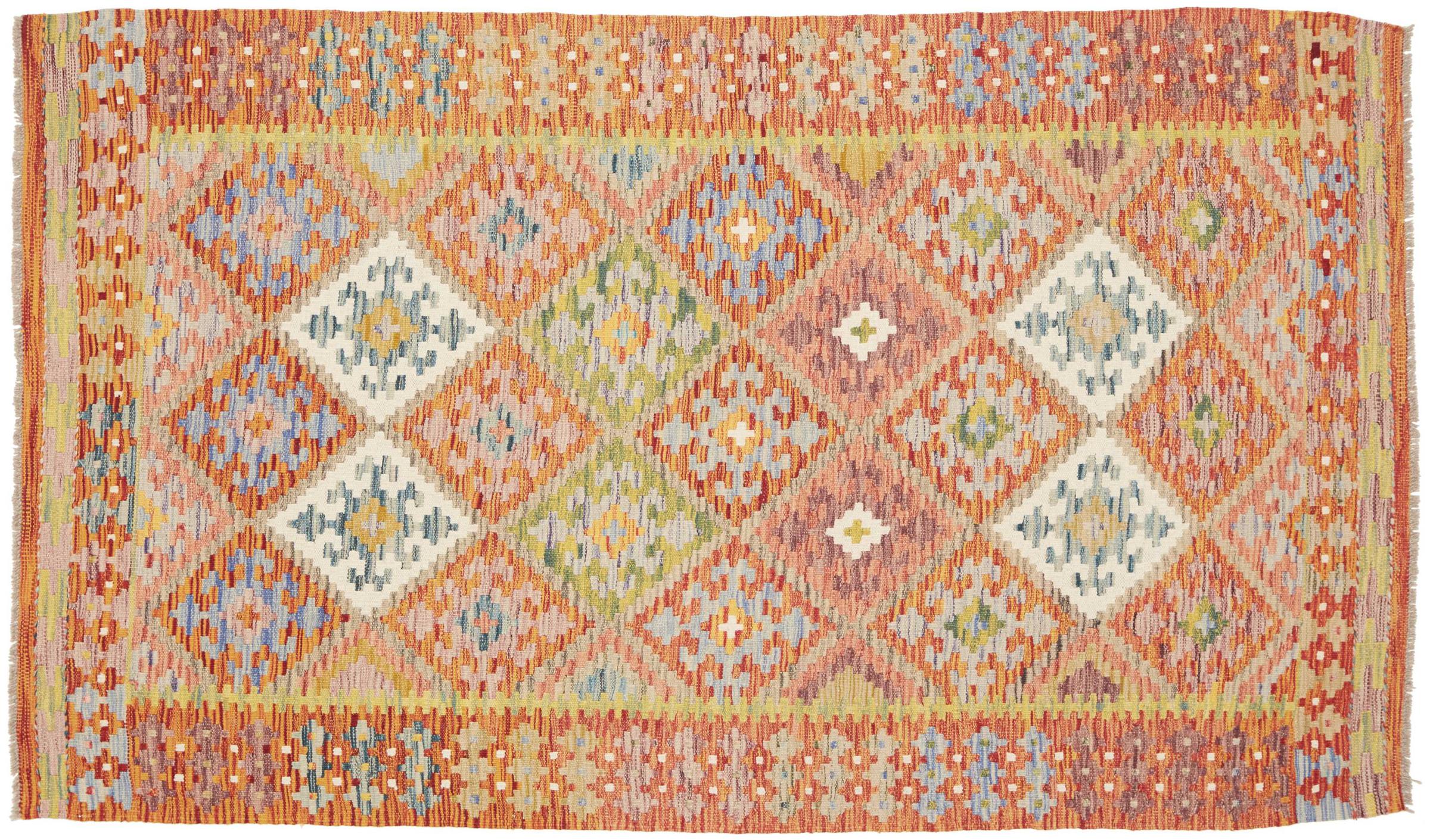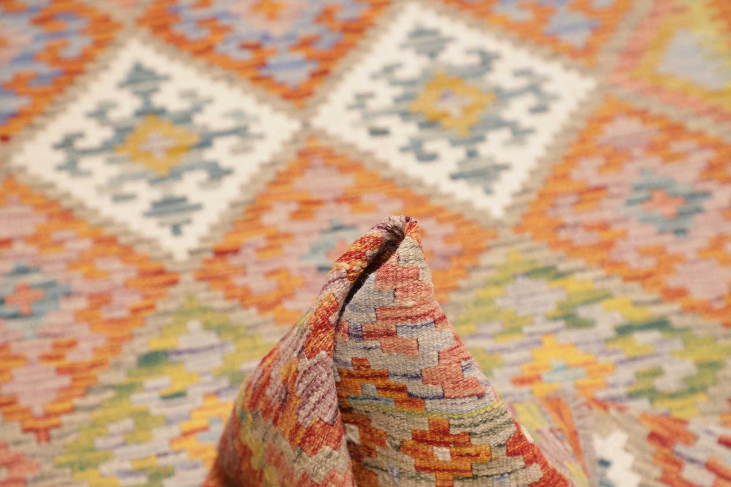 This handwoven Kilim Afghan is a wonderful and unique piece of art. Hard to believe that these modern colours and patterns have already been used centuries ago. This carpet has been woven by hand in old tradition in Afghanistan. It delivers a portion of contemporary history, which you won't find in this specific design a second time. It consists of high-grade natural wool and gives your home a personalised touch.