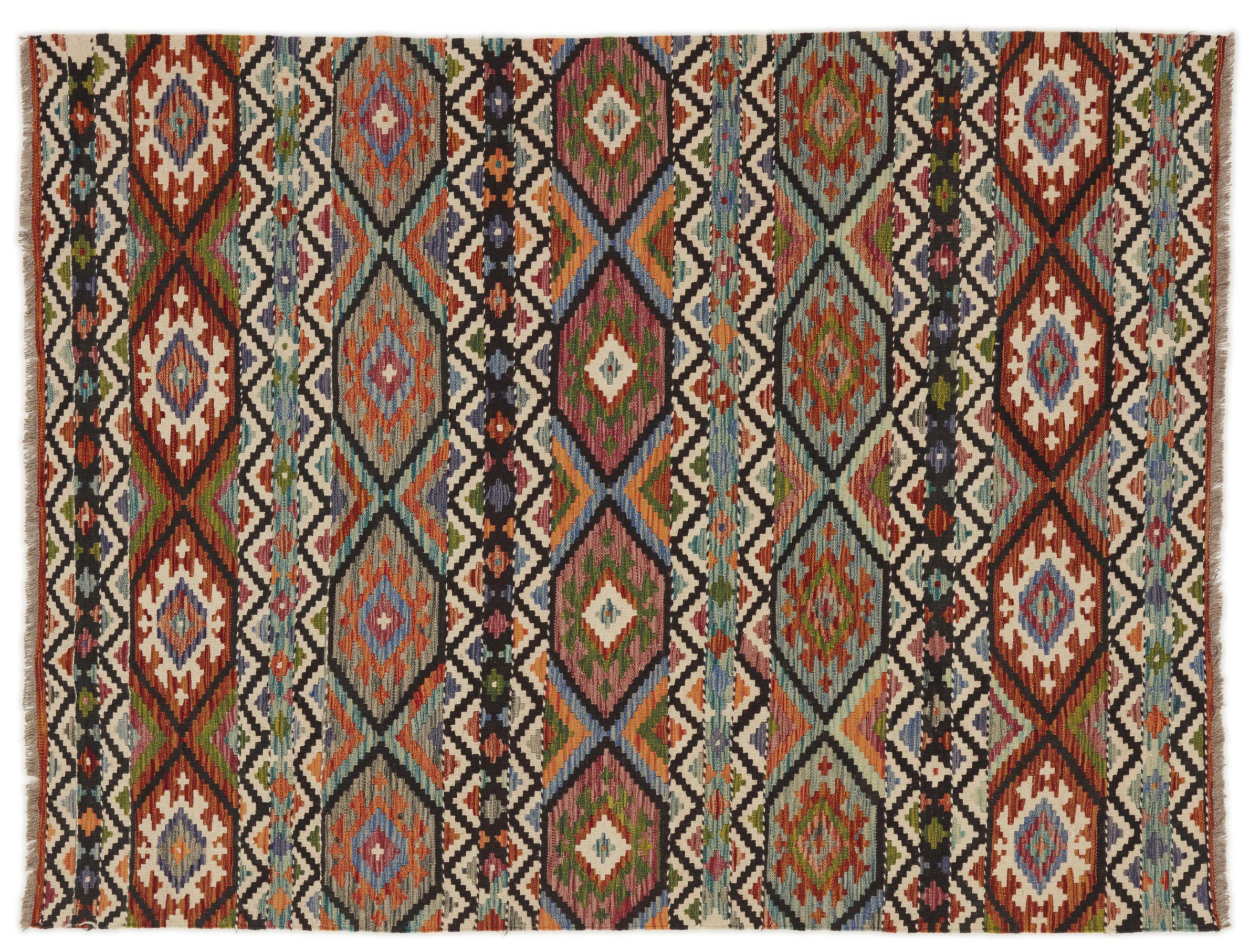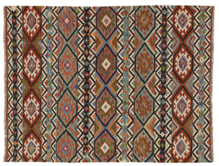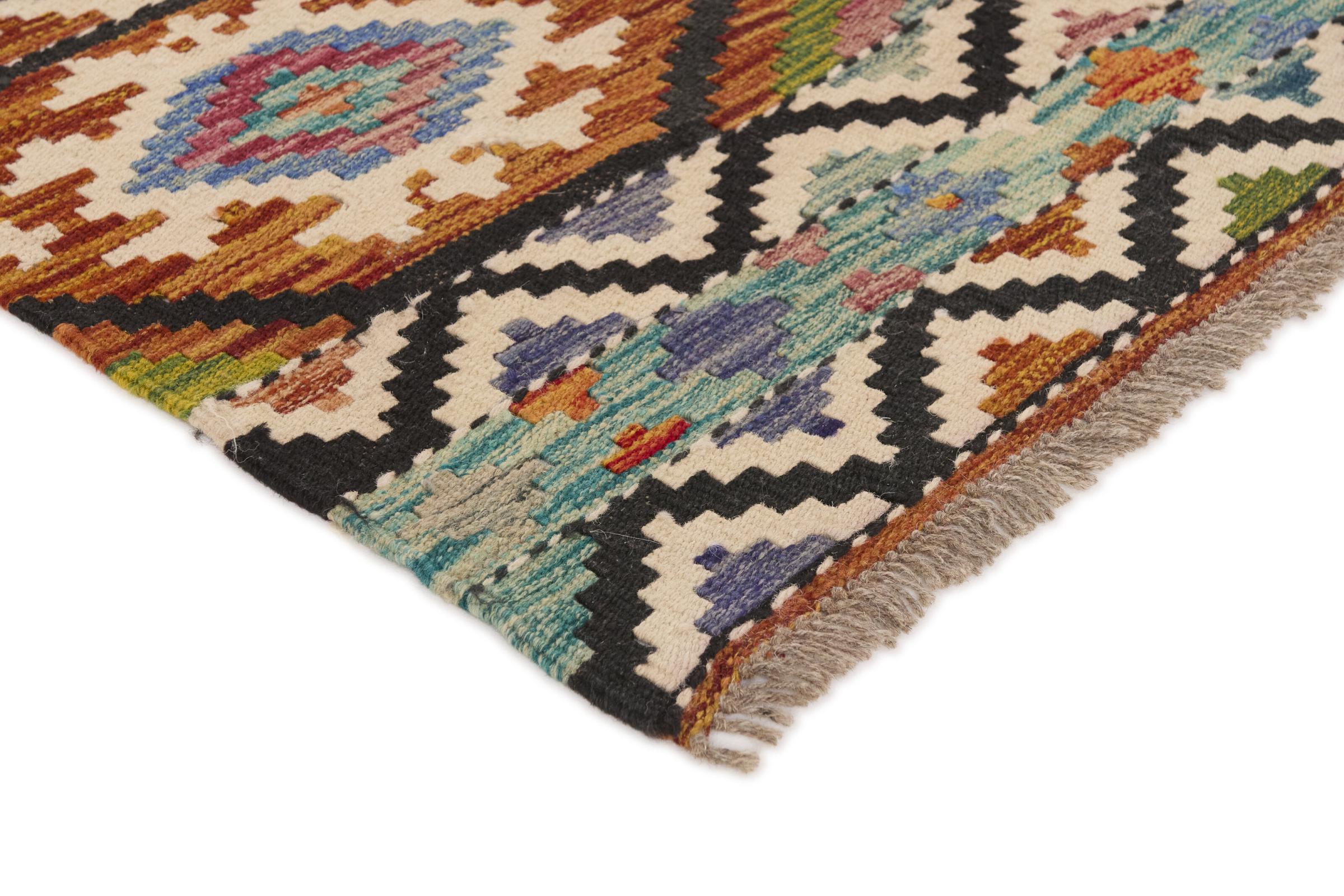 This handwoven Kilim Afghan is a wonderful and unique piece of art. Hard to believe that these modern colours and patterns have already been used centuries ago. This carpet has been woven by hand in old tradition in Afghanistan. It delivers a portion of contemporary history, which you won't find in this specific design a second time. It consists of high-grade natural wool and gives your home a personalised touch.
