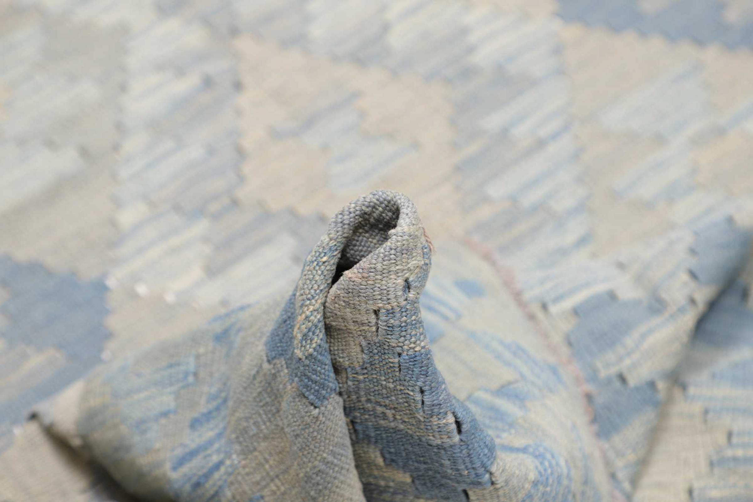 This rug was made as a flat weave by hand on a loom. Flatweave is the term used to describe rugs that have no pile. As the name promises, these rugs are woven and not knotted. This results in a flat rug with a structured surface. Flatweaves are not as soft and usually thinner than knotted rugs. At the same time they are much less complex to manufacture and can usually be laid out from both sides (front and back). Their patterns are usually geometric, which is determined by the fabric.