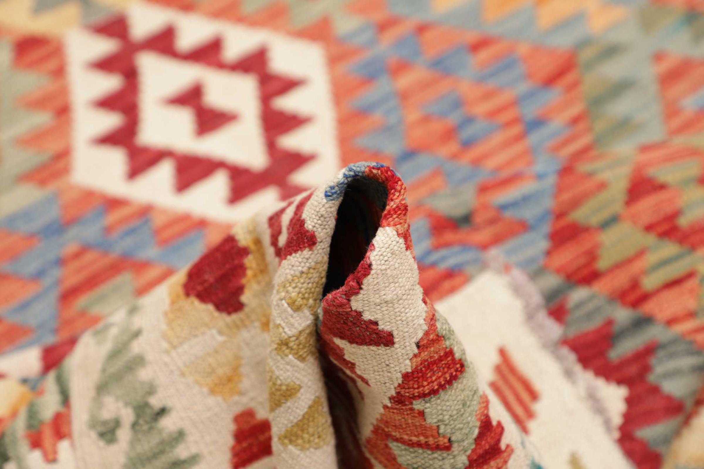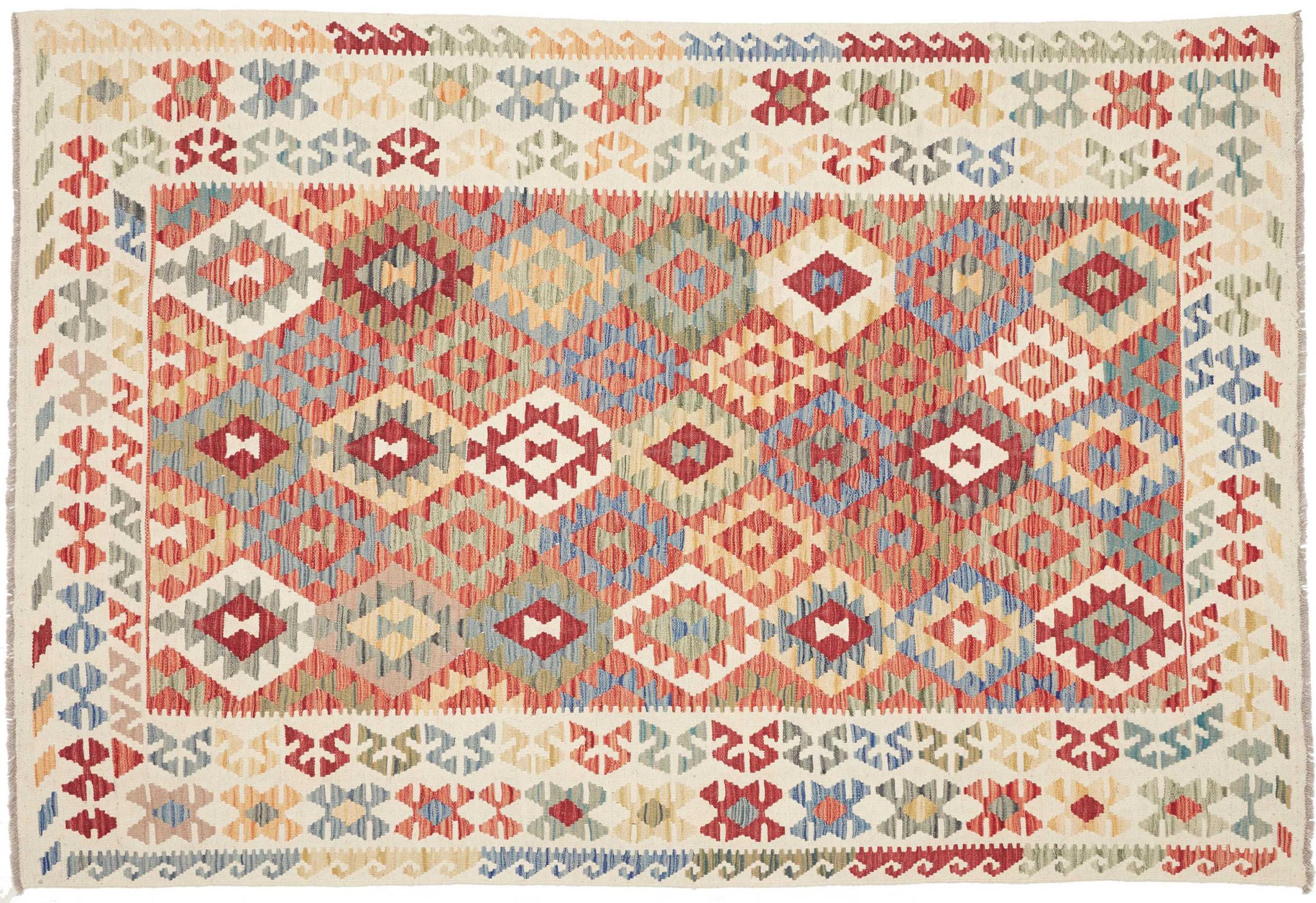 This handwoven Kilim Afghan is a wonderful and unique piece of art. Hard to believe that these modern colours and patterns have already been used centuries ago. This carpet has been woven by hand in old tradition in Afghanistan. It delivers a portion of contemporary history, which you won't find in this specific design a second time. It consists of high-grade natural wool and gives your home a personalised touch.