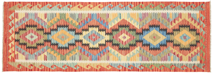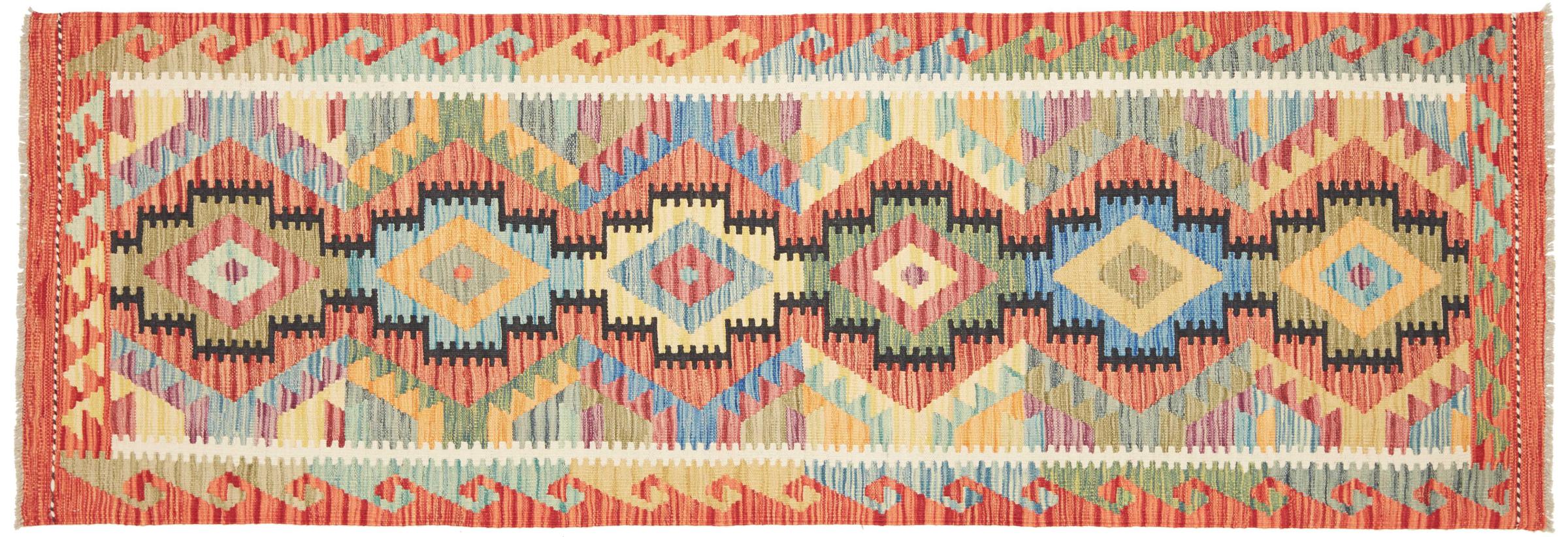 This handwoven Kilim Afghan is a wonderful and unique piece of art. Hard to believe that these modern colours and patterns have already been used centuries ago. This carpet has been woven by hand in old tradition in Afghanistan. It delivers a portion of contemporary history, which you won't find in this specific design a second time. It consists of high-grade natural wool and gives your home a personalised touch.
