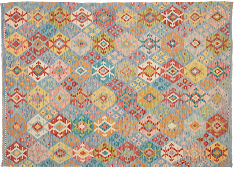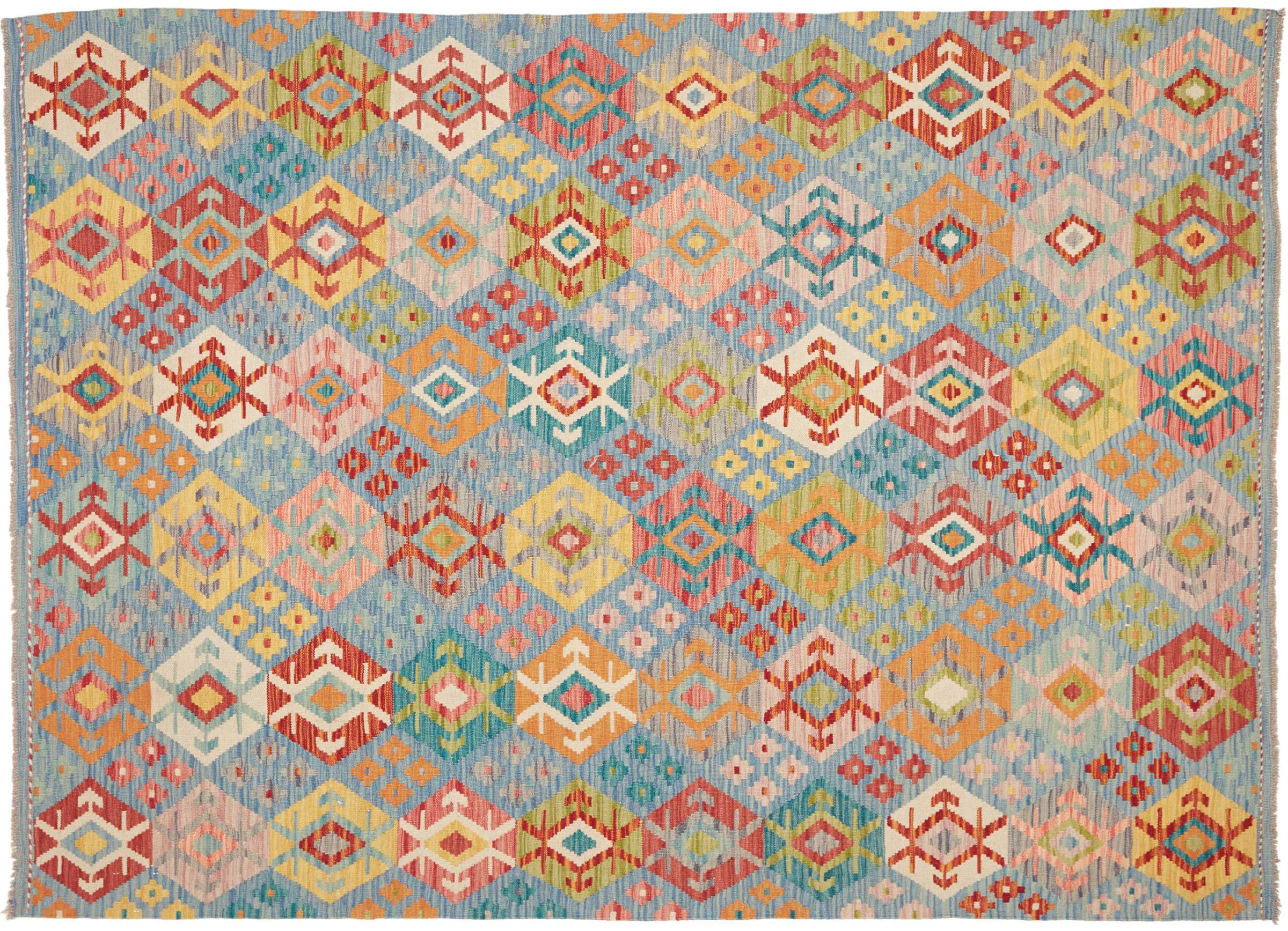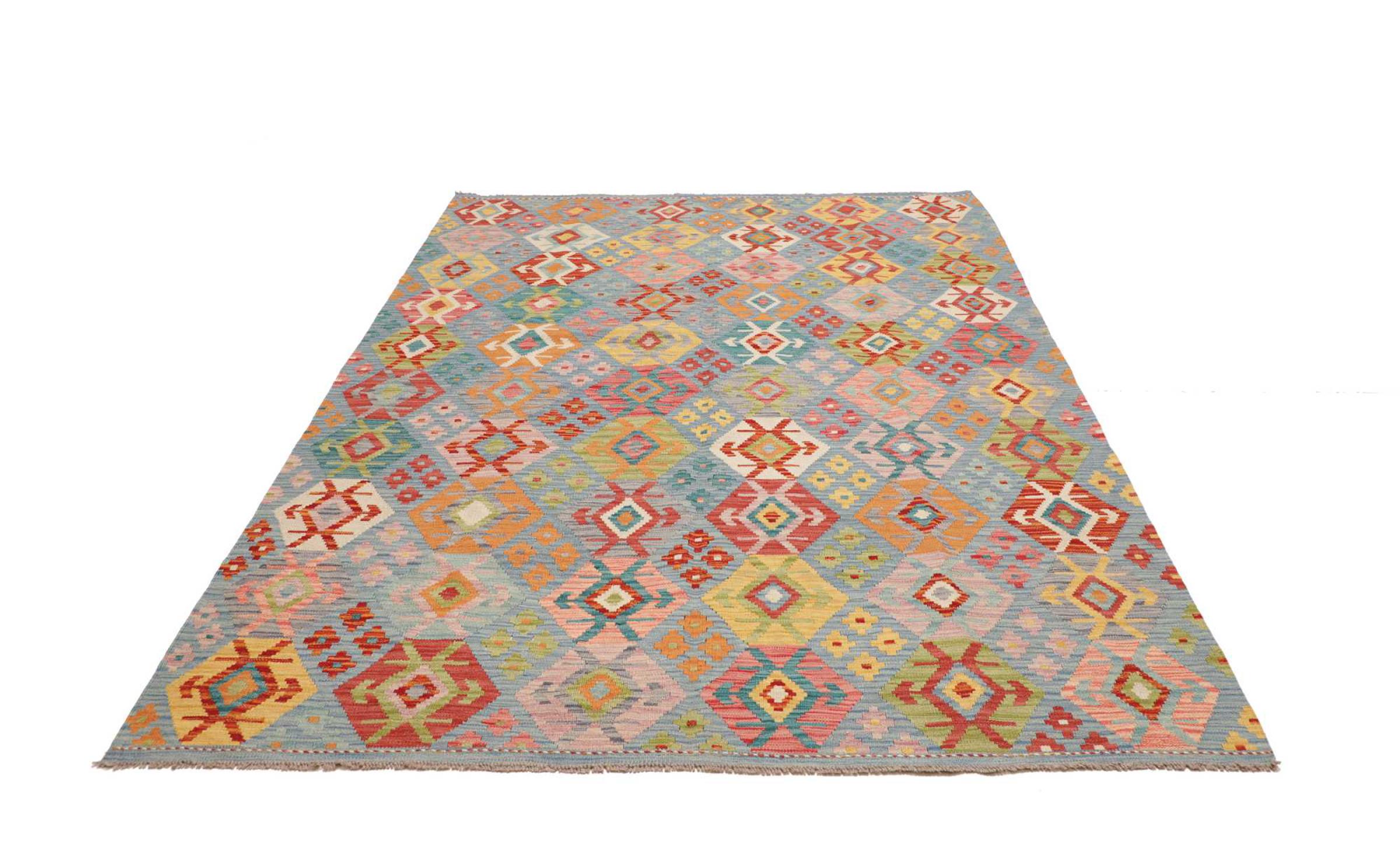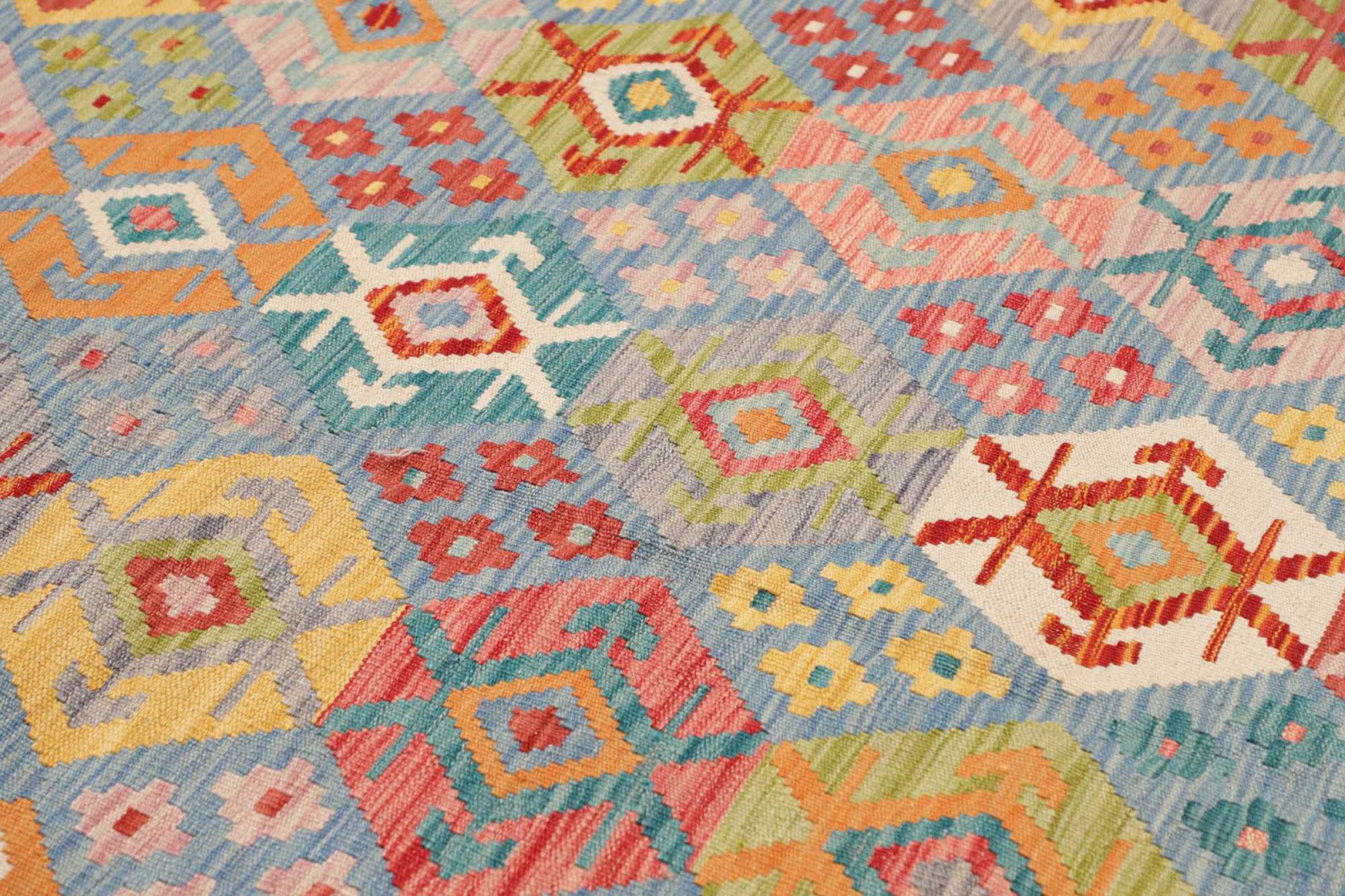 This handwoven Kilim Afghan is a wonderful and unique piece of art. Hard to believe that these modern colours and patterns have already been used centuries ago. This carpet has been woven by hand in old tradition in Afghanistan. It delivers a portion of contemporary history, which you won't find in this specific design a second time. It consists of high-grade natural wool and gives your home a personalised touch.
