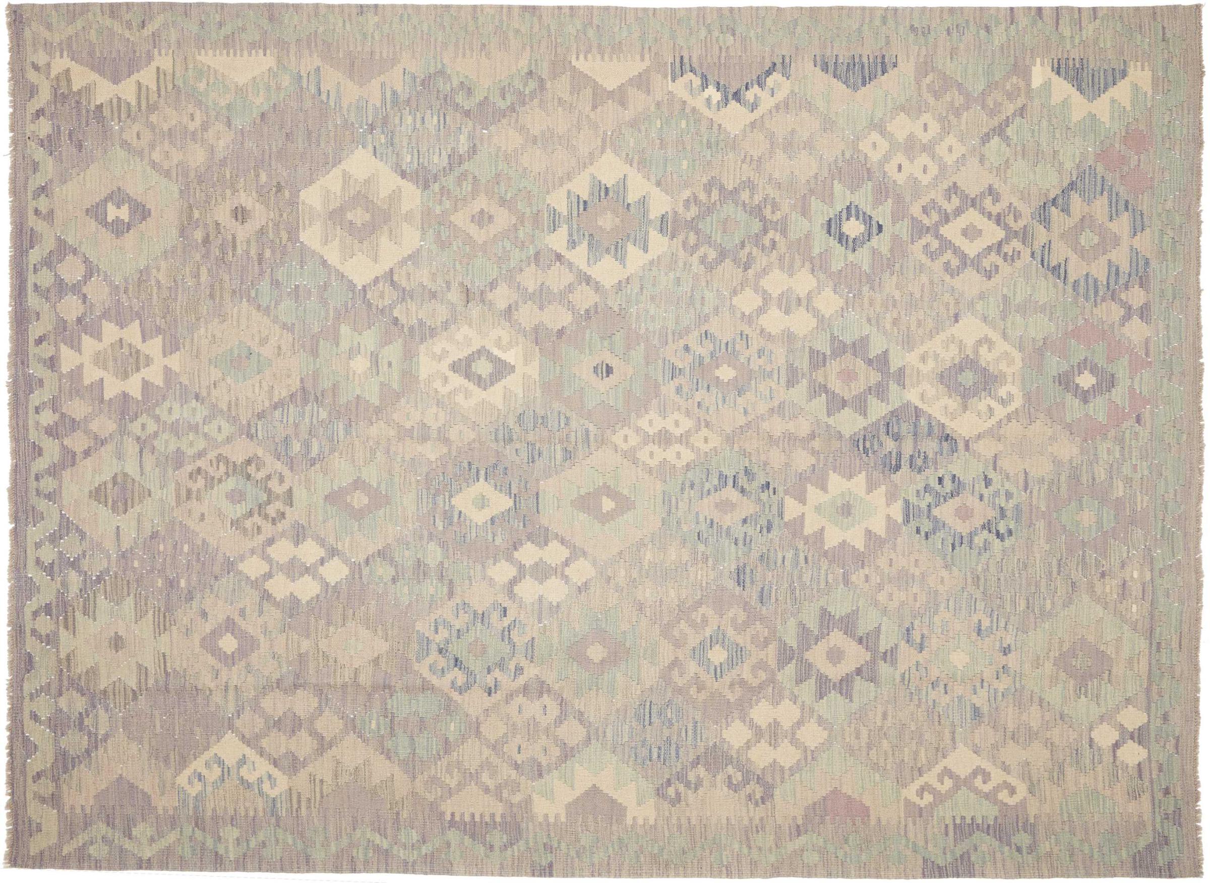 This handwoven Kilim Afghan is a wonderful and unique piece of art. Hard to believe that these modern colours and patterns have already been used centuries ago. This carpet has been woven by hand in old tradition in Afghanistan. It delivers a portion of contemporary history, which you won't find in this specific design a second time. It consists of high-grade natural wool and gives your home a personalised touch.