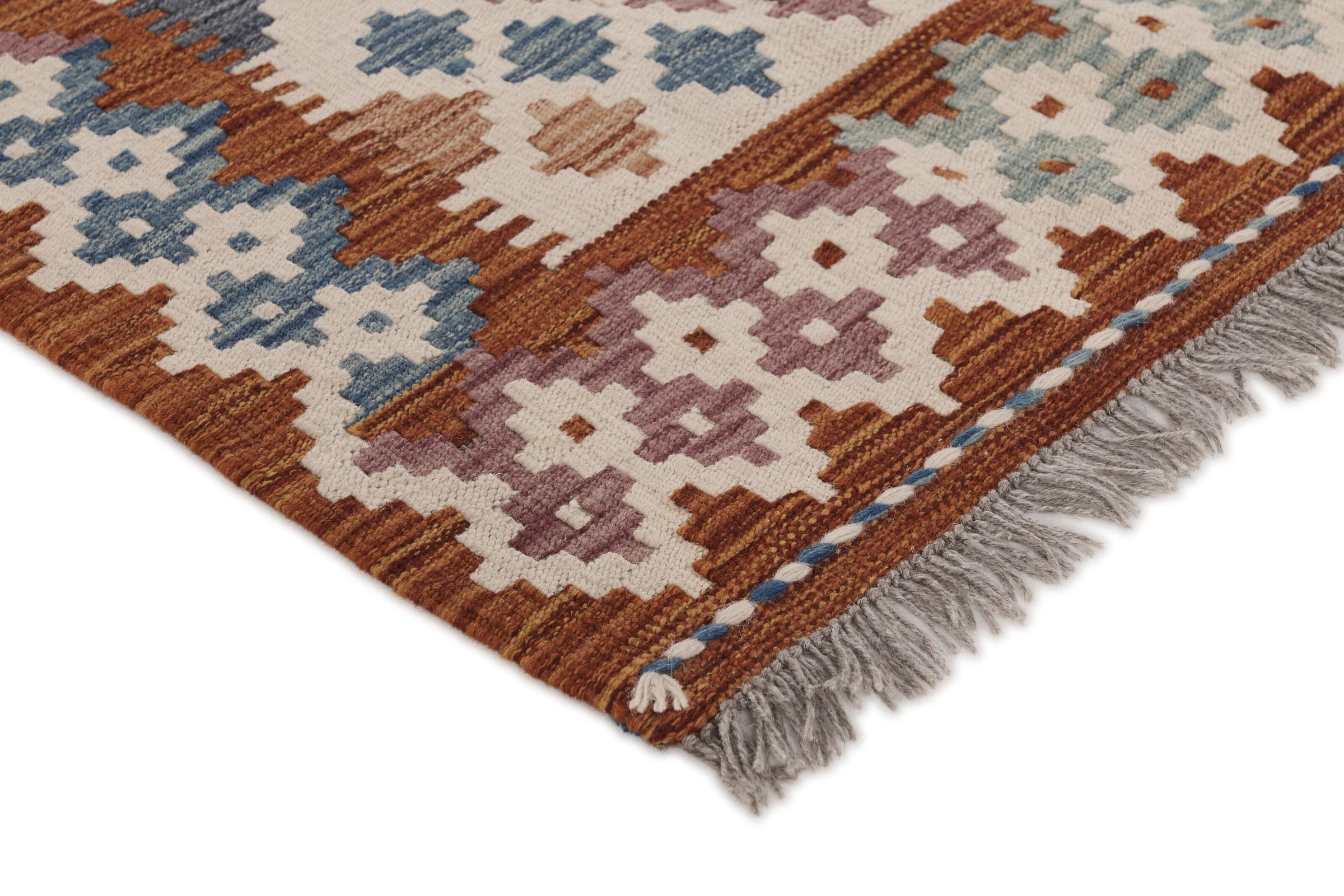 This handwoven Kilim Afghan is a wonderful and unique piece of art. Hard to believe that these modern colours and patterns have already been used centuries ago. This carpet has been woven by hand in old tradition in Afghanistan. It delivers a portion of contemporary history, which you won't find in this specific design a second time. It consists of high-grade natural wool and gives your home a personalised touch.