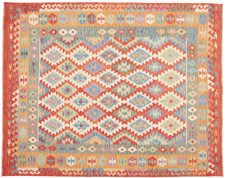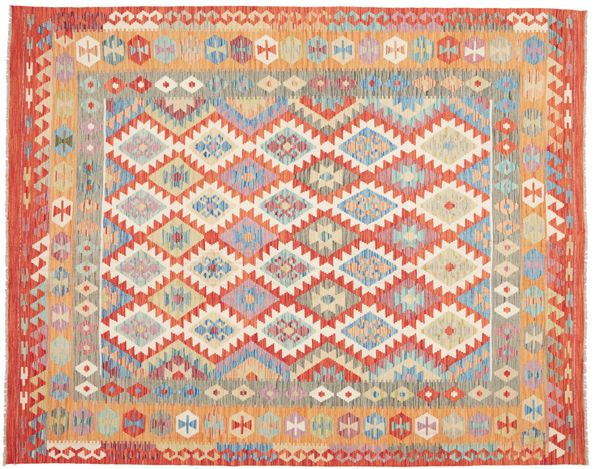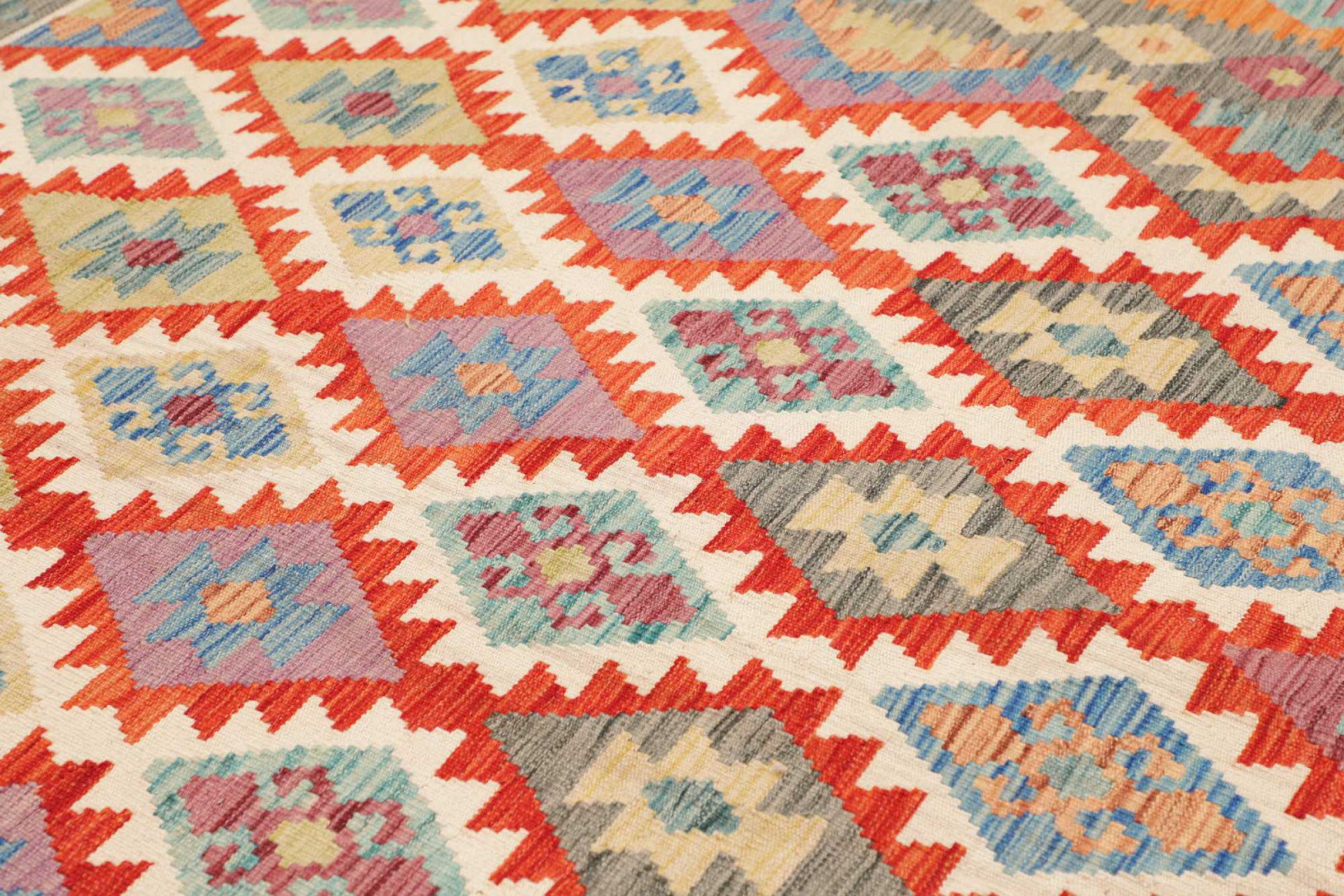 This handwoven Kilim Afghan is a wonderful and unique piece of art. Hard to believe that these modern colours and patterns have already been used centuries ago. This carpet has been woven by hand in old tradition in Afghanistan. It delivers a portion of contemporary history, which you won't find in this specific design a second time. It consists of high-grade natural wool and gives your home a personalised touch.