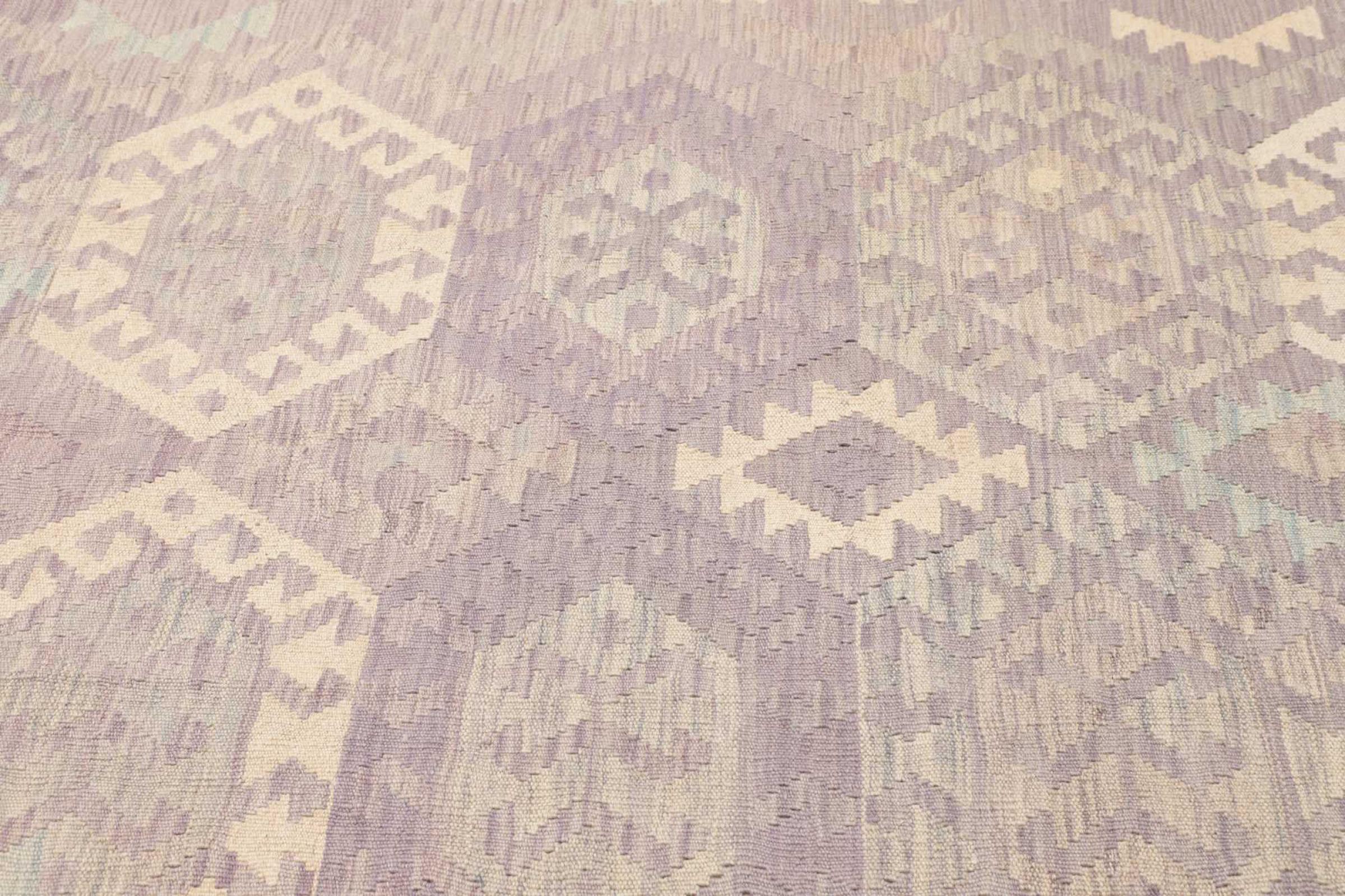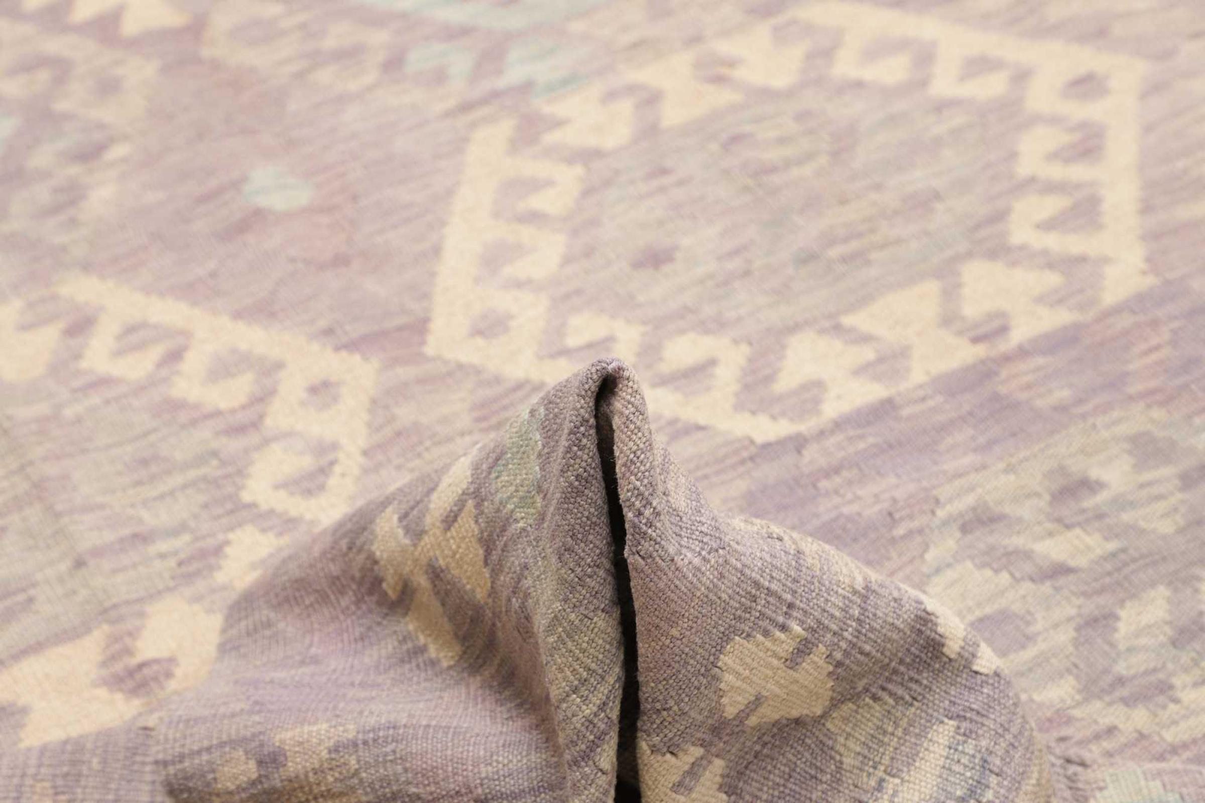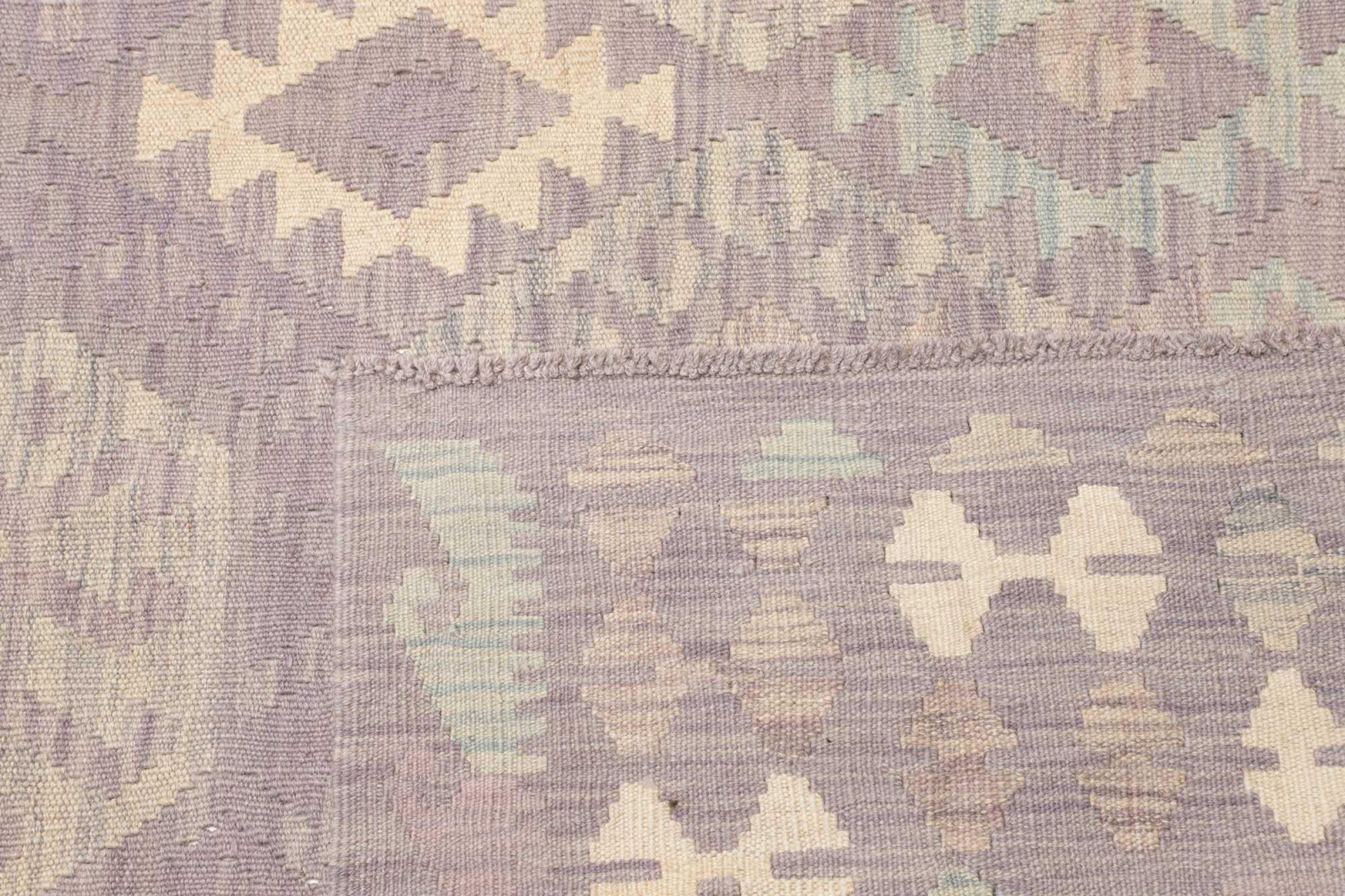 This rug was made as a flat weave by hand on a loom. Flatweave is the term used to describe rugs that have no pile. As the name promises, these rugs are woven and not knotted. This results in a flat rug with a structured surface. Flatweaves are not as soft and usually thinner than knotted rugs. At the same time they are much less complex to manufacture and can usually be laid out from both sides (front and back). Their patterns are usually geometric, which is determined by the fabric.