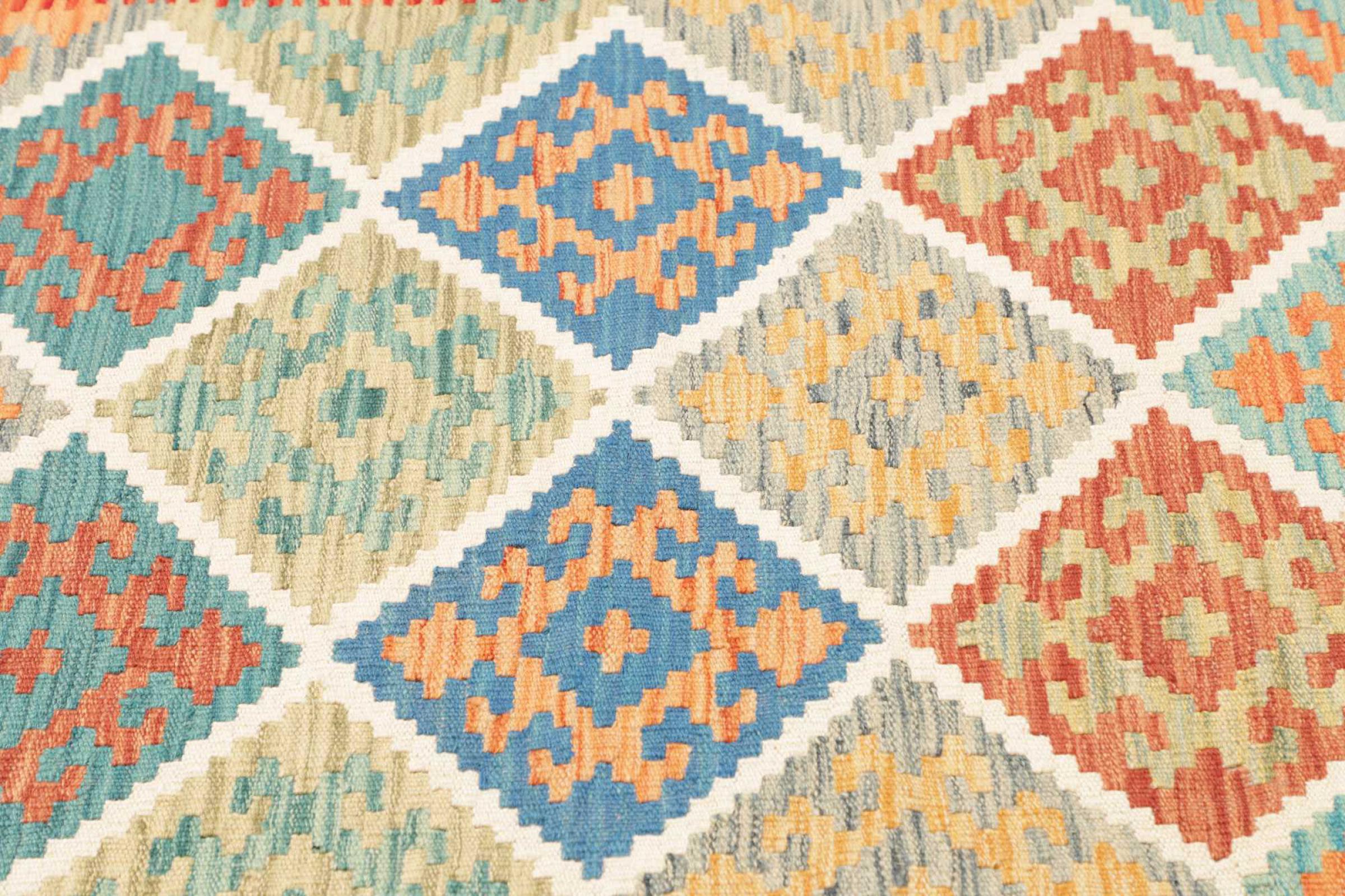 This rug was made as a flat weave by hand on a loom. Flatweave is the term used to describe rugs that have no pile. As the name promises, these rugs are woven and not knotted. This results in a flat rug with a structured surface. Flatweaves are not as soft and usually thinner than knotted rugs. At the same time they are much less complex to manufacture and can usually be laid out from both sides (front and back). Their patterns are usually geometric, which is determined by the fabric.