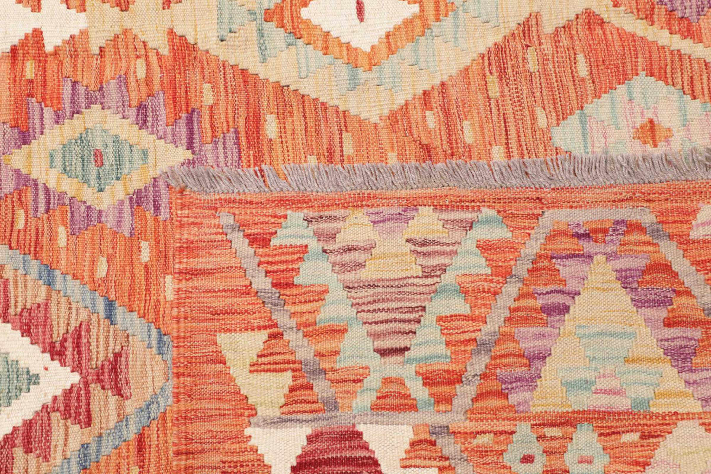 This rug was made as a flat weave by hand on a loom. Flatweave is the term used to describe rugs that have no pile. As the name promises, these rugs are woven and not knotted. This results in a flat rug with a structured surface. Flatweaves are not as soft and usually thinner than knotted rugs. At the same time they are much less complex to manufacture and can usually be laid out from both sides (front and back). Their patterns are usually geometric, which is determined by the fabric.