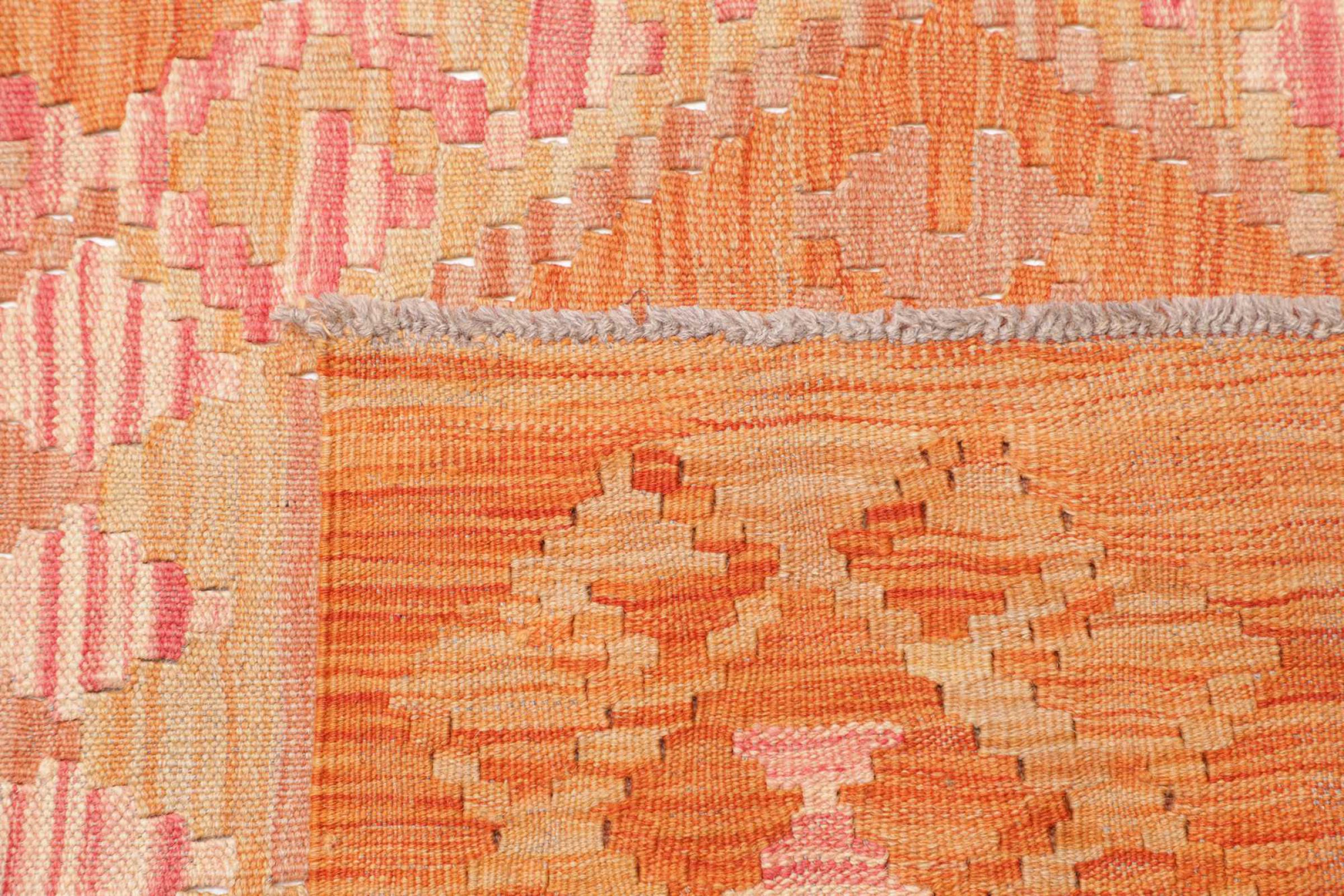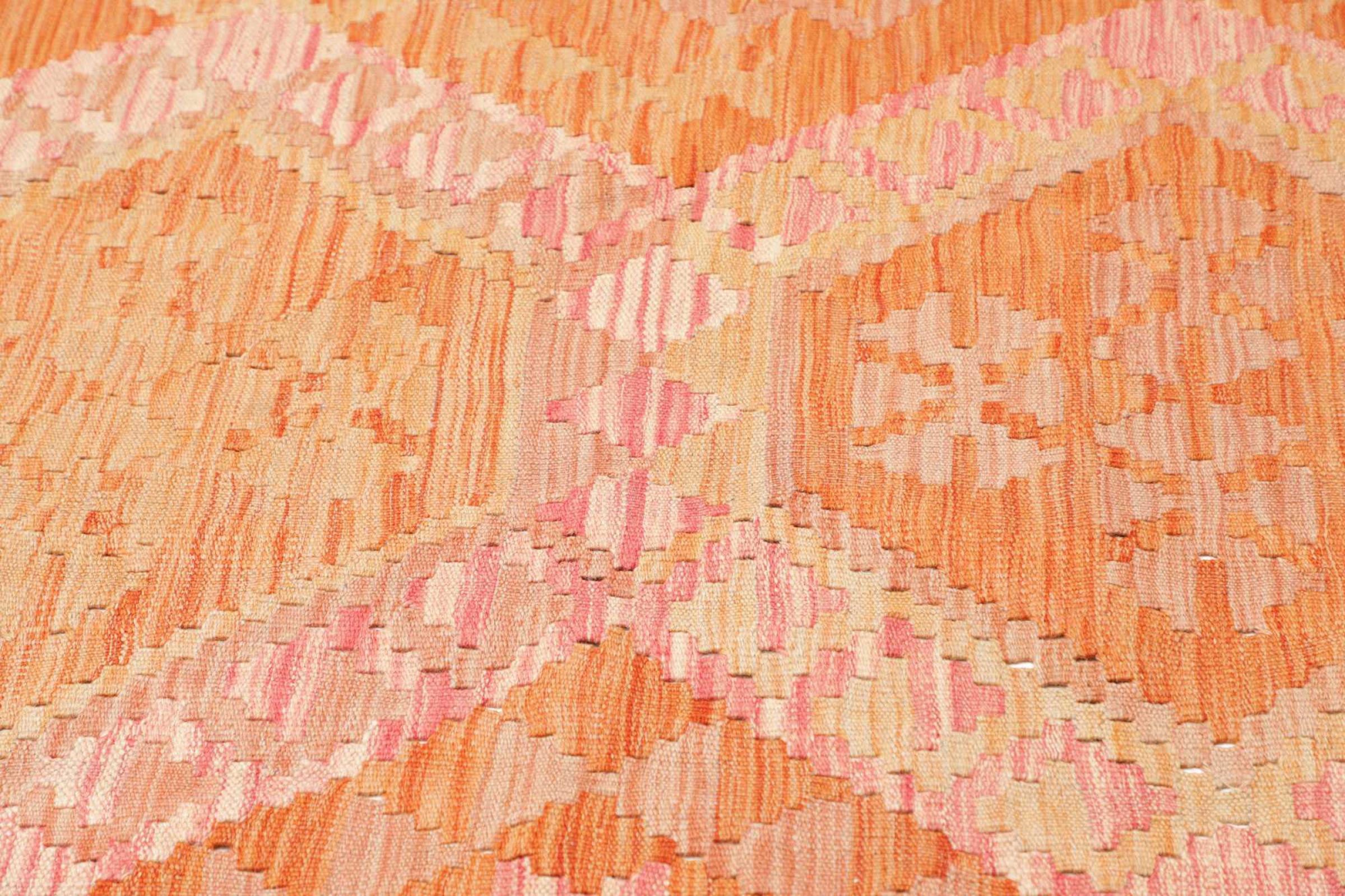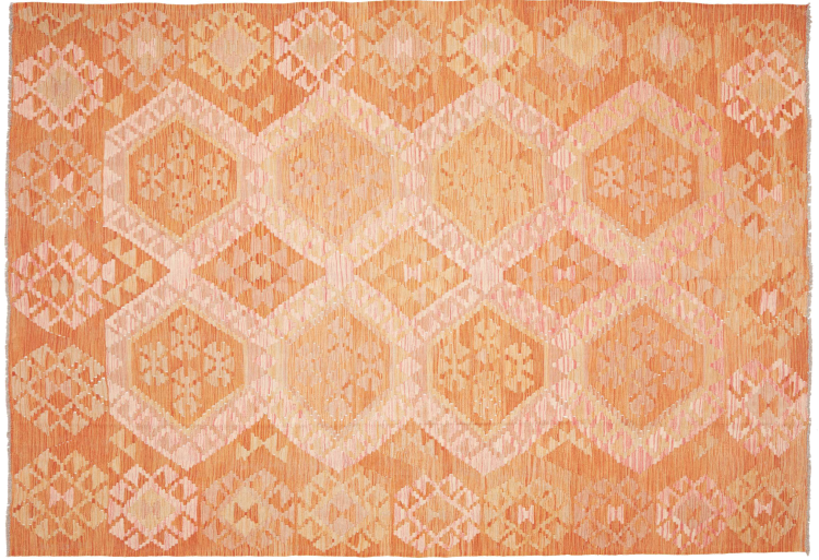 This rug was made as a flat weave by hand on a loom. Flatweave is the term used to describe rugs that have no pile. As the name promises, these rugs are woven and not knotted. This results in a flat rug with a structured surface. Flatweaves are not as soft and usually thinner than knotted rugs. At the same time they are much less complex to manufacture and can usually be laid out from both sides (front and back). Their patterns are usually geometric, which is determined by the fabric.