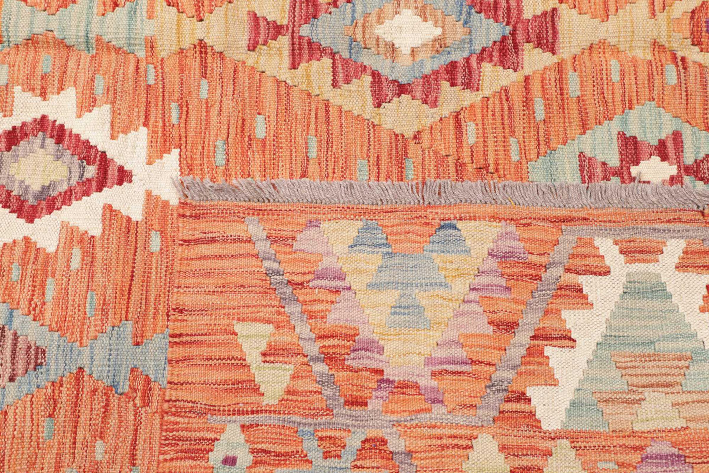 This rug was made as a flat weave by hand on a loom. Flatweave is the term used to describe rugs that have no pile. As the name promises, these rugs are woven and not knotted. This results in a flat rug with a structured surface. Flatweaves are not as soft and usually thinner than knotted rugs. At the same time they are much less complex to manufacture and can usually be laid out from both sides (front and back). Their patterns are usually geometric, which is determined by the fabric.