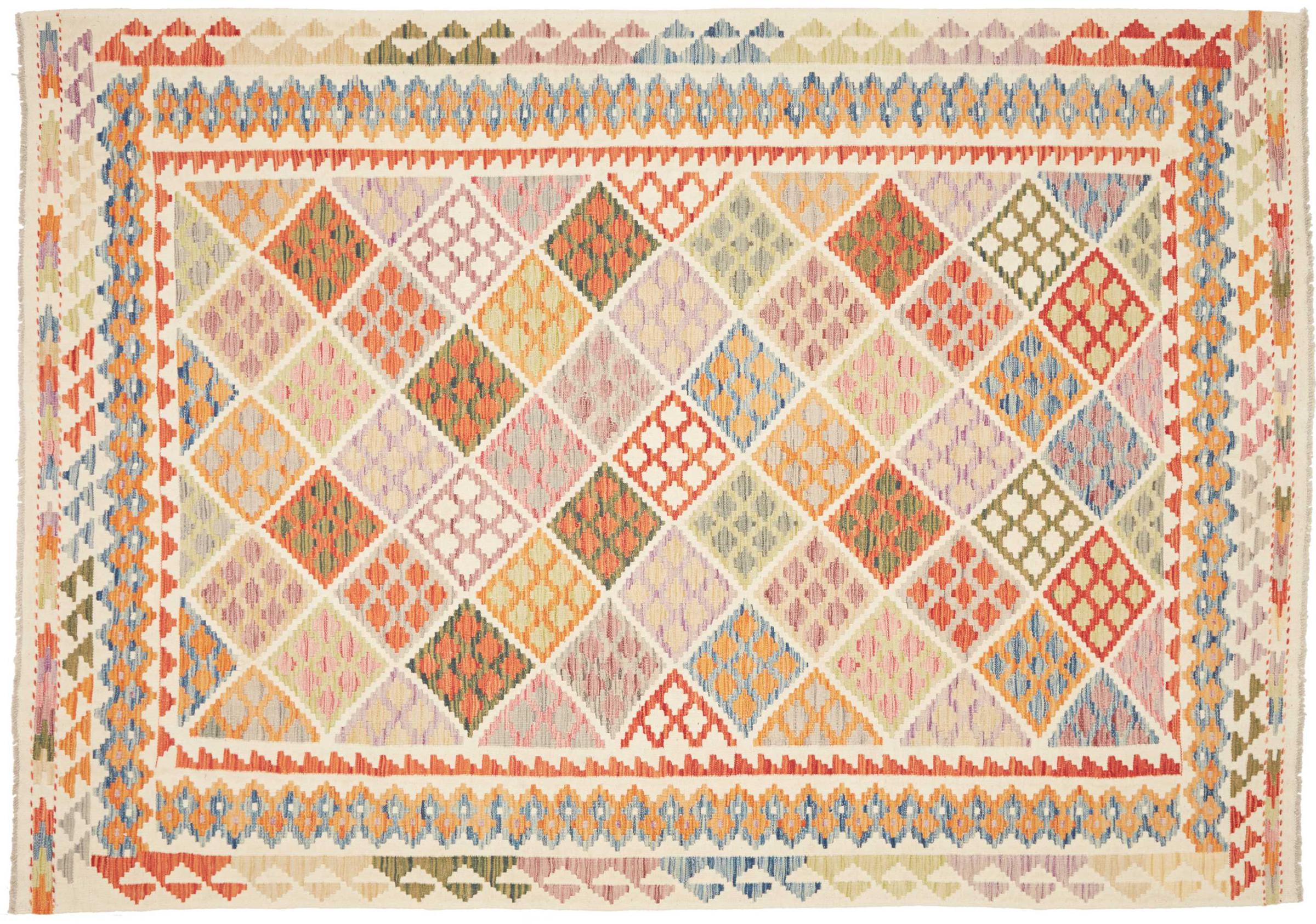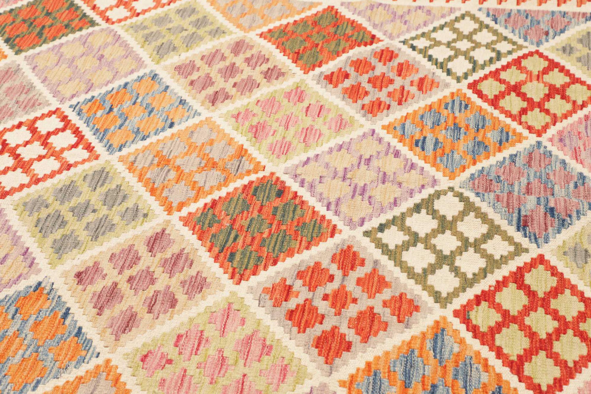 This rug was made as a flat weave by hand on a loom. Flatweave is the term used to describe rugs that have no pile. As the name promises, these rugs are woven and not knotted. This results in a flat rug with a structured surface. Flatweaves are not as soft and usually thinner than knotted rugs. At the same time they are much less complex to manufacture and can usually be laid out from both sides (front and back). Their patterns are usually geometric, which is determined by the fabric.