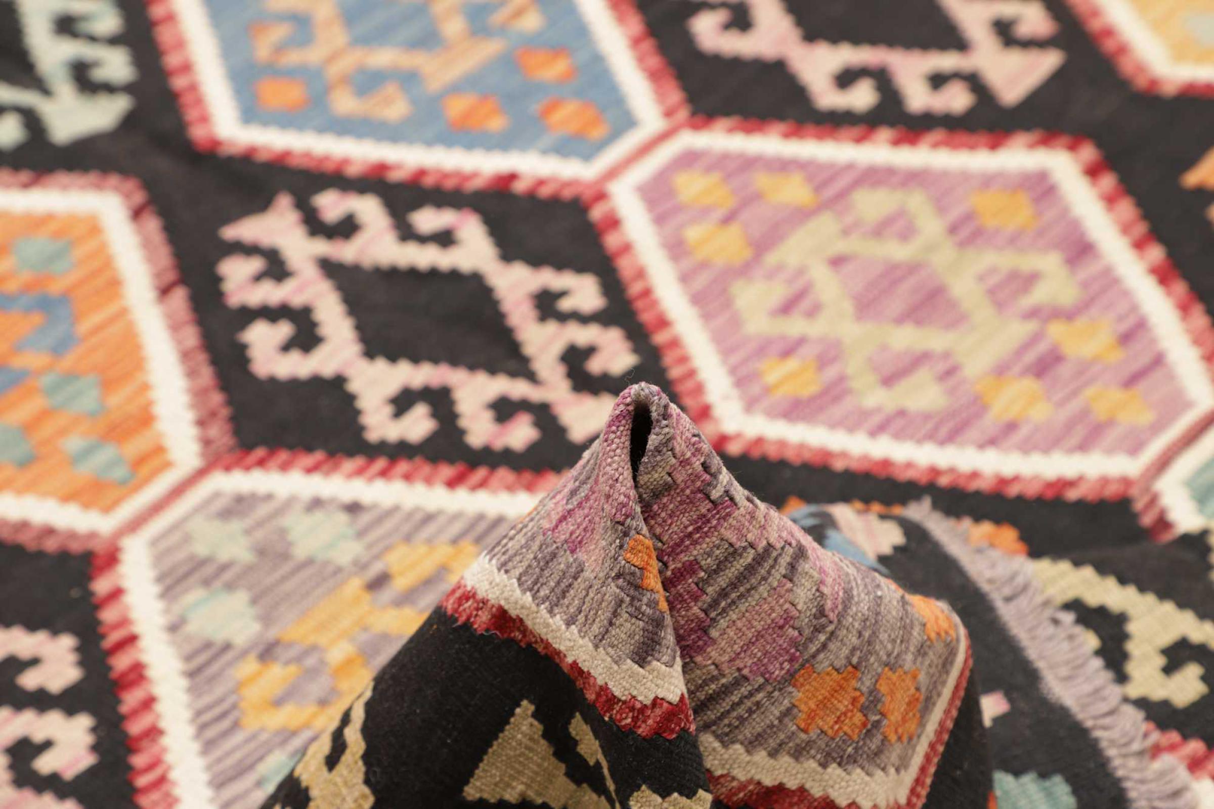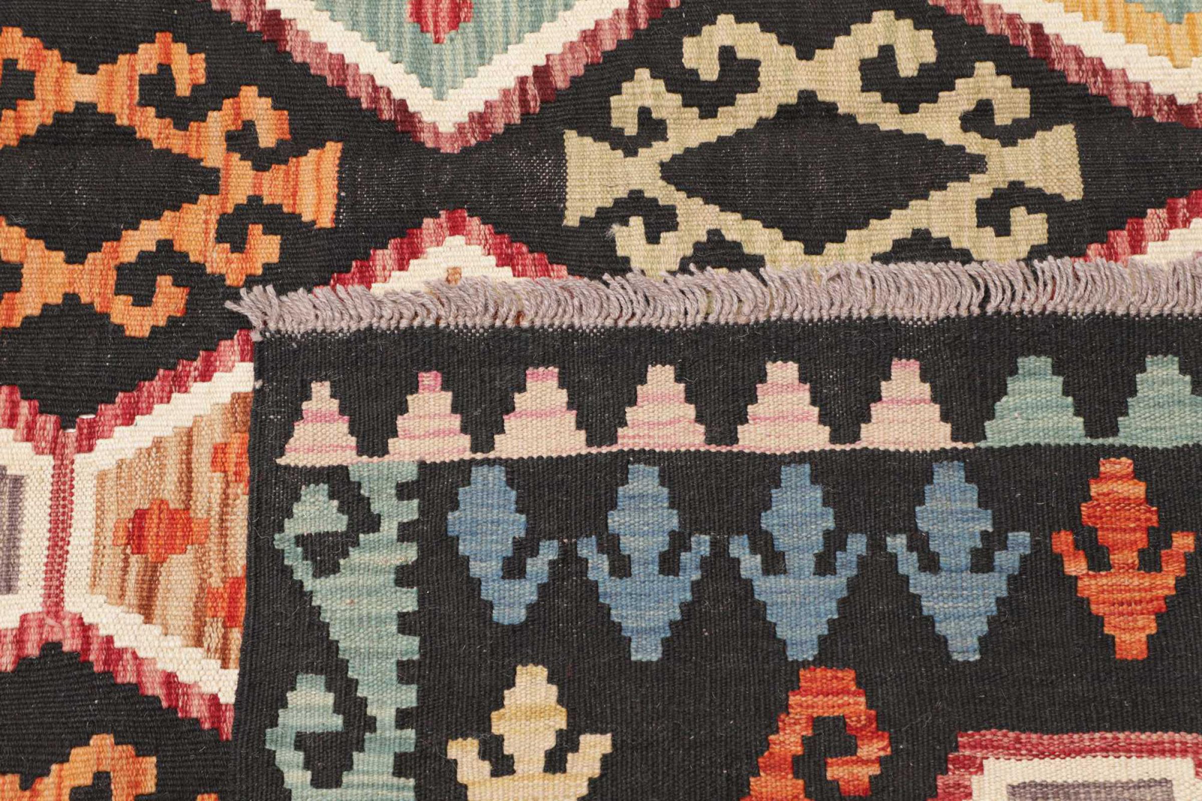 This rug was made as a flat weave by hand on a loom. Flatweave is the term used to describe rugs that have no pile. As the name promises, these rugs are woven and not knotted. This results in a flat rug with a structured surface. Flatweaves are not as soft and usually thinner than knotted rugs. At the same time they are much less complex to manufacture and can usually be laid out from both sides (front and back). Their patterns are usually geometric, which is determined by the fabric.
