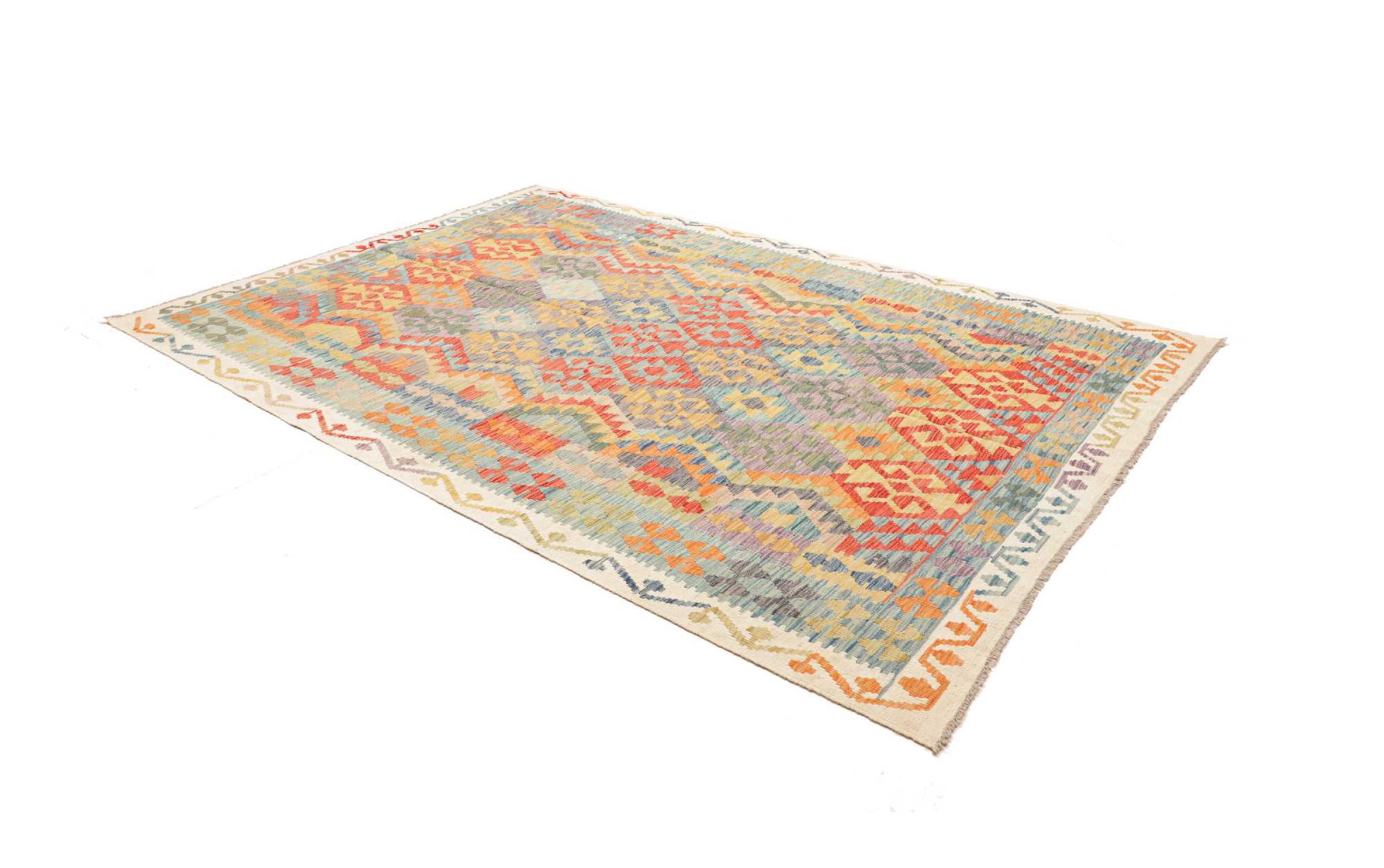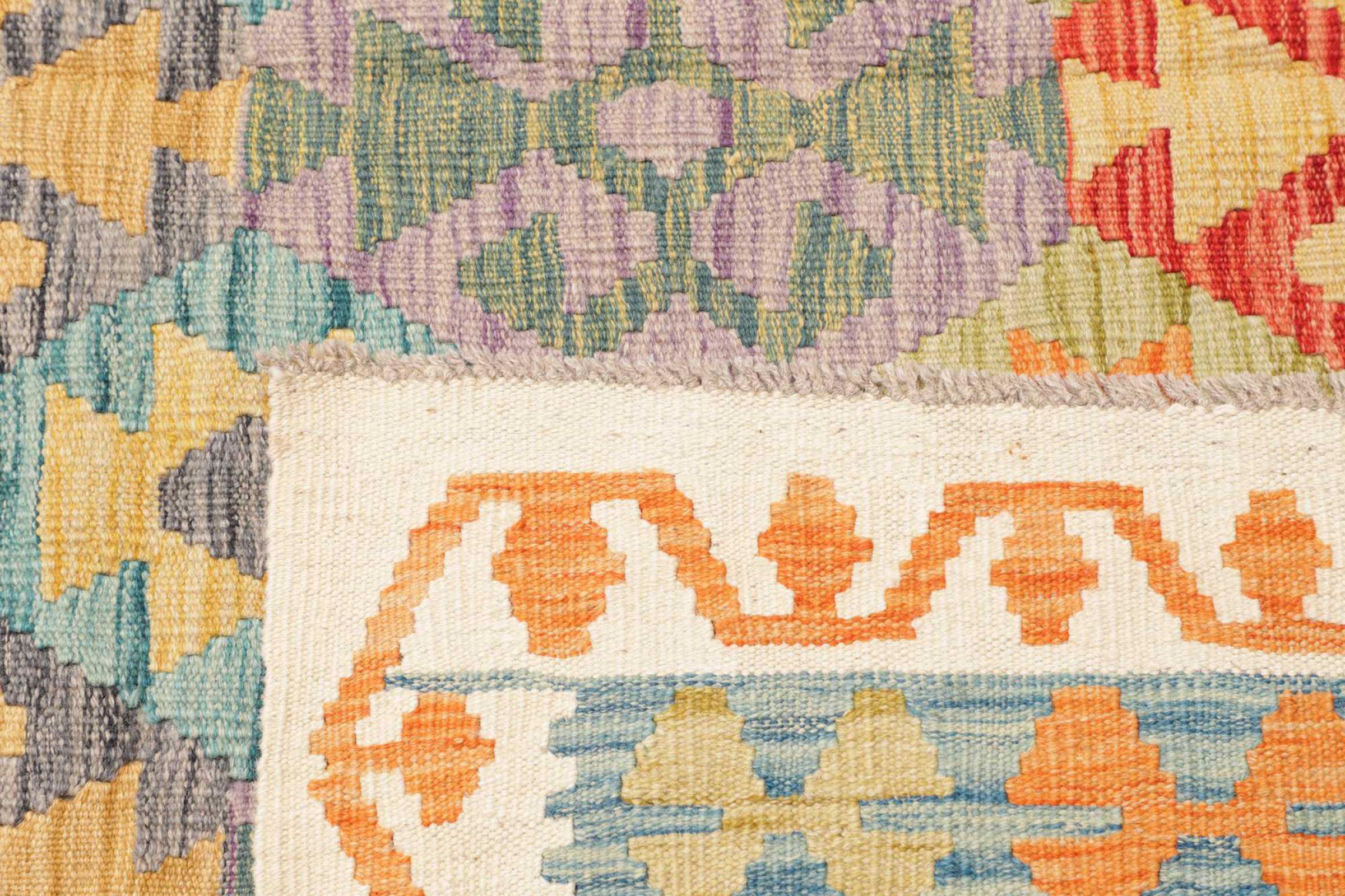 This rug was made as a flat weave by hand on a loom. Flatweave is the term used to describe rugs that have no pile. As the name promises, these rugs are woven and not knotted. This results in a flat rug with a structured surface. Flatweaves are not as soft and usually thinner than knotted rugs. At the same time they are much less complex to manufacture and can usually be laid out from both sides (front and back). Their patterns are usually geometric, which is determined by the fabric.