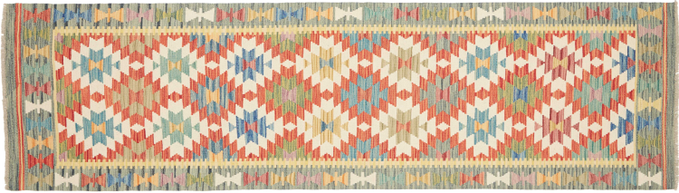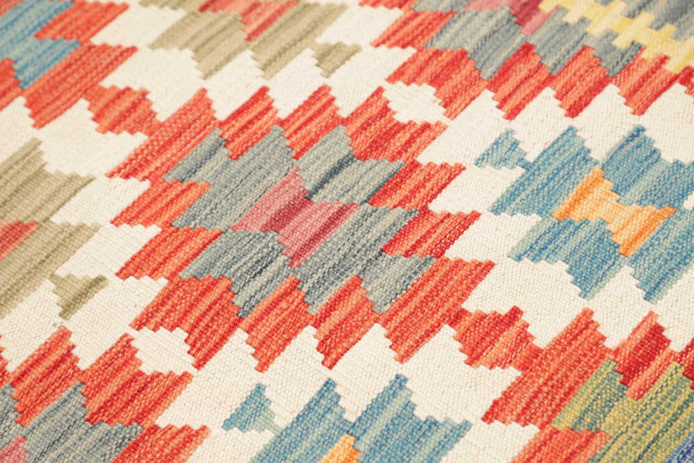 This handwoven Kilim Afghan is a wonderful and unique piece of art. Hard to believe that these modern colours and patterns have already been used centuries ago. This carpet has been woven by hand in old tradition in Afghanistan. It delivers a portion of contemporary history, which you won't find in this specific design a second time. It consists of high-grade natural wool and gives your home a personalised touch.