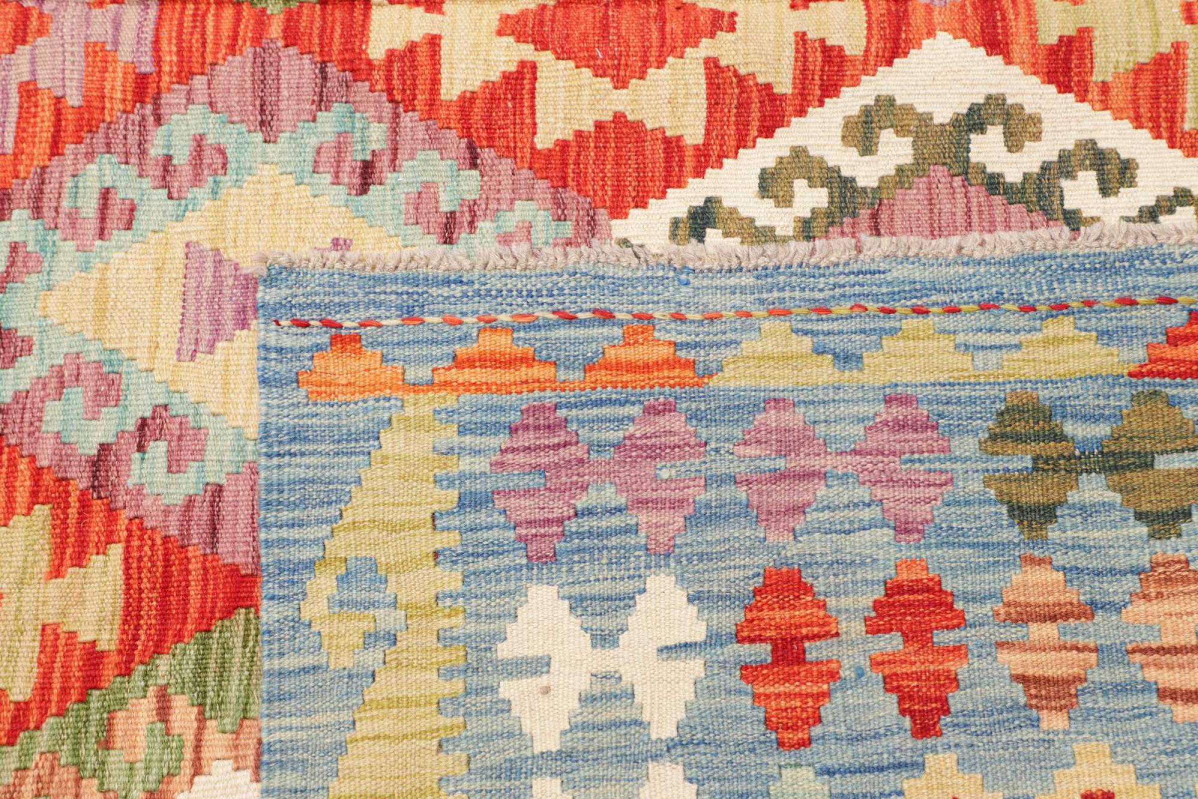 This rug was made as a flat weave by hand on a loom. Flatweave is the term used to describe rugs that have no pile. As the name promises, these rugs are woven and not knotted. This results in a flat rug with a structured surface. Flatweaves are not as soft and usually thinner than knotted rugs. At the same time they are much less complex to manufacture and can usually be laid out from both sides (front and back). Their patterns are usually geometric, which is determined by the fabric.