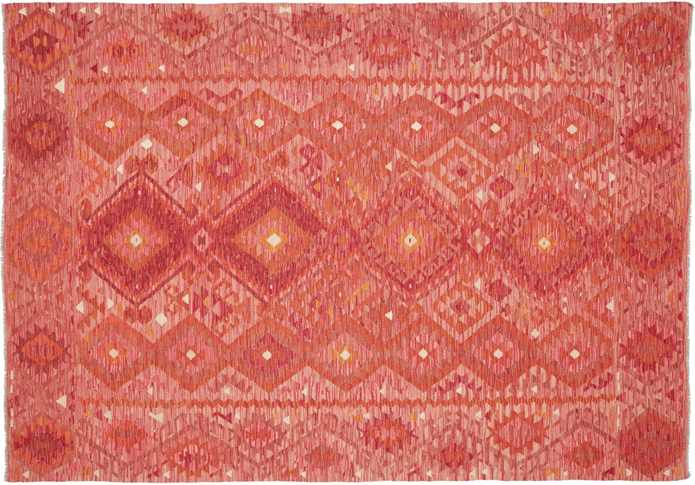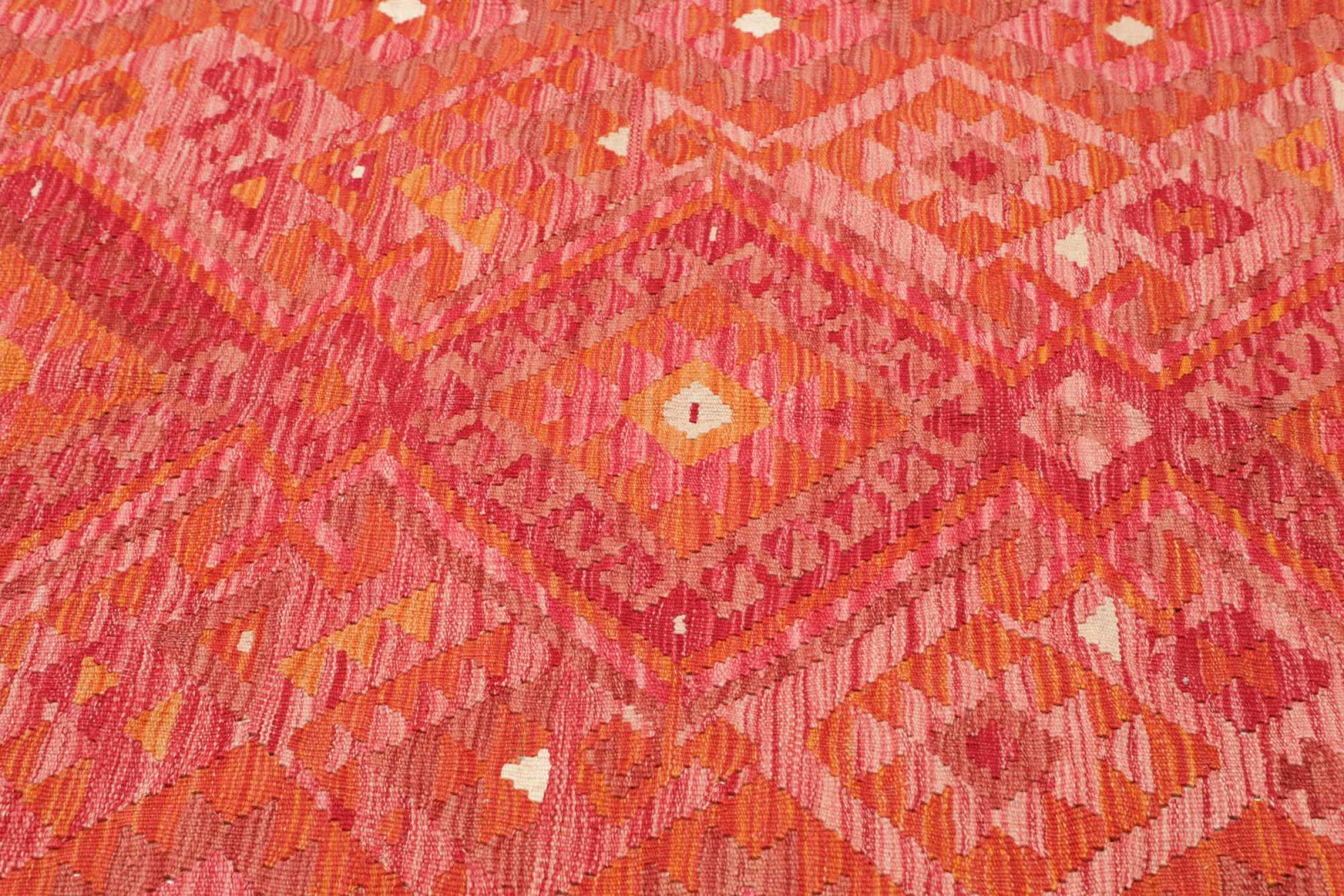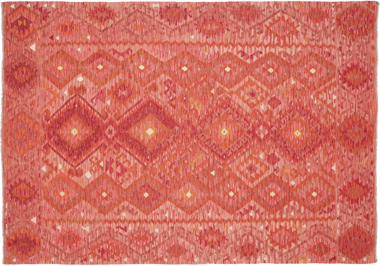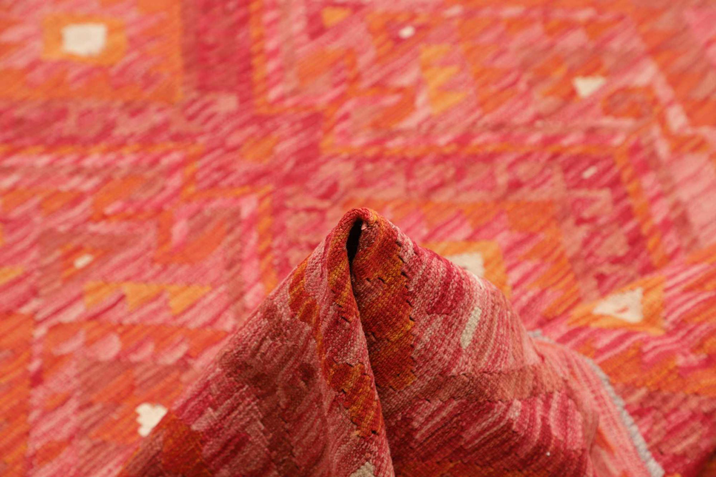This rug was made as a flat weave by hand on a loom. Flatweave is the term used to describe rugs that have no pile. As the name promises, these rugs are woven and not knotted. This results in a flat rug with a structured surface. Flatweaves are not as soft and usually thinner than knotted rugs. At the same time they are much less complex to manufacture and can usually be laid out from both sides (front and back). Their patterns are usually geometric, which is determined by the fabric.