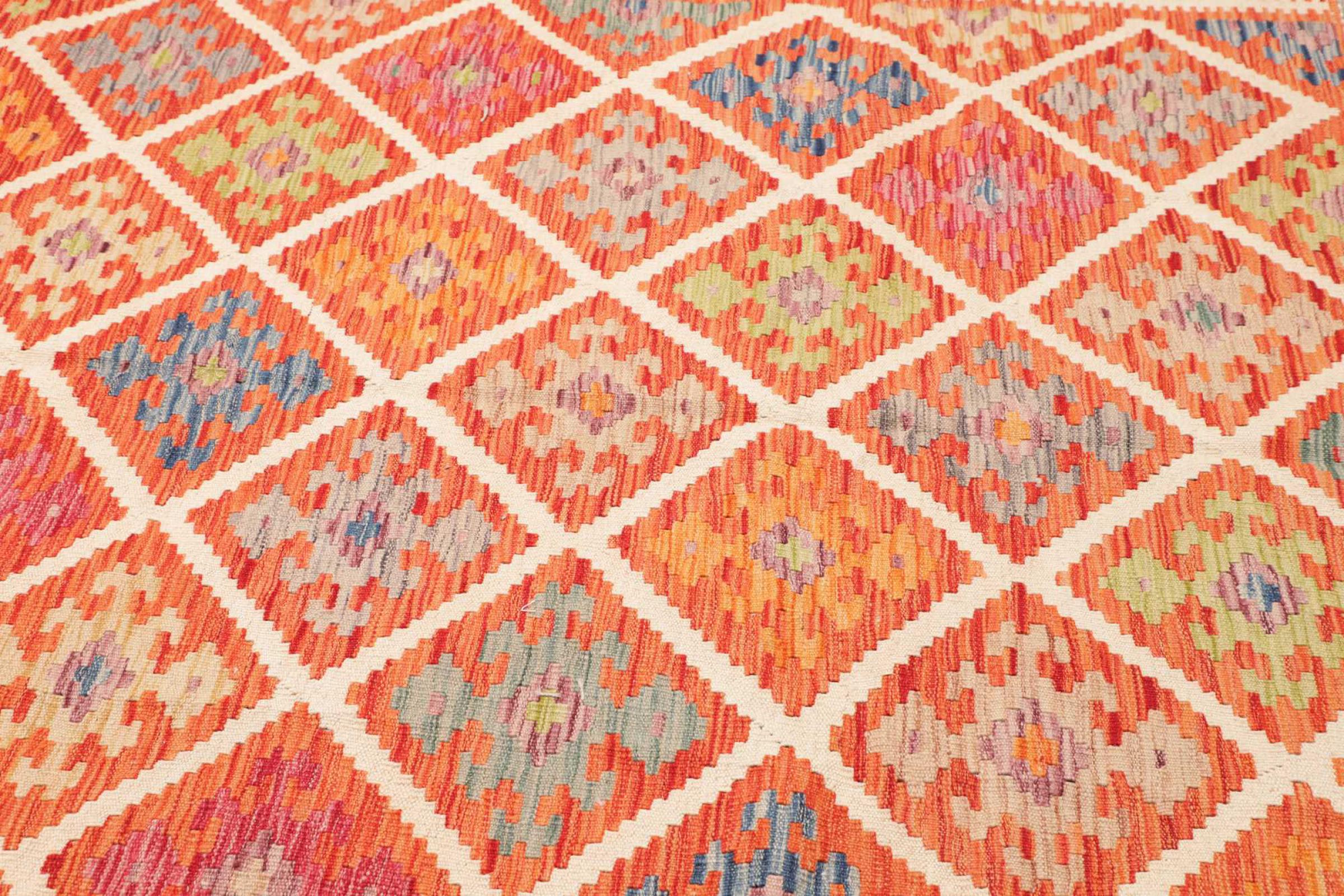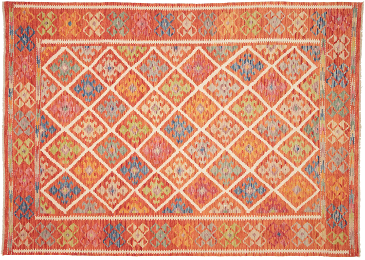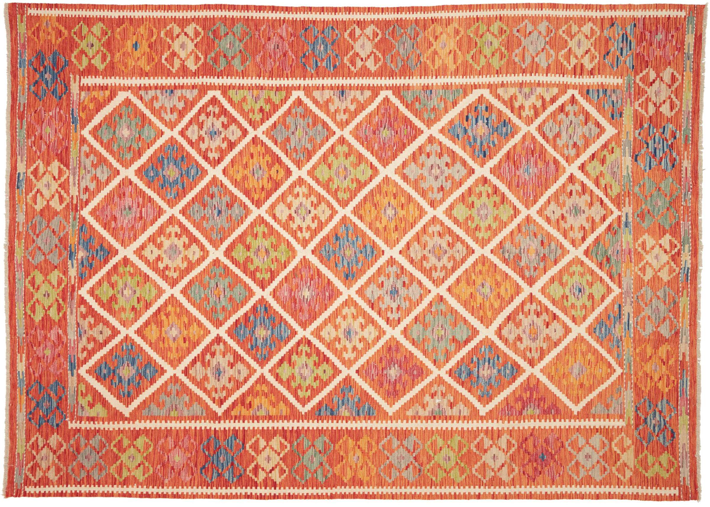 This rug was made as a flat weave by hand on a loom. Flatweave is the term used to describe rugs that have no pile. As the name promises, these rugs are woven and not knotted. This results in a flat rug with a structured surface. Flatweaves are not as soft and usually thinner than knotted rugs. At the same time they are much less complex to manufacture and can usually be laid out from both sides (front and back). Their patterns are usually geometric, which is determined by the fabric.