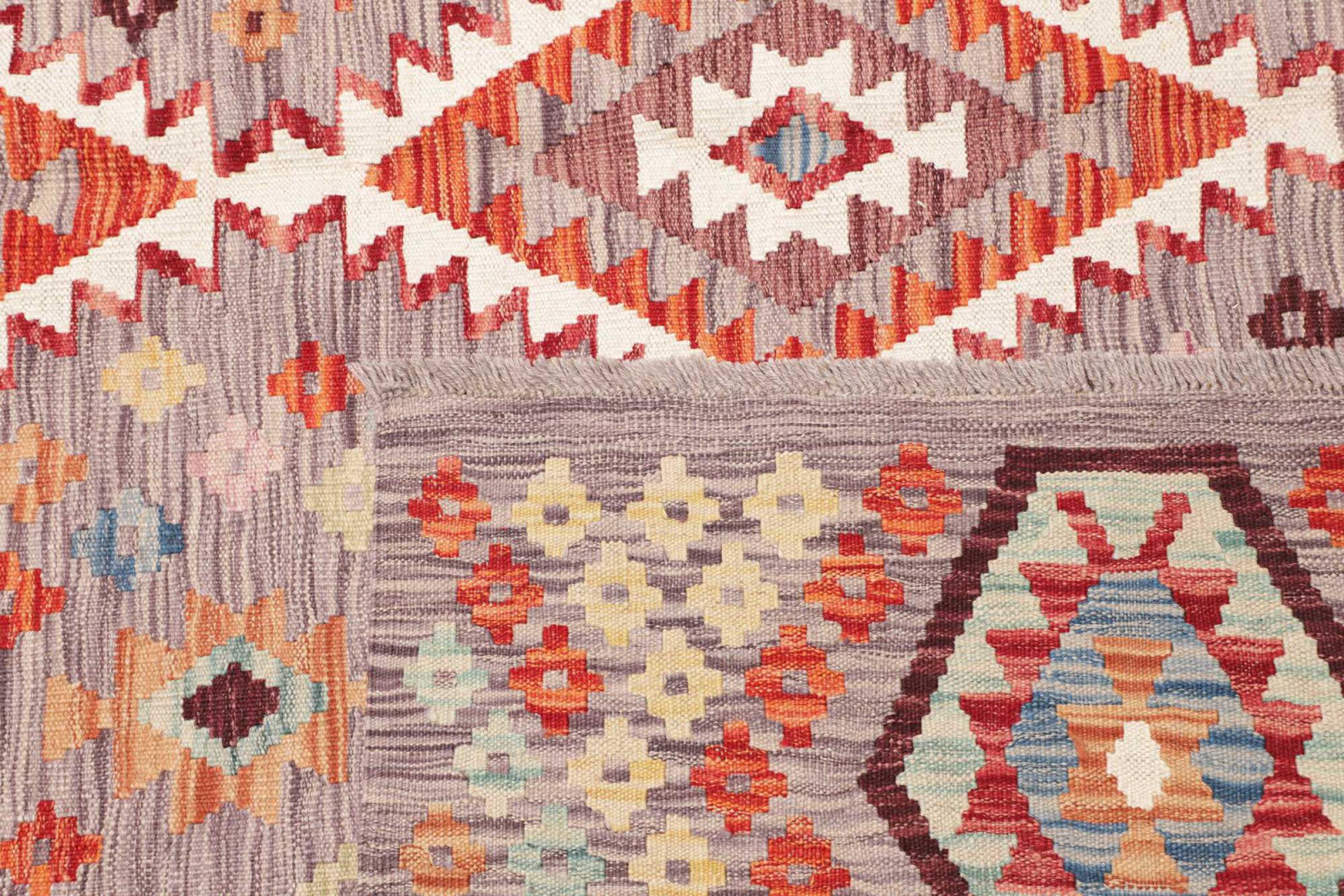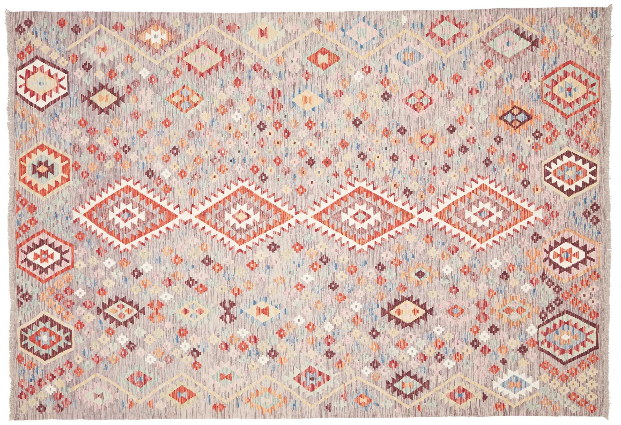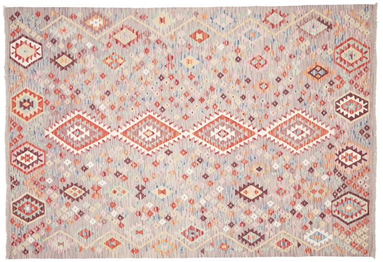 This rug was made as a flat weave by hand on a loom. Flatweave is the term used to describe rugs that have no pile. As the name promises, these rugs are woven and not knotted. This results in a flat rug with a structured surface. Flatweaves are not as soft and usually thinner than knotted rugs. At the same time they are much less complex to manufacture and can usually be laid out from both sides (front and back). Their patterns are usually geometric, which is determined by the fabric.