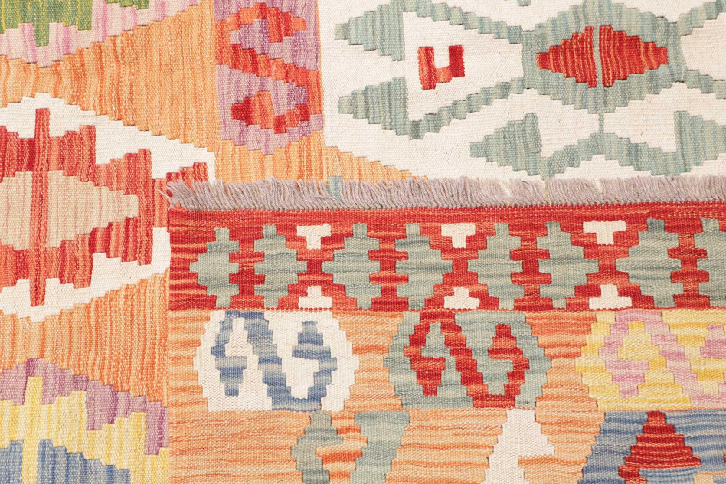 This rug was made as a flat weave by hand on a loom. Flatweave is the term used to describe rugs that have no pile. As the name promises, these rugs are woven and not knotted. This results in a flat rug with a structured surface. Flatweaves are not as soft and usually thinner than knotted rugs. At the same time they are much less complex to manufacture and can usually be laid out from both sides (front and back). Their patterns are usually geometric, which is determined by the fabric.