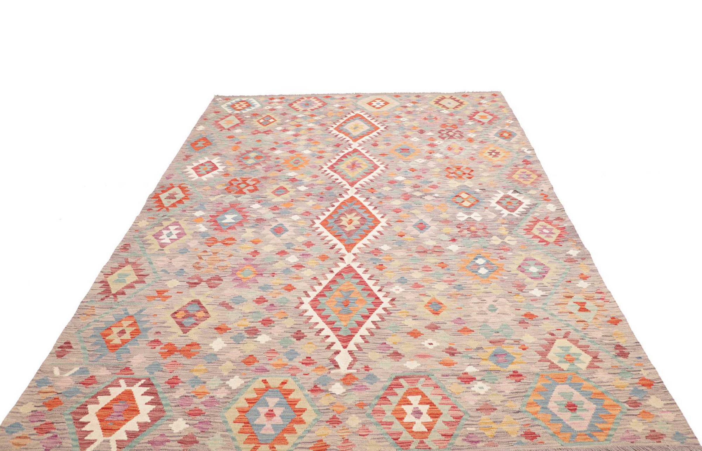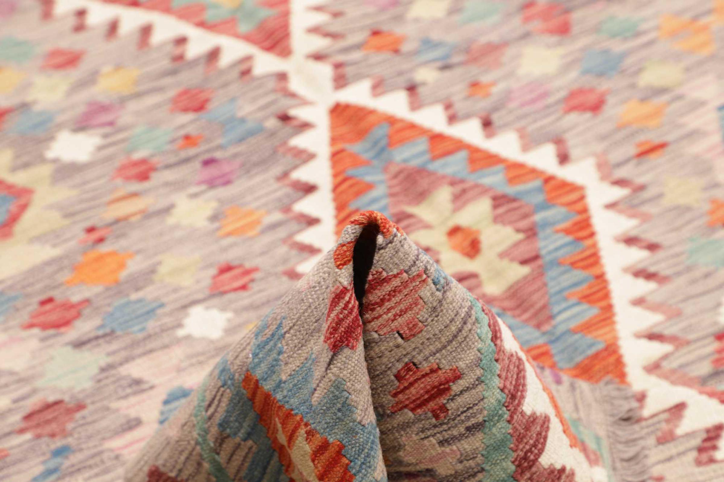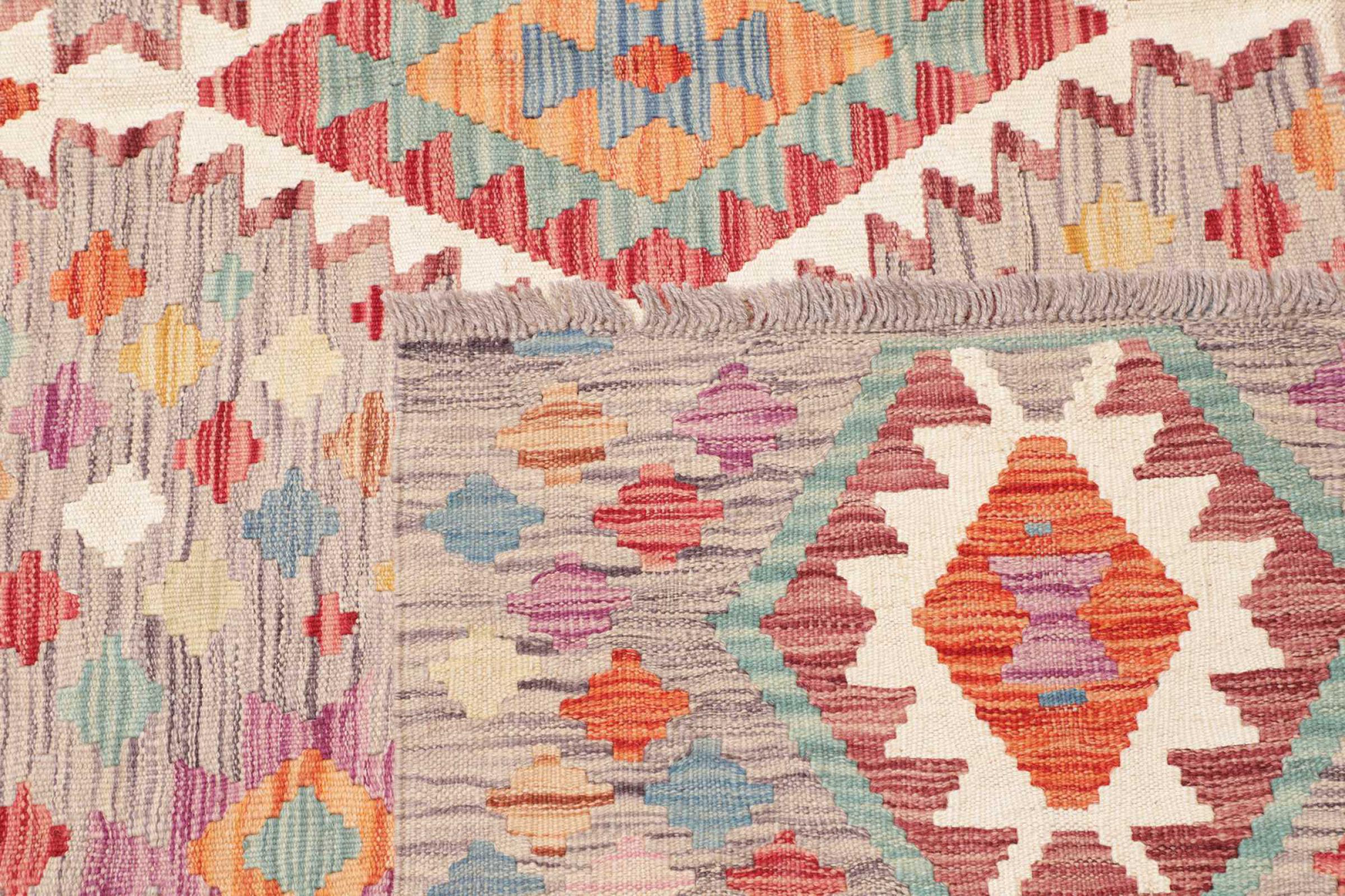 This rug was made as a flat weave by hand on a loom. Flatweave is the term used to describe rugs that have no pile. As the name promises, these rugs are woven and not knotted. This results in a flat rug with a structured surface. Flatweaves are not as soft and usually thinner than knotted rugs. At the same time they are much less complex to manufacture and can usually be laid out from both sides (front and back). Their patterns are usually geometric, which is determined by the fabric.