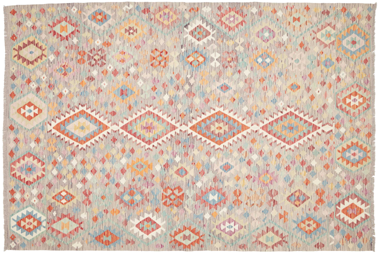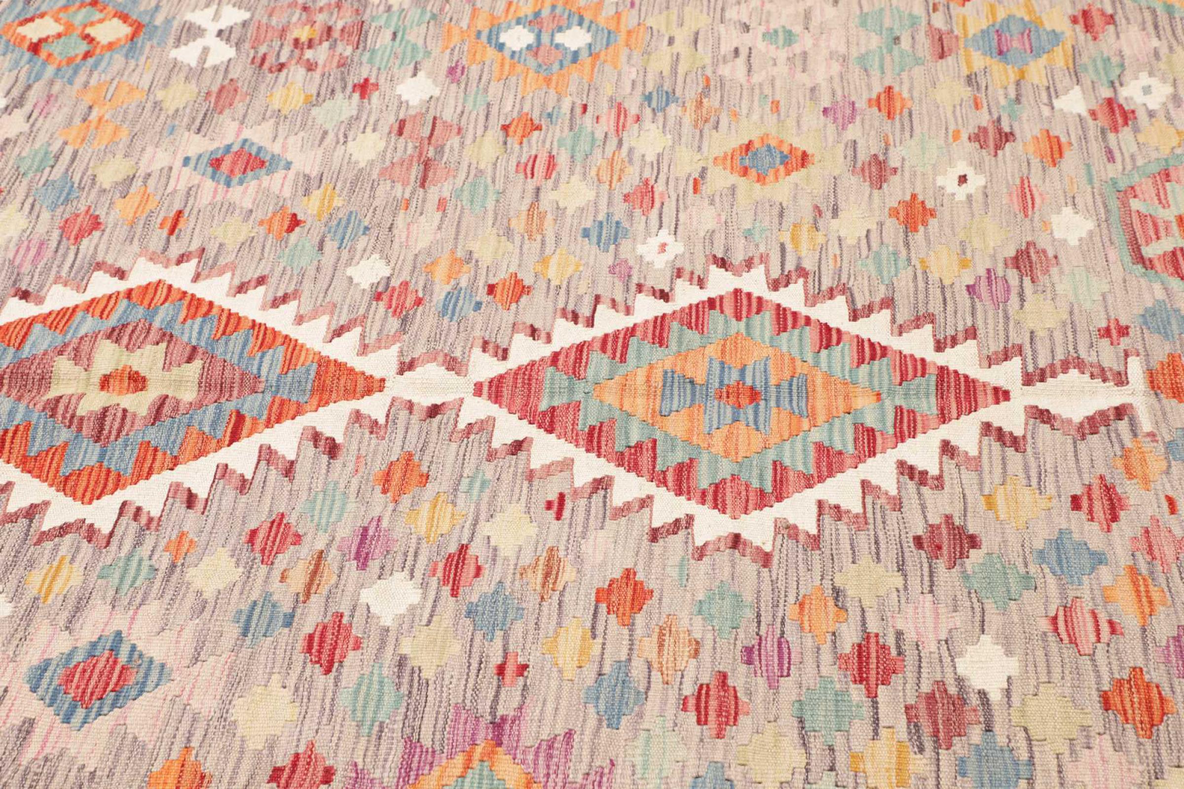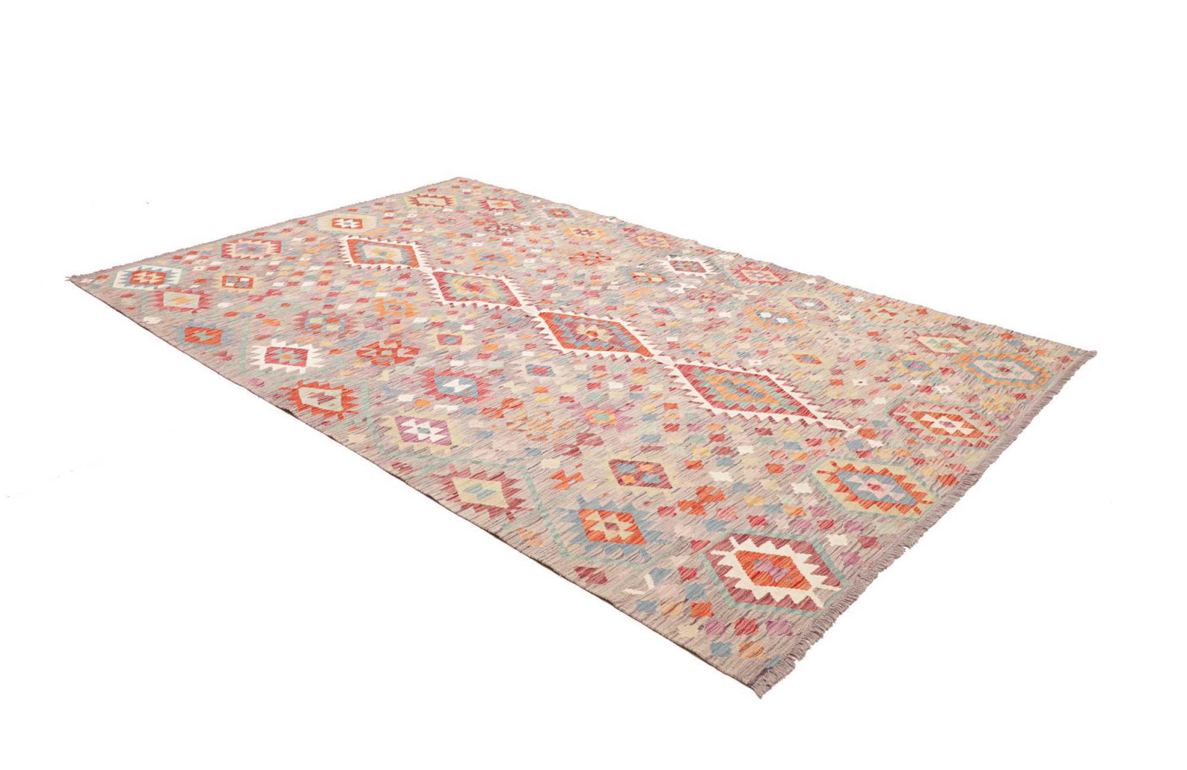 This rug was made as a flat weave by hand on a loom. Flatweave is the term used to describe rugs that have no pile. As the name promises, these rugs are woven and not knotted. This results in a flat rug with a structured surface. Flatweaves are not as soft and usually thinner than knotted rugs. At the same time they are much less complex to manufacture and can usually be laid out from both sides (front and back). Their patterns are usually geometric, which is determined by the fabric.