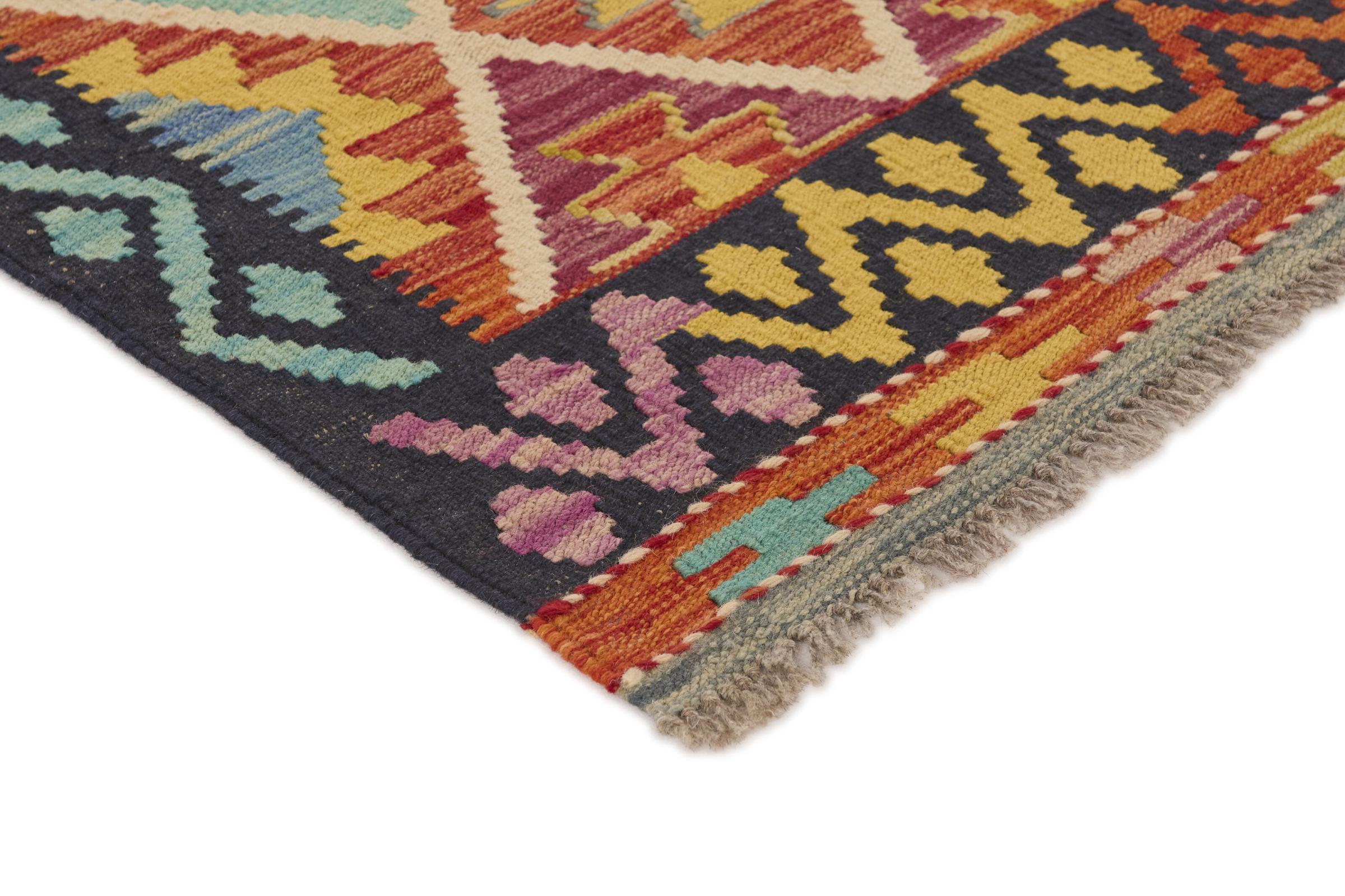 This handwoven Kilim Afghan is a wonderful and unique piece of art. Hard to believe that these modern colours and patterns have already been used centuries ago. This carpet has been woven by hand in old tradition in Afghanistan. It delivers a portion of contemporary history, which you won't find in this specific design a second time. It consists of high-grade natural wool and gives your home a personalised touch.