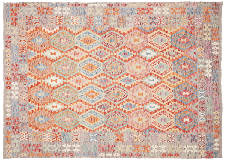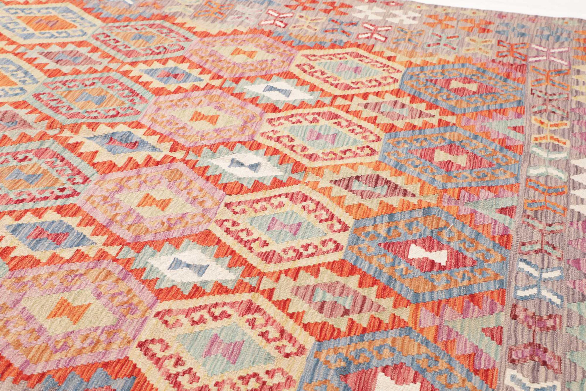 This rug was made as a flat weave by hand on a loom. Flatweave is the term used to describe rugs that have no pile. As the name promises, these rugs are woven and not knotted. This results in a flat rug with a structured surface. Flatweaves are not as soft and usually thinner than knotted rugs. At the same time they are much less complex to manufacture and can usually be laid out from both sides (front and back). Their patterns are usually geometric, which is determined by the fabric.