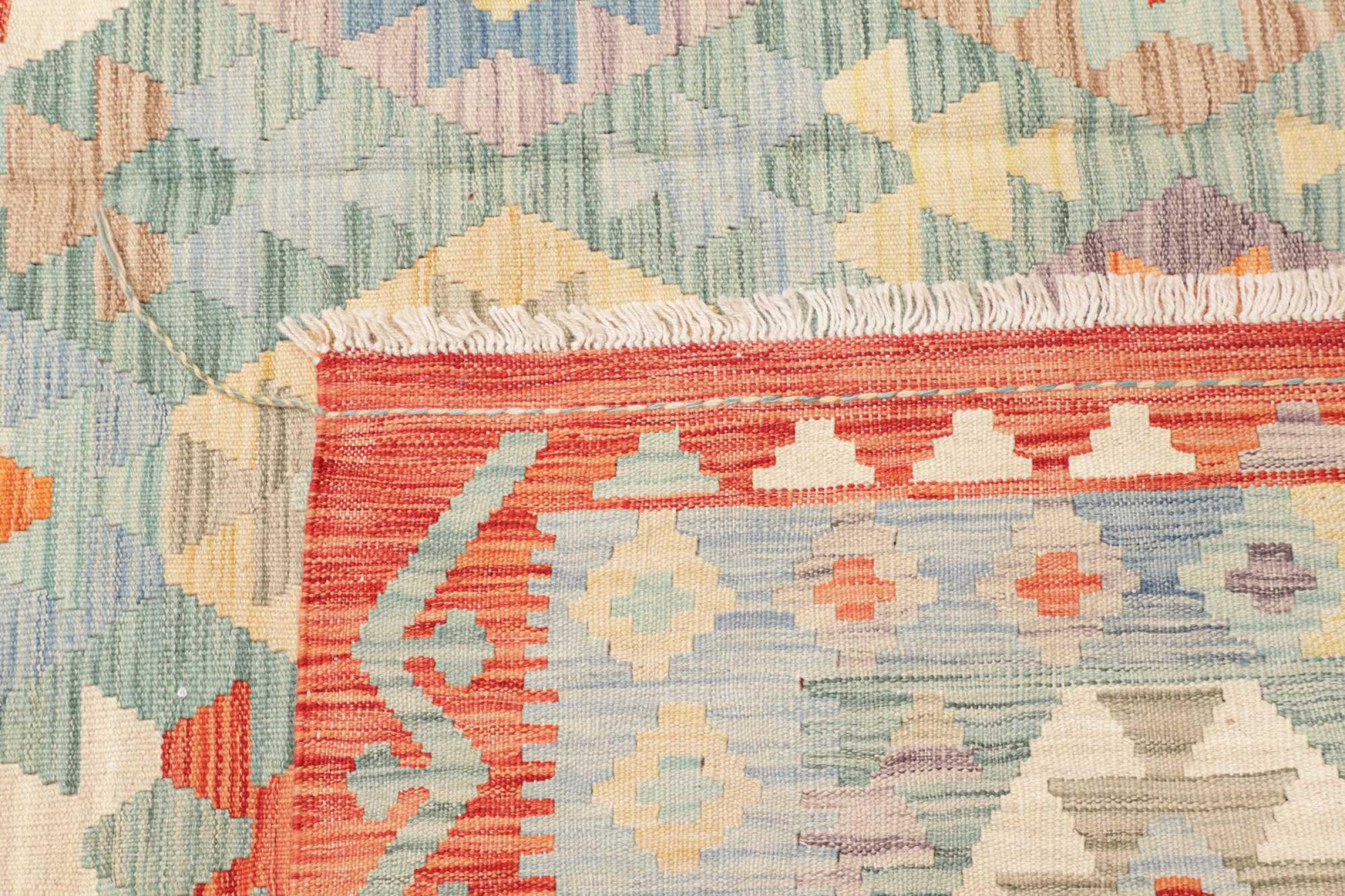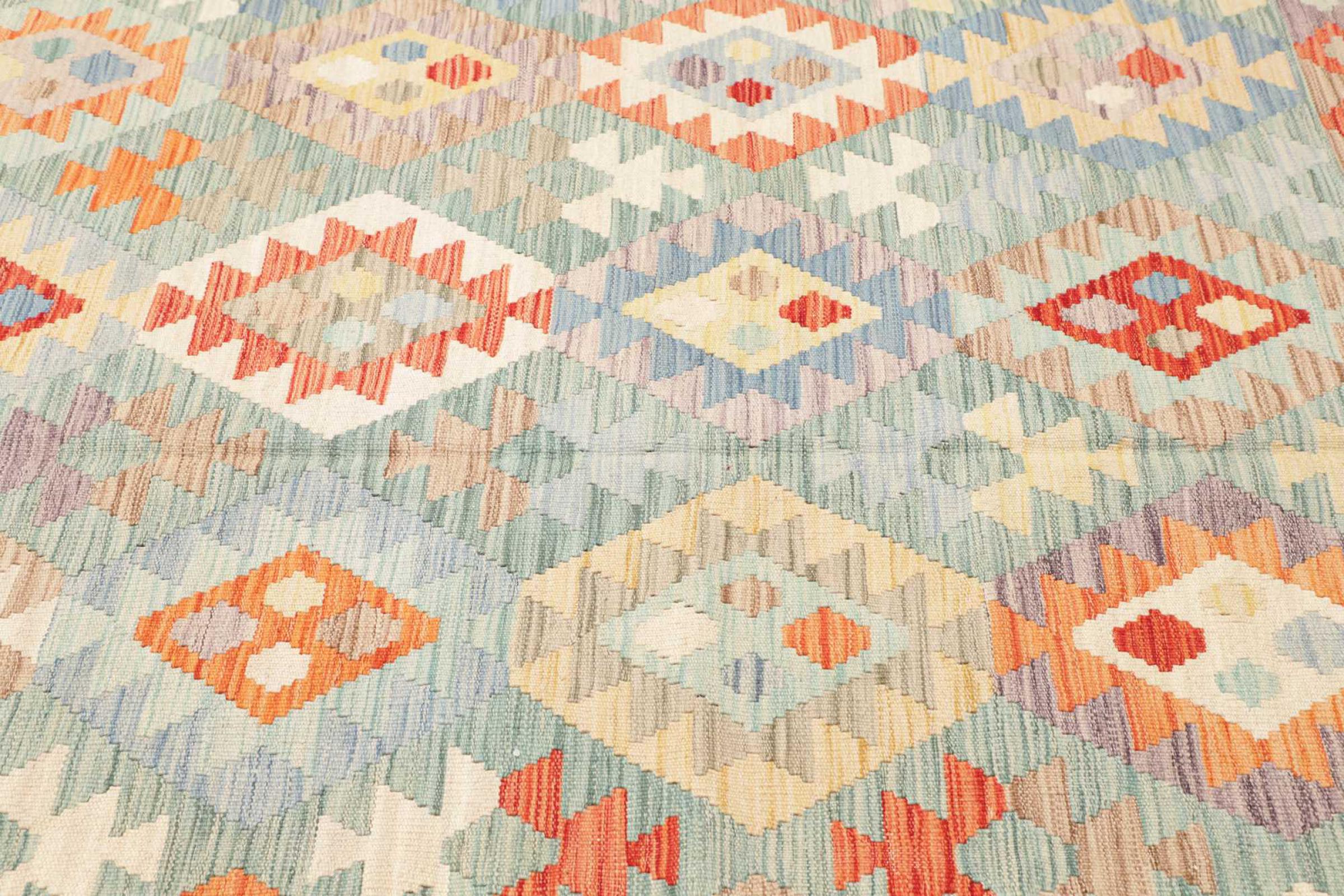 This rug was made as a flat weave by hand on a loom. Flatweave is the term used to describe rugs that have no pile. As the name promises, these rugs are woven and not knotted. This results in a flat rug with a structured surface. Flatweaves are not as soft and usually thinner than knotted rugs. At the same time they are much less complex to manufacture and can usually be laid out from both sides (front and back). Their patterns are usually geometric, which is determined by the fabric.