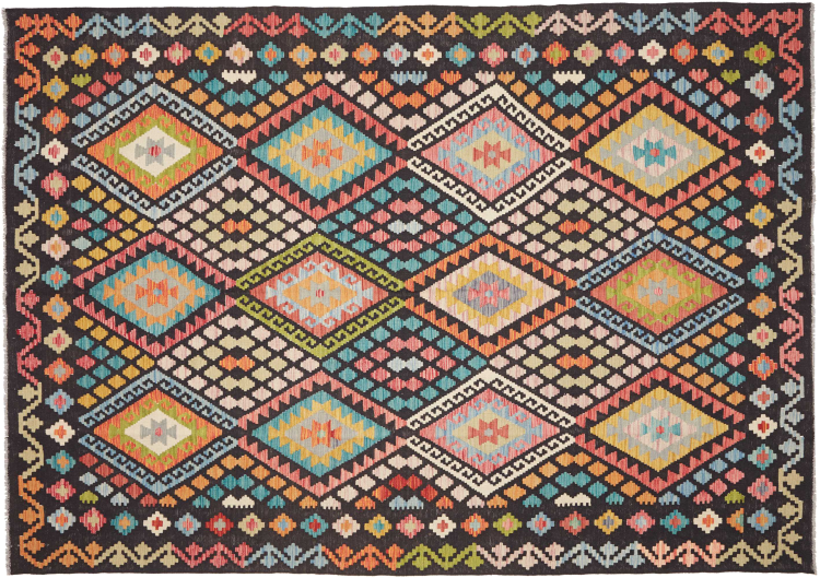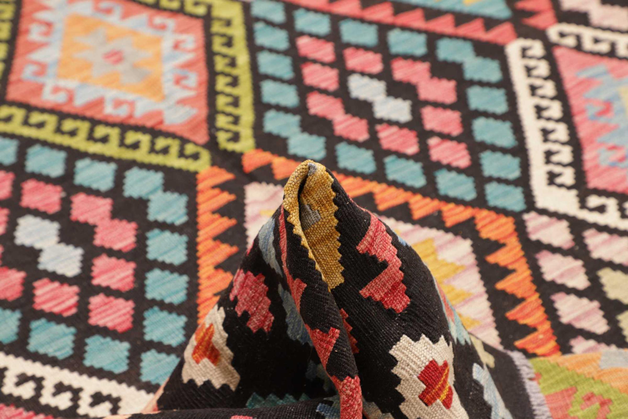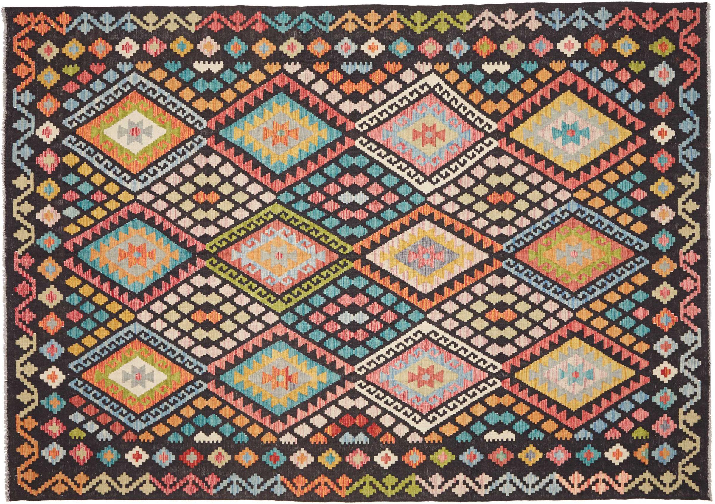 This rug was made as a flat weave by hand on a loom. Flatweave is the term used to describe rugs that have no pile. As the name promises, these rugs are woven and not knotted. This results in a flat rug with a structured surface. Flatweaves are not as soft and usually thinner than knotted rugs. At the same time they are much less complex to manufacture and can usually be laid out from both sides (front and back). Their patterns are usually geometric, which is determined by the fabric.