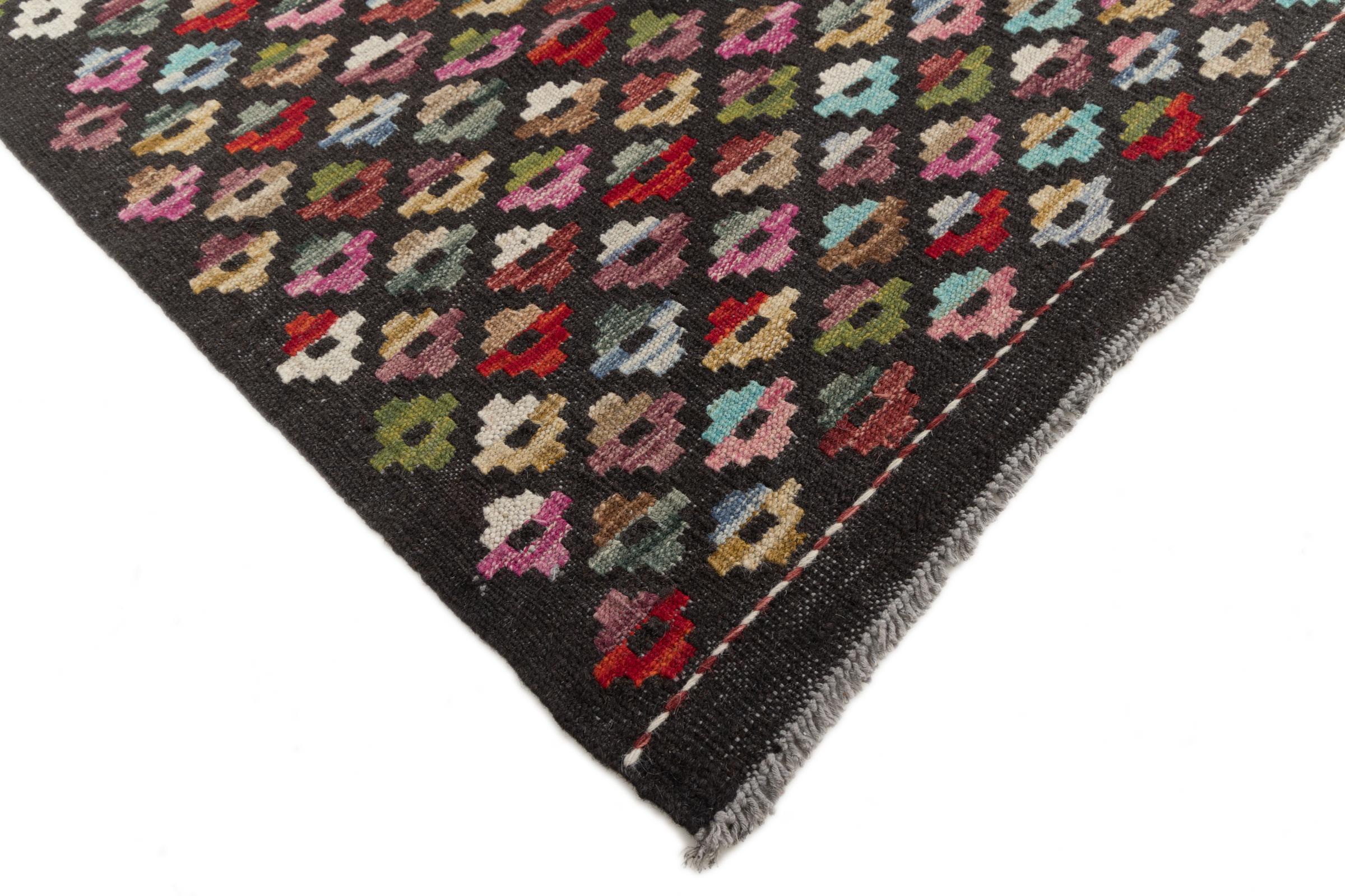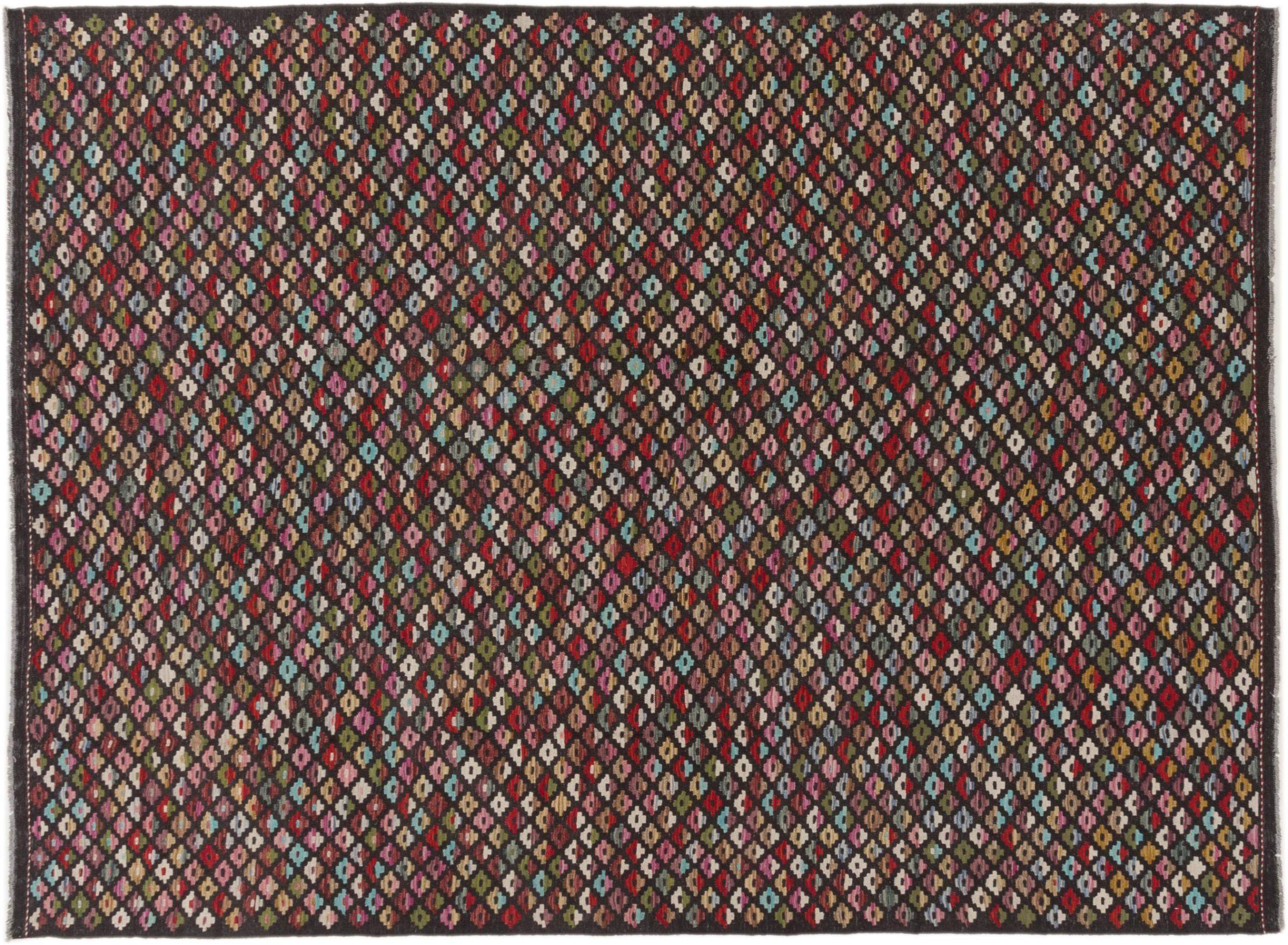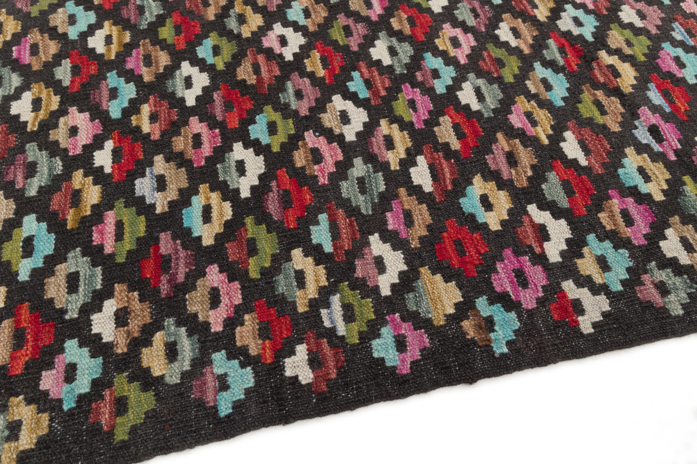 This handwoven Kilim Afghan is a wonderful and unique piece of art. Hard to believe that these modern colours and patterns have already been used centuries ago. This carpet has been woven by hand in old tradition in Afghanistan. It delivers a portion of contemporary history, which you won't find in this specific design a second time. It consists of high-grade natural wool and gives your home a personalised touch.