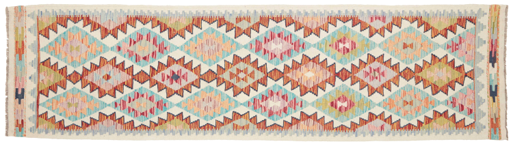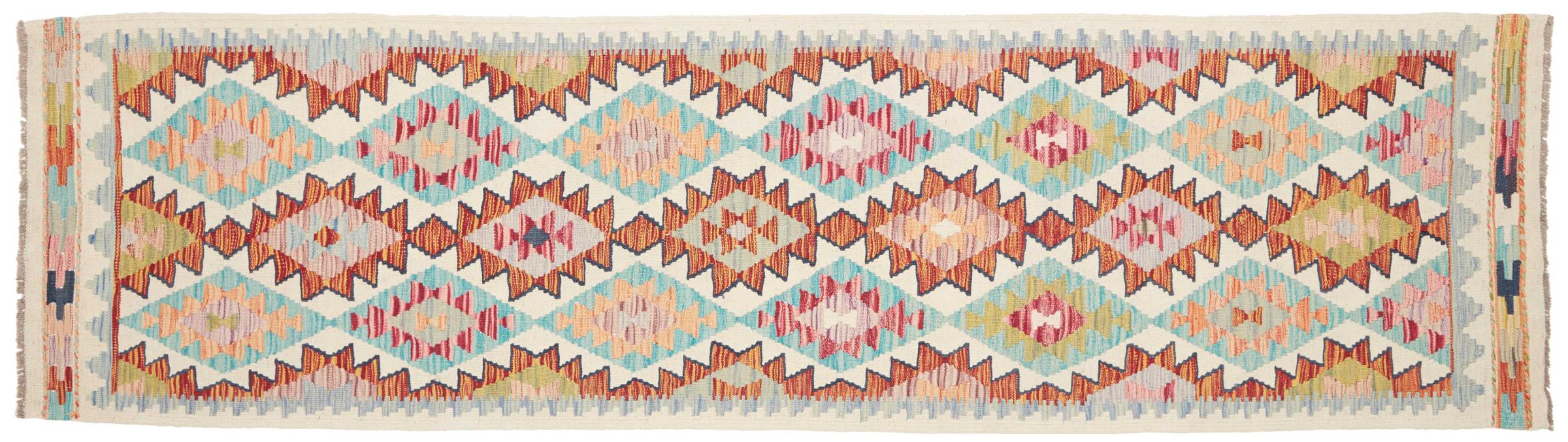 This handwoven Kilim Afghan is a wonderful and unique piece of art. Hard to believe that these modern colours and patterns have already been used centuries ago. This carpet has been woven by hand in old tradition in Afghanistan. It delivers a portion of contemporary history, which you won't find in this specific design a second time. It consists of high-grade natural wool and gives your home a personalised touch.