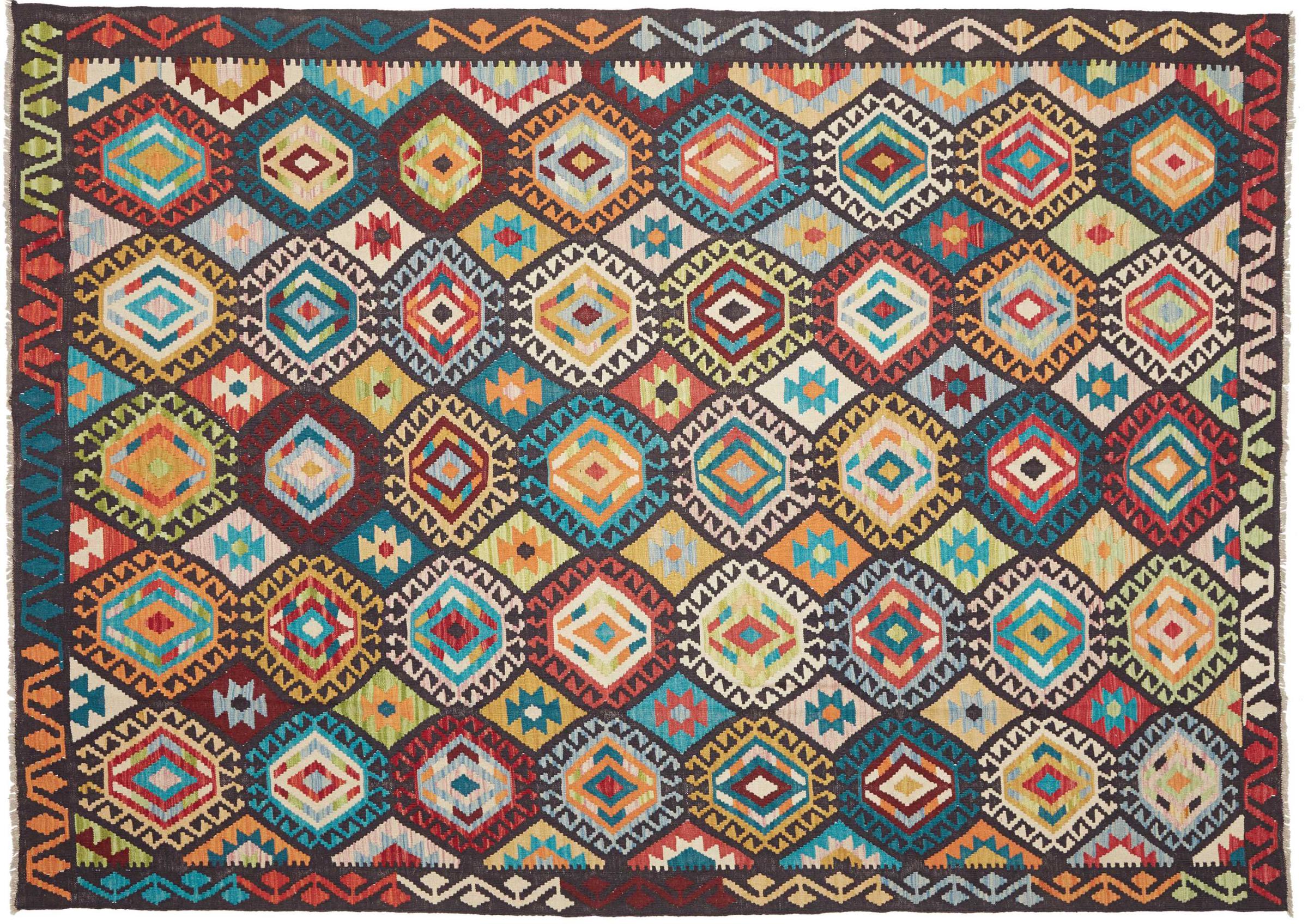 This handwoven Kilim Afghan is a wonderful and unique piece of art. Hard to believe that these modern colours and patterns have already been used centuries ago. This carpet has been woven by hand in old tradition in Afghanistan. It delivers a portion of contemporary history, which you won't find in this specific design a second time. It consists of high-grade natural wool and gives your home a personalised touch.