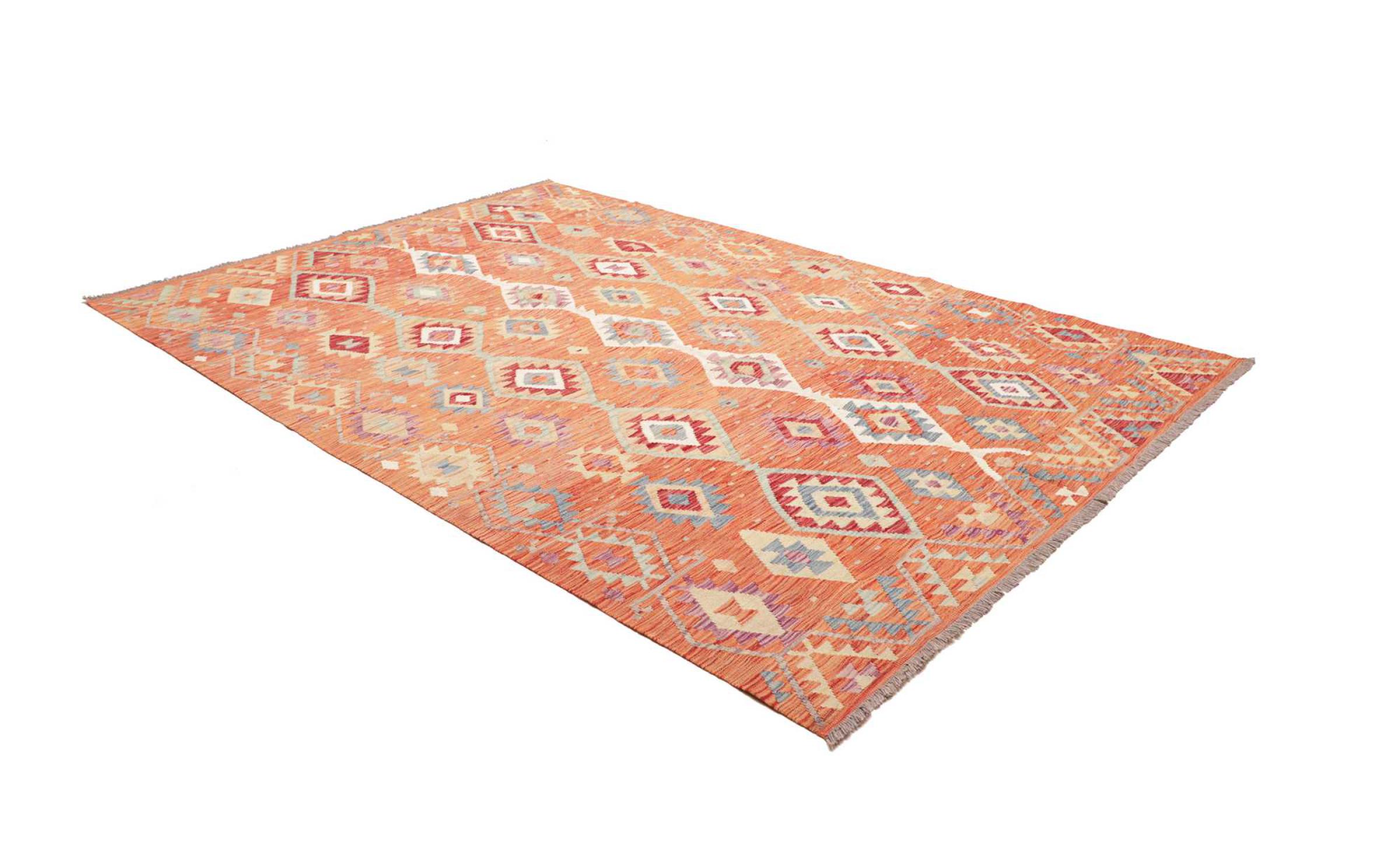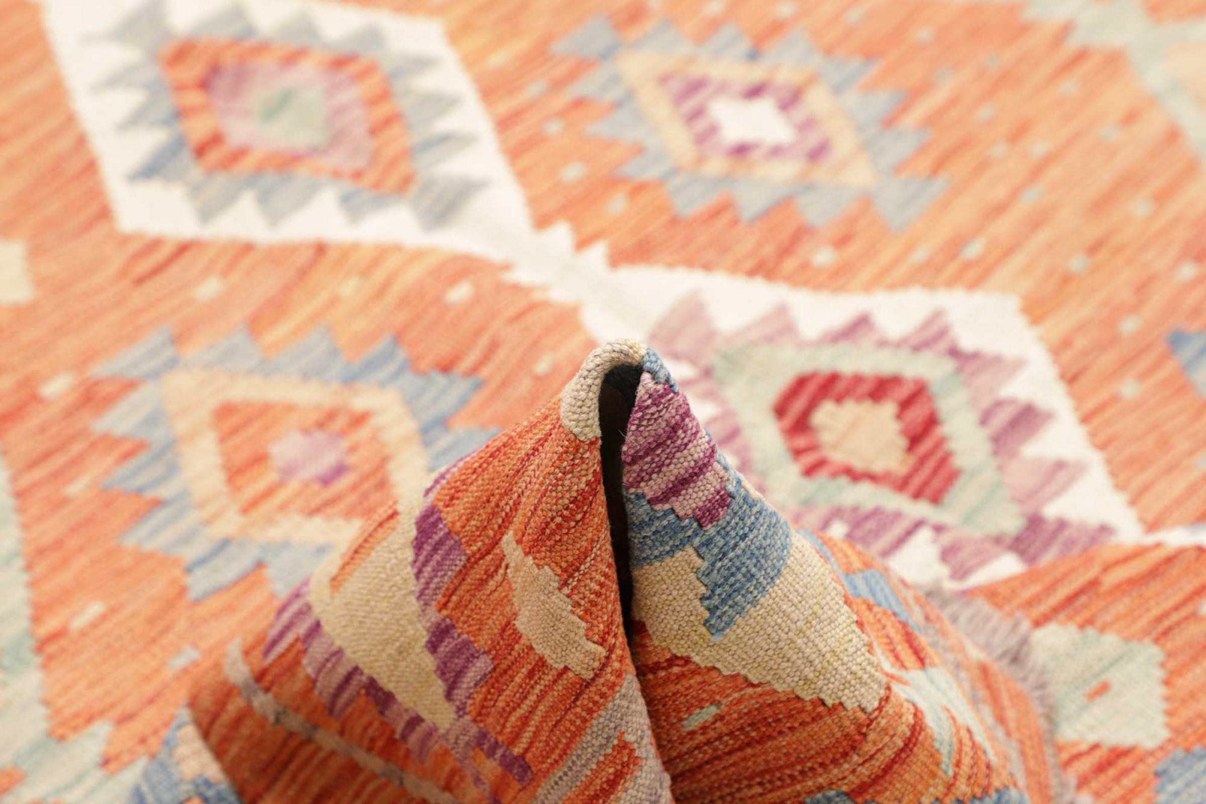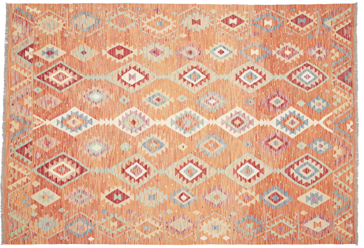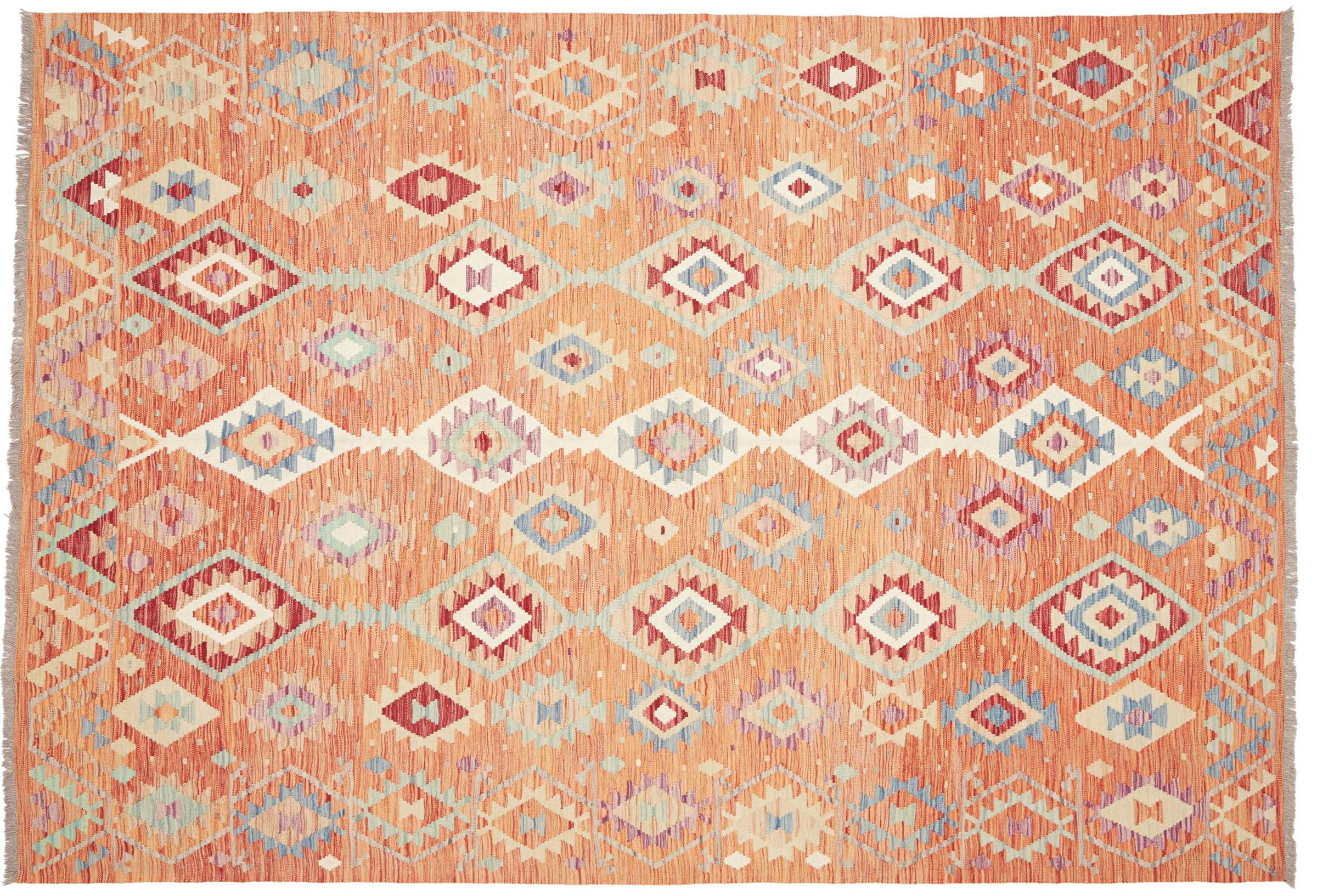 This rug was made as a flat weave by hand on a loom. Flatweave is the term used to describe rugs that have no pile. As the name promises, these rugs are woven and not knotted. This results in a flat rug with a structured surface. Flatweaves are not as soft and usually thinner than knotted rugs. At the same time they are much less complex to manufacture and can usually be laid out from both sides (front and back). Their patterns are usually geometric, which is determined by the fabric.