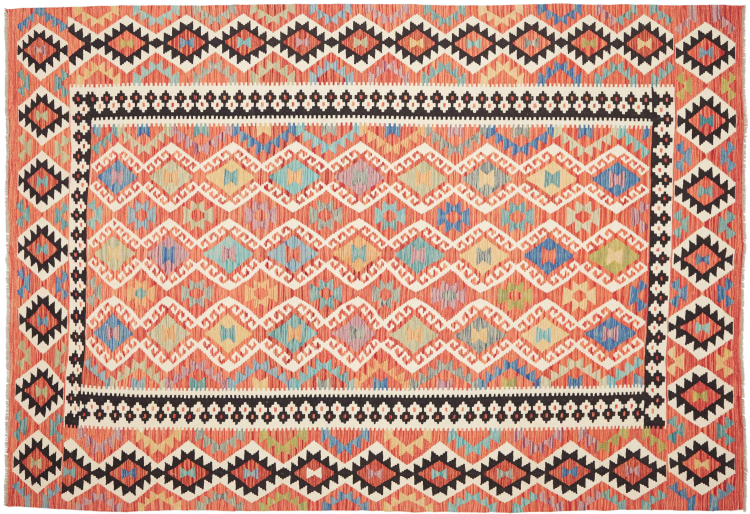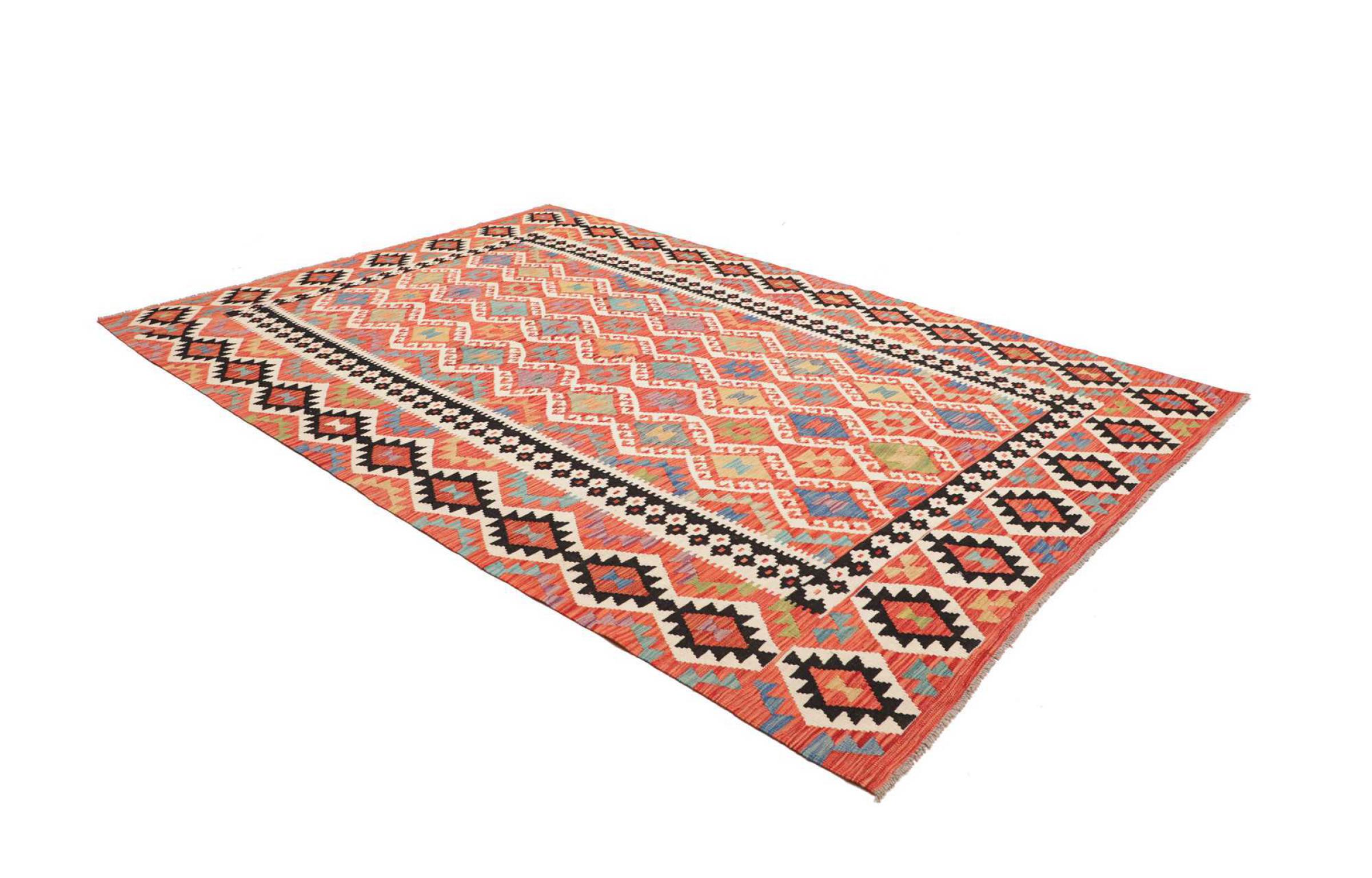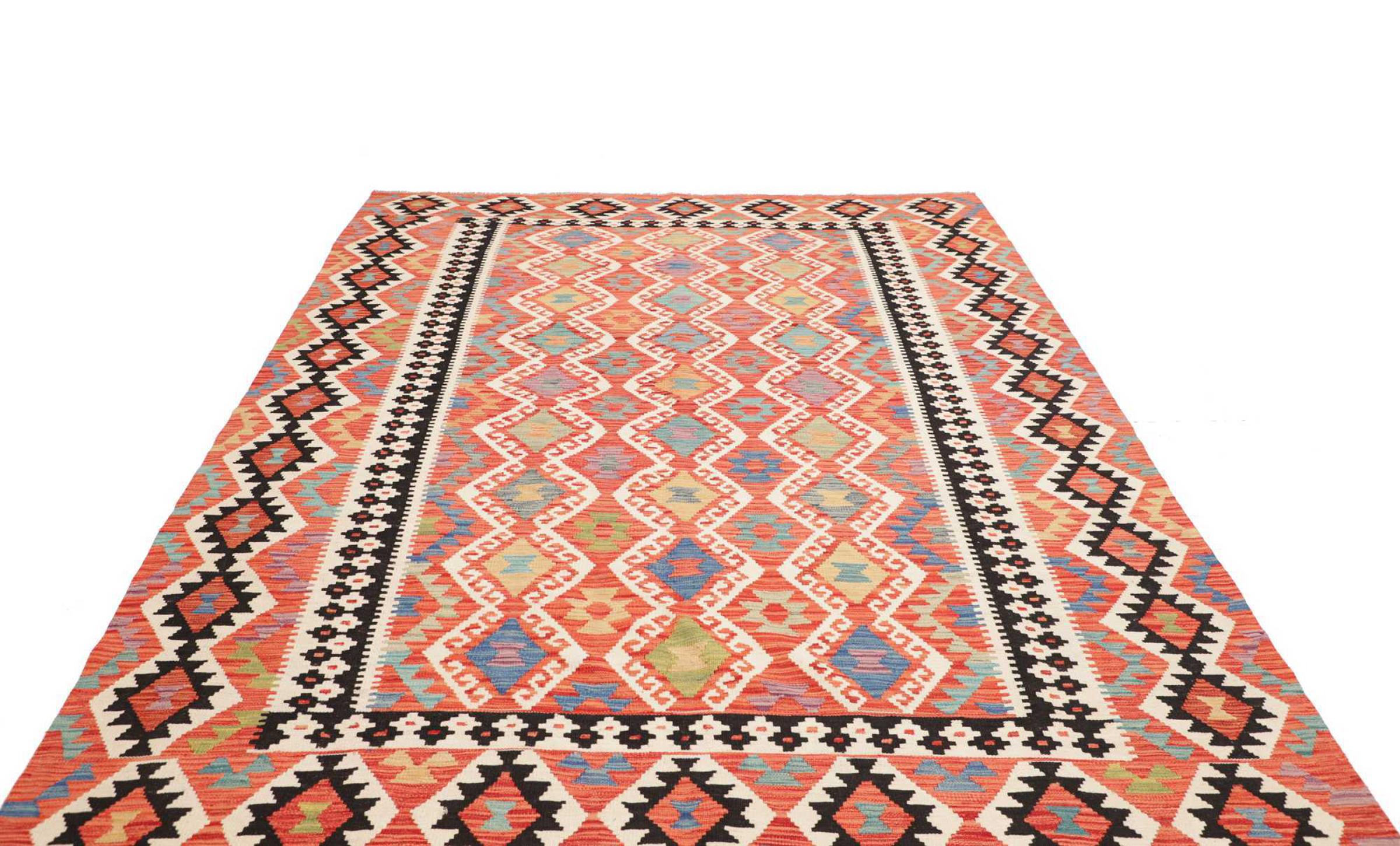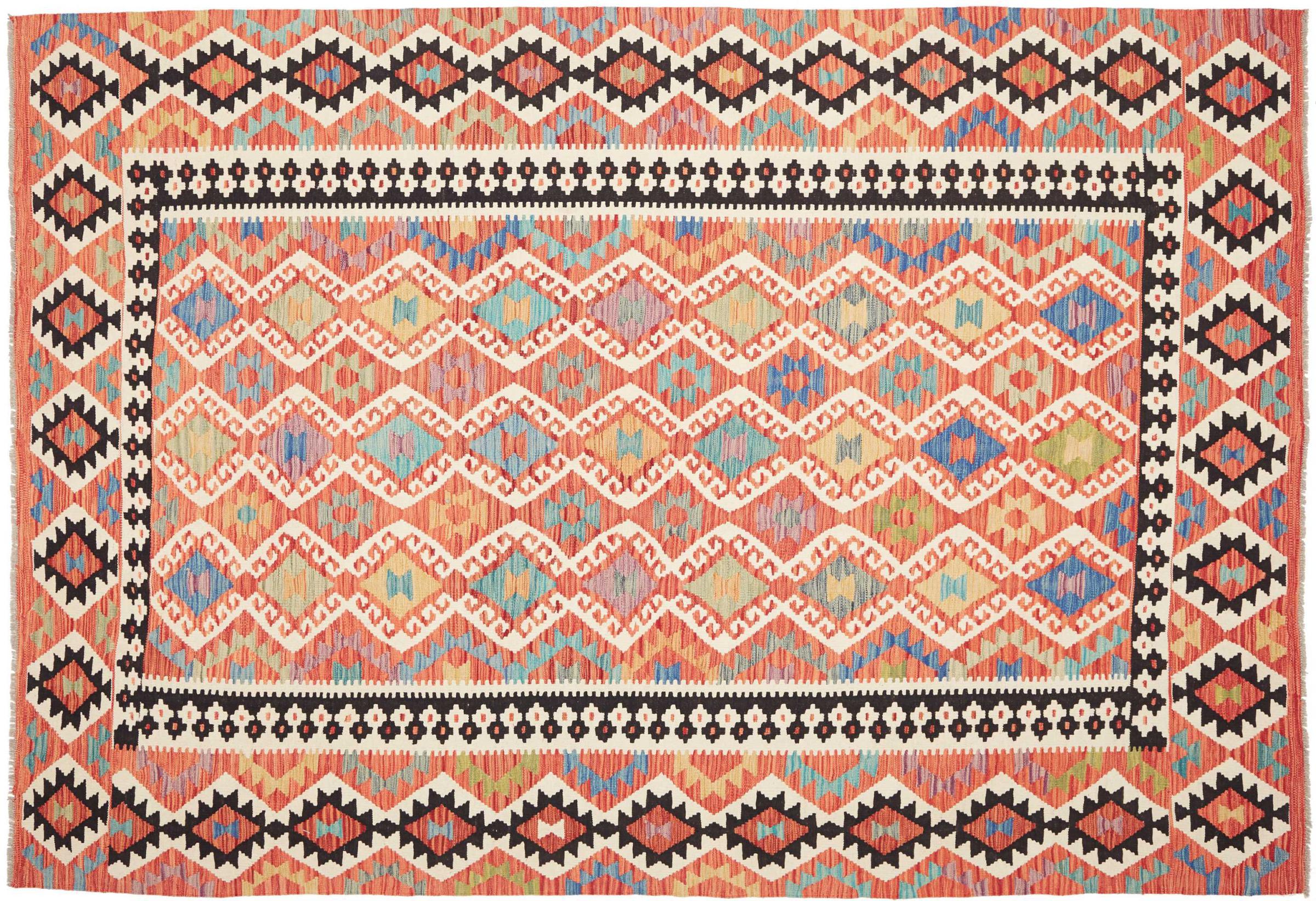 This handwoven Kilim Afghan is a wonderful and unique piece of art. Hard to believe that these modern colours and patterns have already been used centuries ago. This carpet has been woven by hand in old tradition in Afghanistan. It delivers a portion of contemporary history, which you won't find in this specific design a second time. It consists of high-grade natural wool and gives your home a personalised touch.