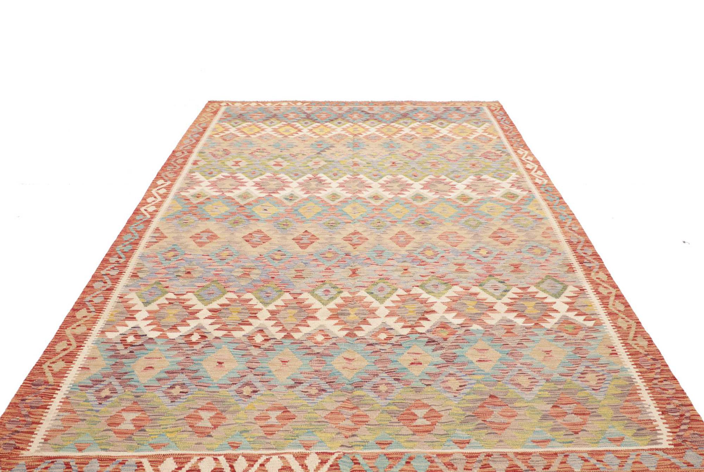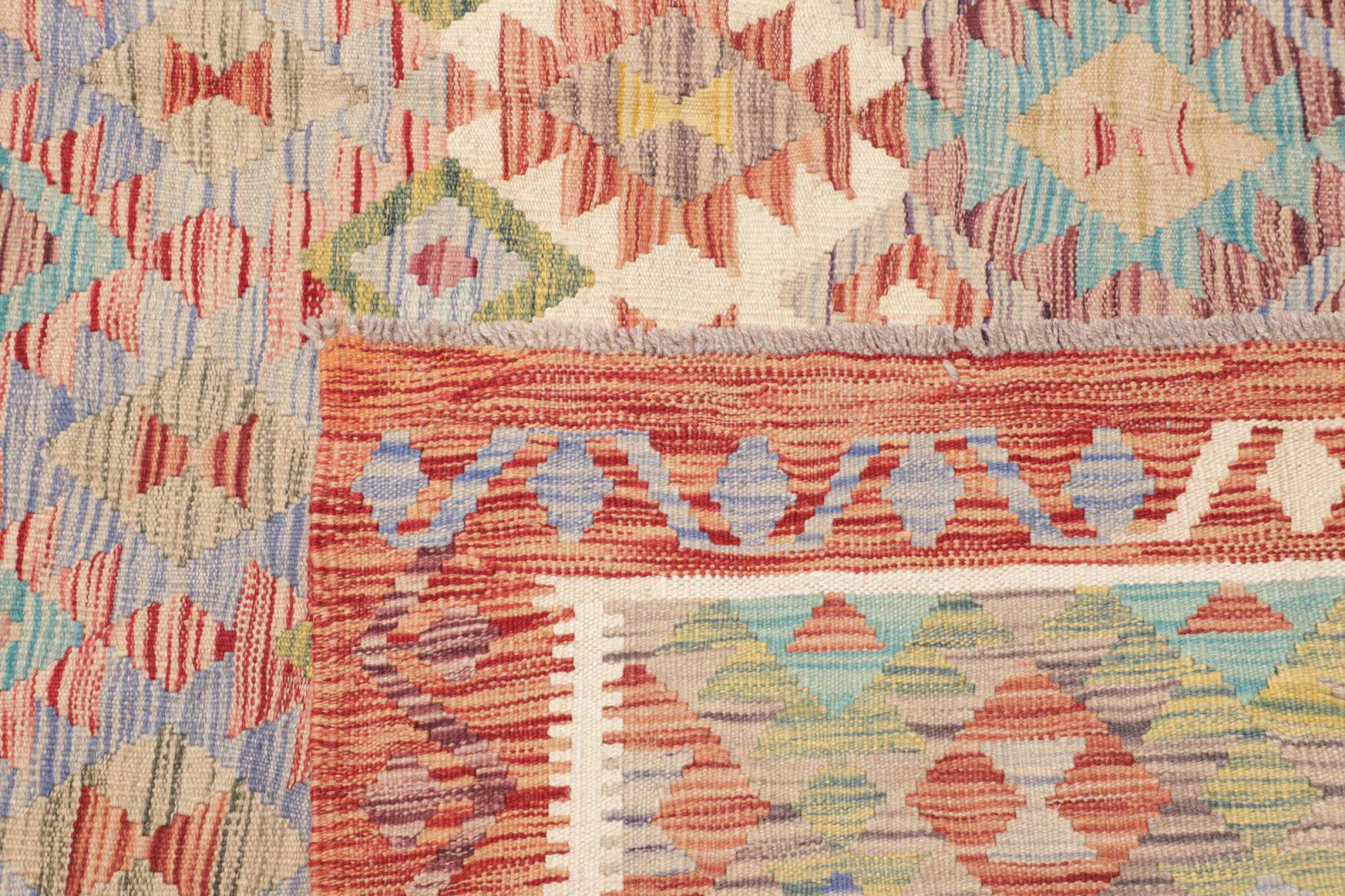 This rug was made as a flat weave by hand on a loom. Flatweave is the term used to describe rugs that have no pile. As the name promises, these rugs are woven and not knotted. This results in a flat rug with a structured surface. Flatweaves are not as soft and usually thinner than knotted rugs. At the same time they are much less complex to manufacture and can usually be laid out from both sides (front and back). Their patterns are usually geometric, which is determined by the fabric.