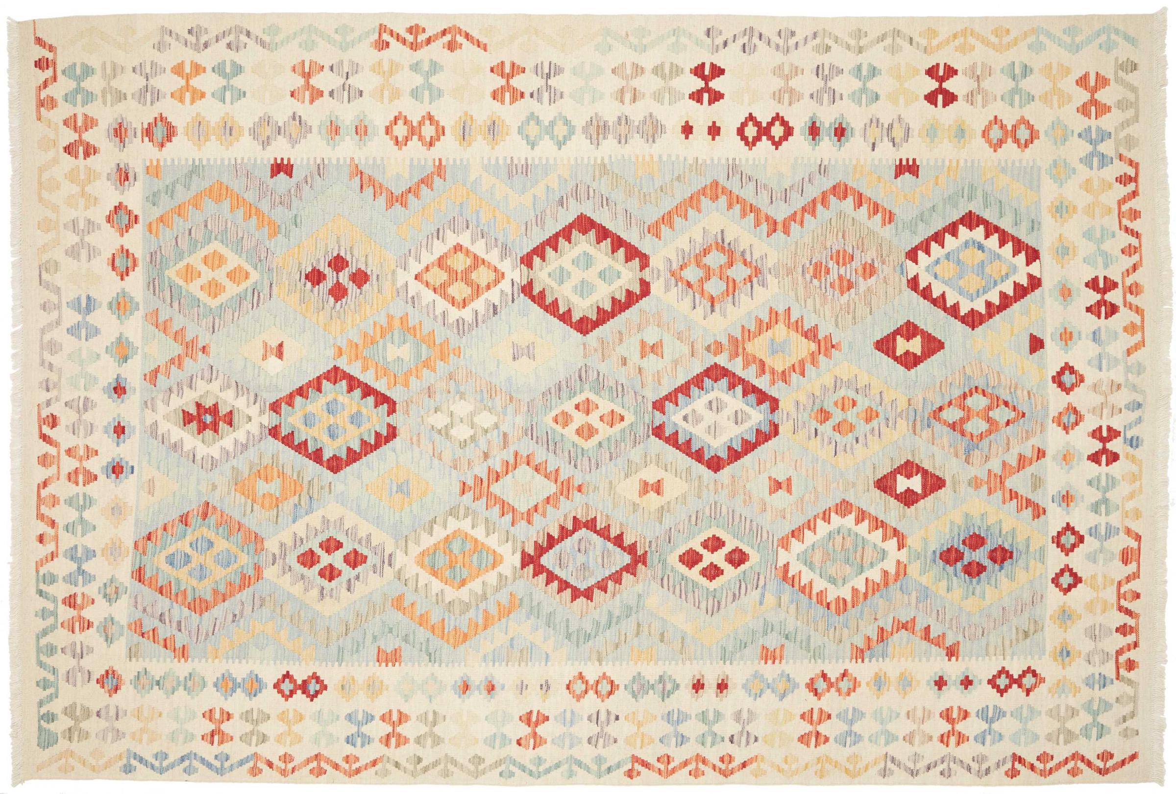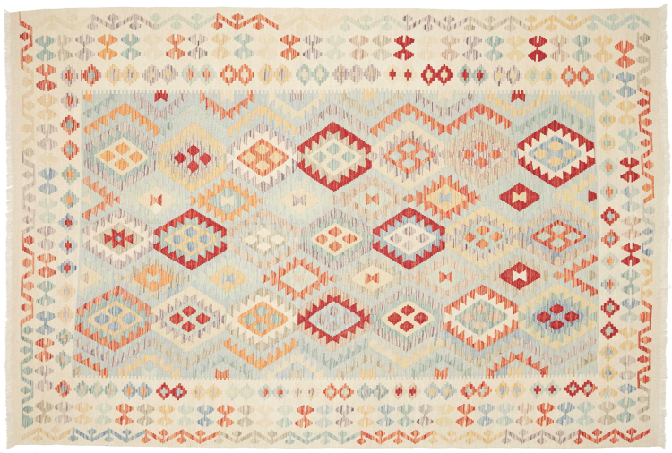 This rug was made as a flat weave by hand on a loom. Flatweave is the term used to describe rugs that have no pile. As the name promises, these rugs are woven and not knotted. This results in a flat rug with a structured surface. Flatweaves are not as soft and usually thinner than knotted rugs. At the same time they are much less complex to manufacture and can usually be laid out from both sides (front and back). Their patterns are usually geometric, which is determined by the fabric.