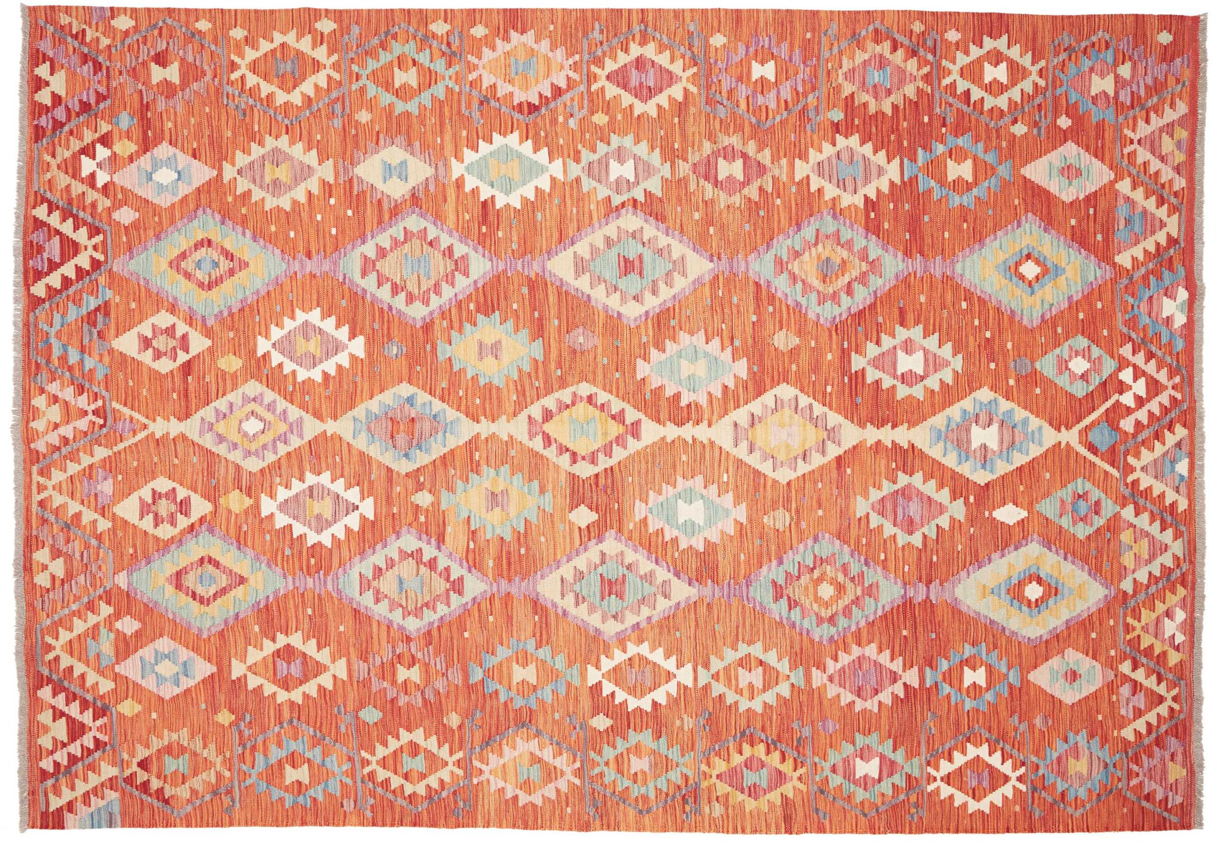 This rug was made as a flat weave by hand on a loom. Flatweave is the term used to describe rugs that have no pile. As the name promises, these rugs are woven and not knotted. This results in a flat rug with a structured surface. Flatweaves are not as soft and usually thinner than knotted rugs. At the same time they are much less complex to manufacture and can usually be laid out from both sides (front and back). Their patterns are usually geometric, which is determined by the fabric.