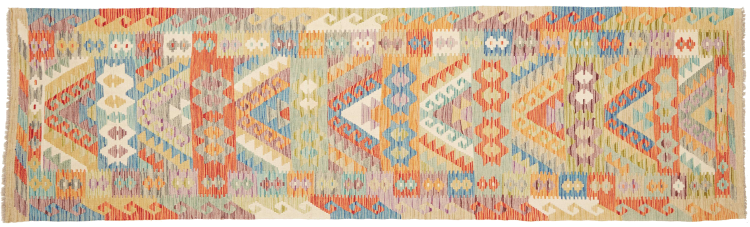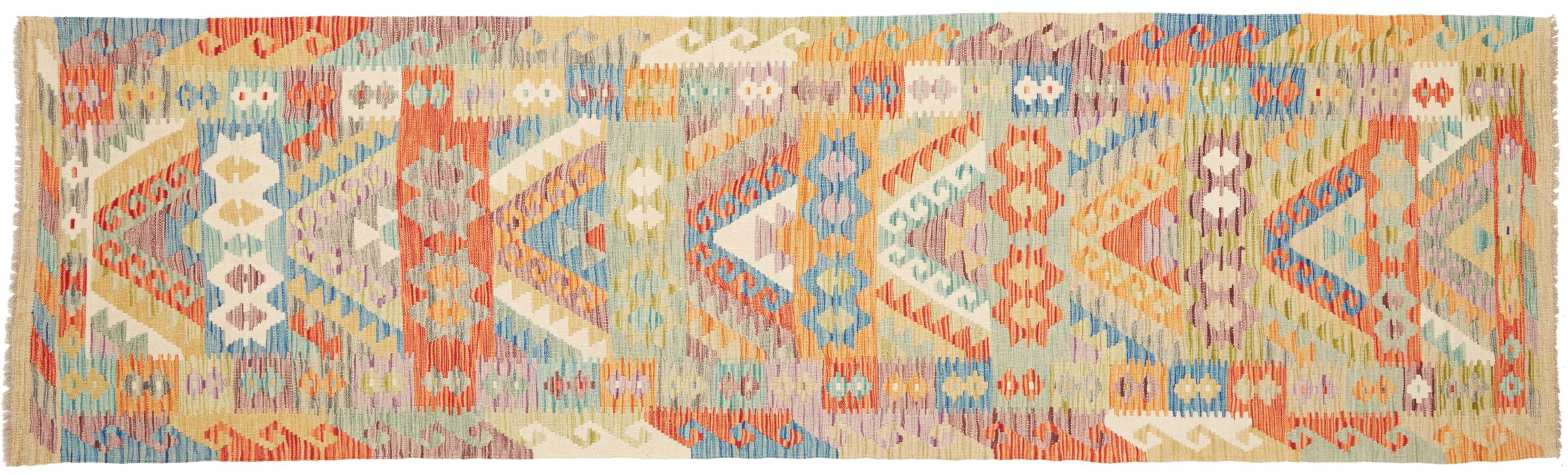This handwoven Kilim Afghan is a wonderful and unique piece of art. Hard to believe that these modern colours and patterns have already been used centuries ago. This carpet has been woven by hand in old tradition in Afghanistan. It delivers a portion of contemporary history, which you won't find in this specific design a second time. It consists of high-grade natural wool and gives your home a personalised touch.