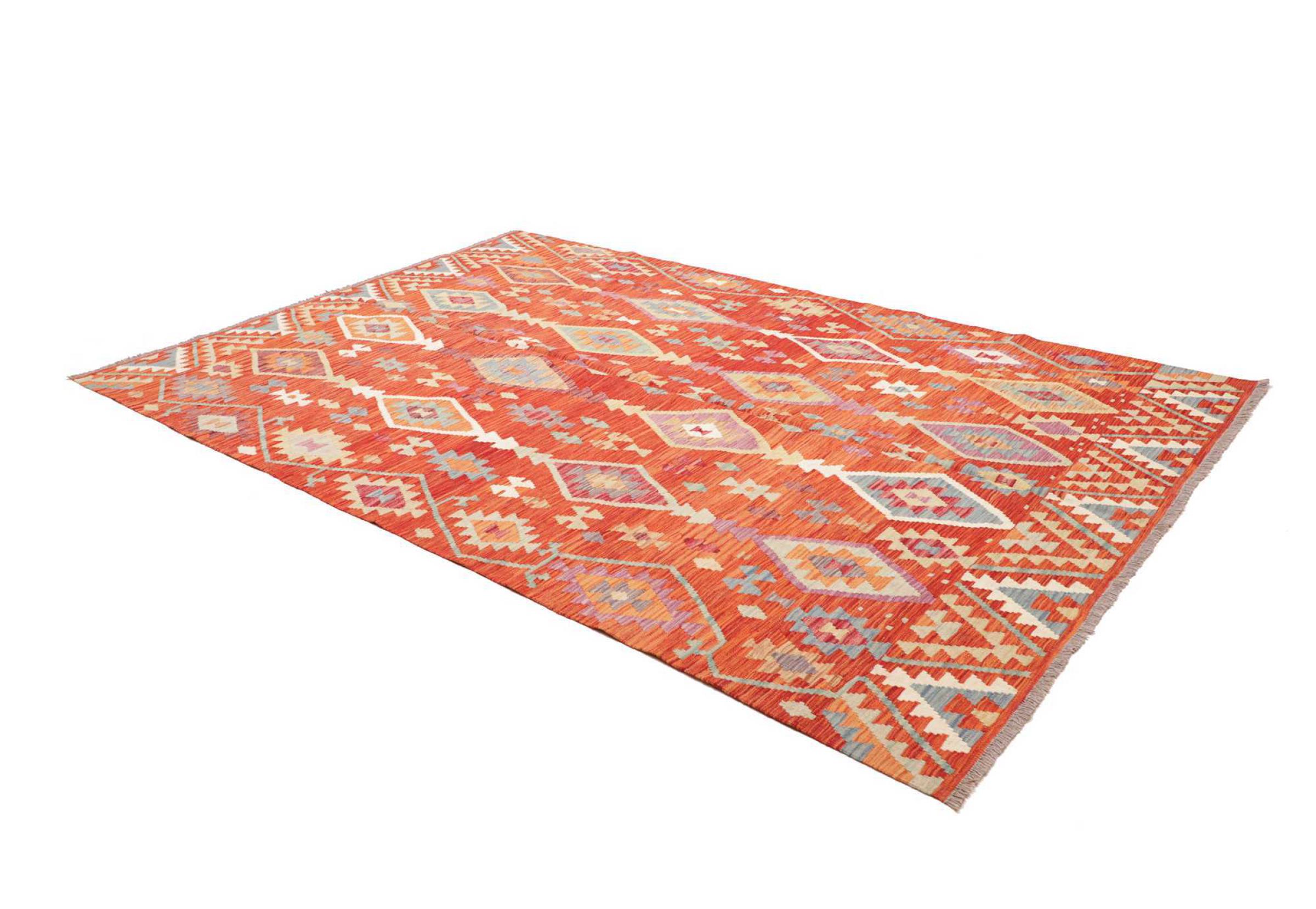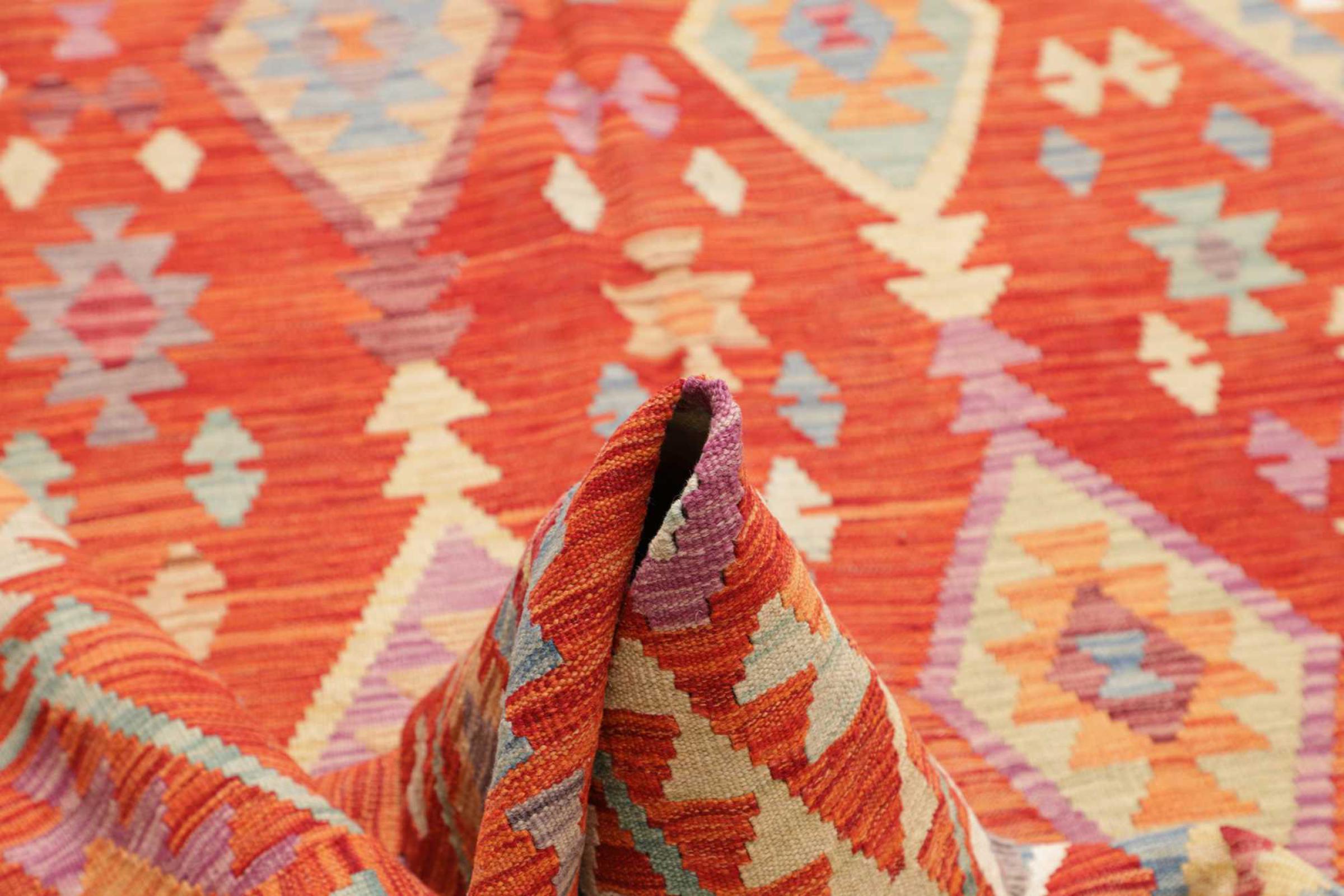This rug was made as a flat weave by hand on a loom. Flatweave is the term used to describe rugs that have no pile. As the name promises, these rugs are woven and not knotted. This results in a flat rug with a structured surface. Flatweaves are not as soft and usually thinner than knotted rugs. At the same time they are much less complex to manufacture and can usually be laid out from both sides (front and back). Their patterns are usually geometric, which is determined by the fabric.