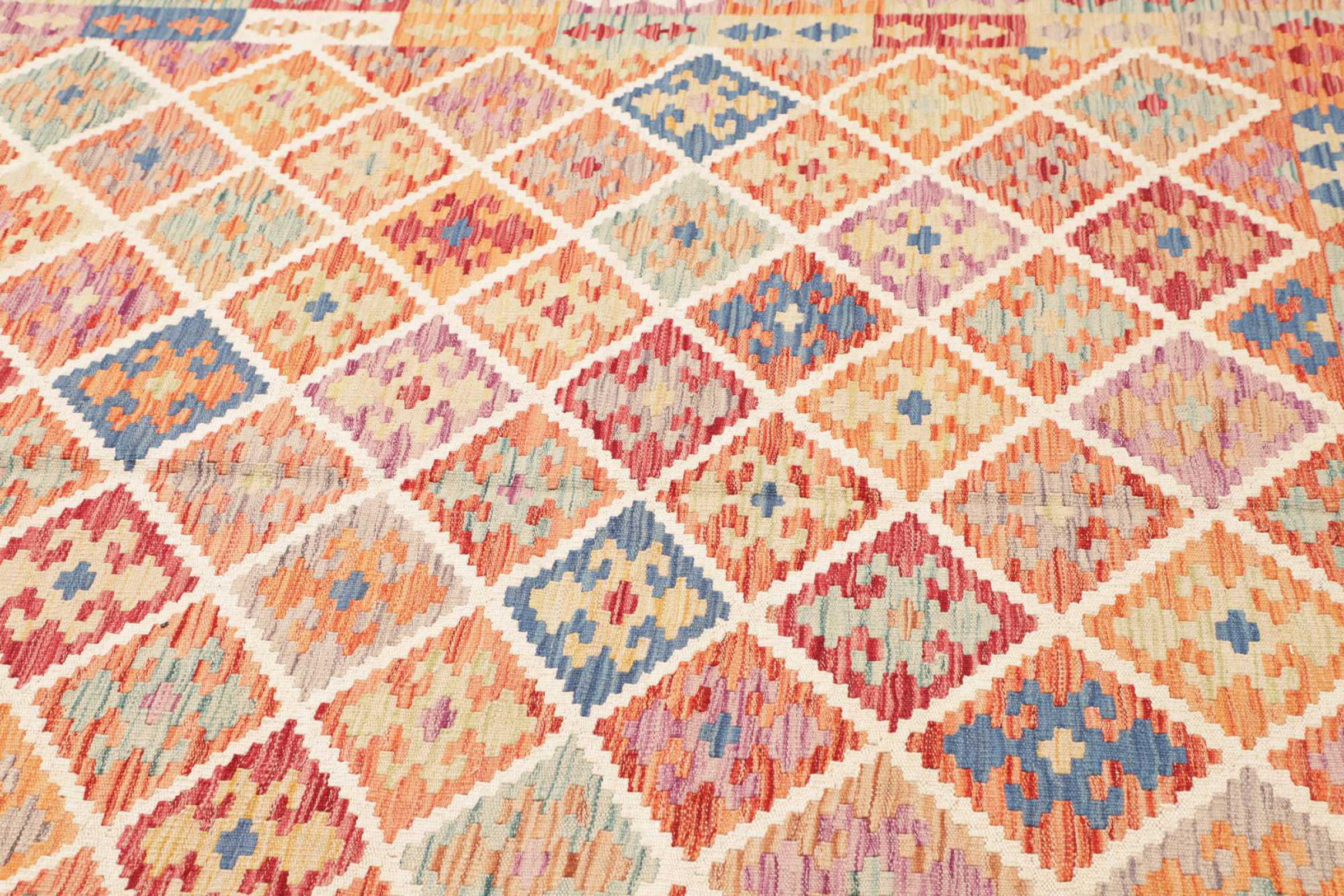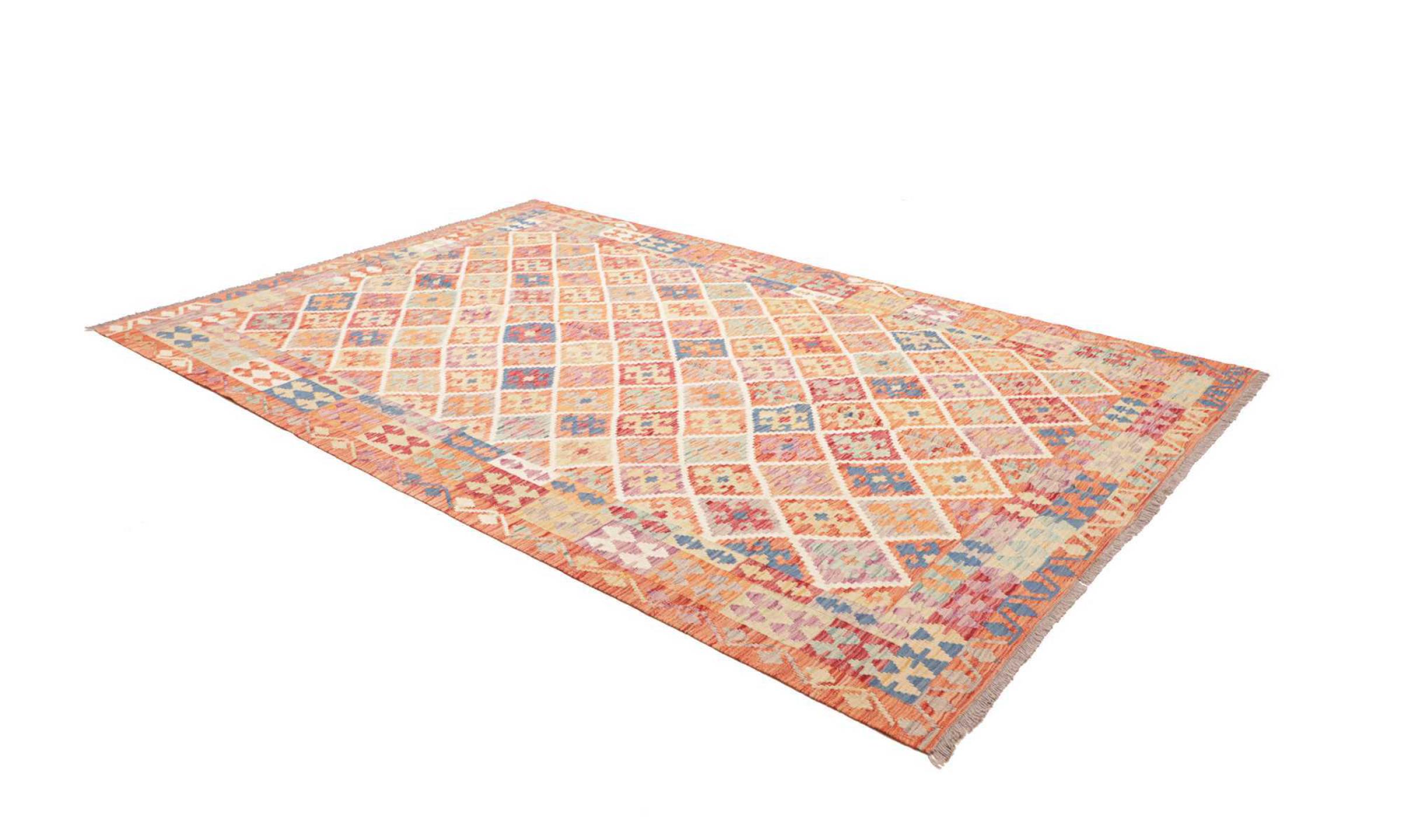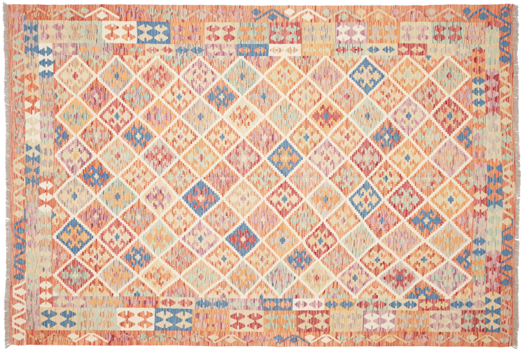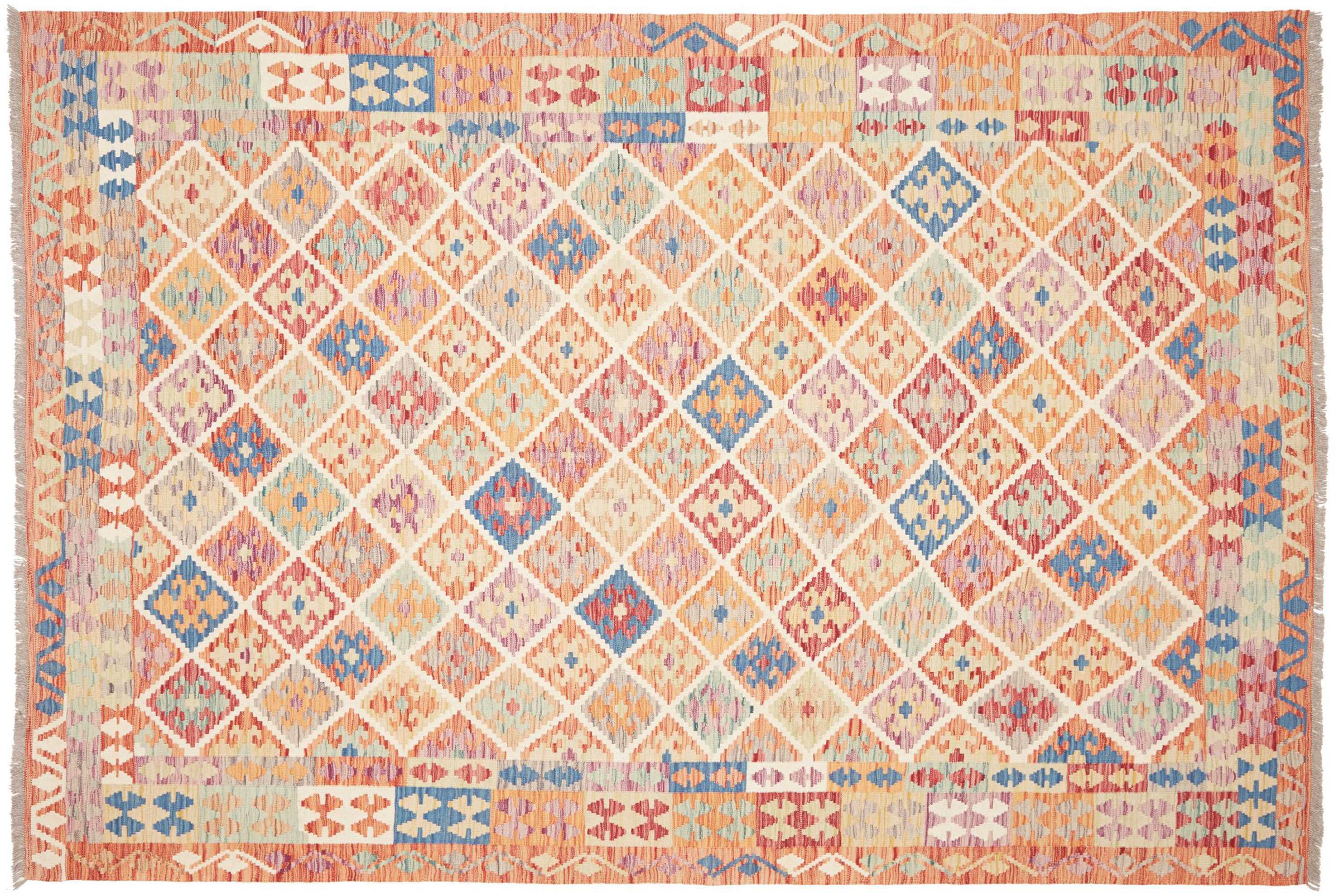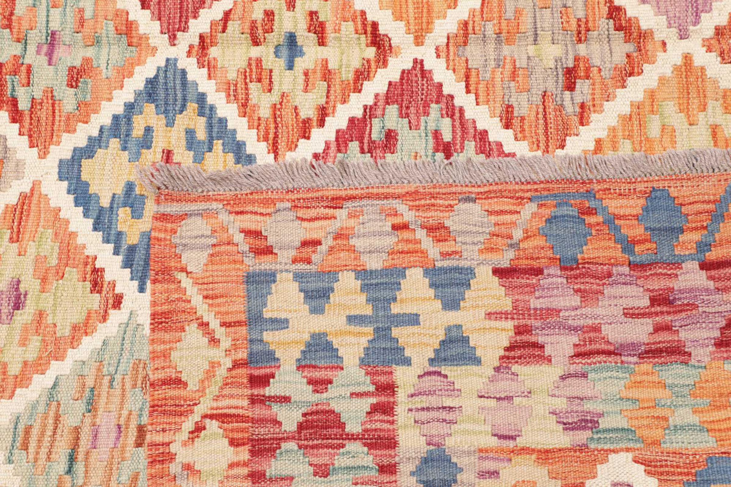 This rug was made as a flat weave by hand on a loom. Flatweave is the term used to describe rugs that have no pile. As the name promises, these rugs are woven and not knotted. This results in a flat rug with a structured surface. Flatweaves are not as soft and usually thinner than knotted rugs. At the same time they are much less complex to manufacture and can usually be laid out from both sides (front and back). Their patterns are usually geometric, which is determined by the fabric.