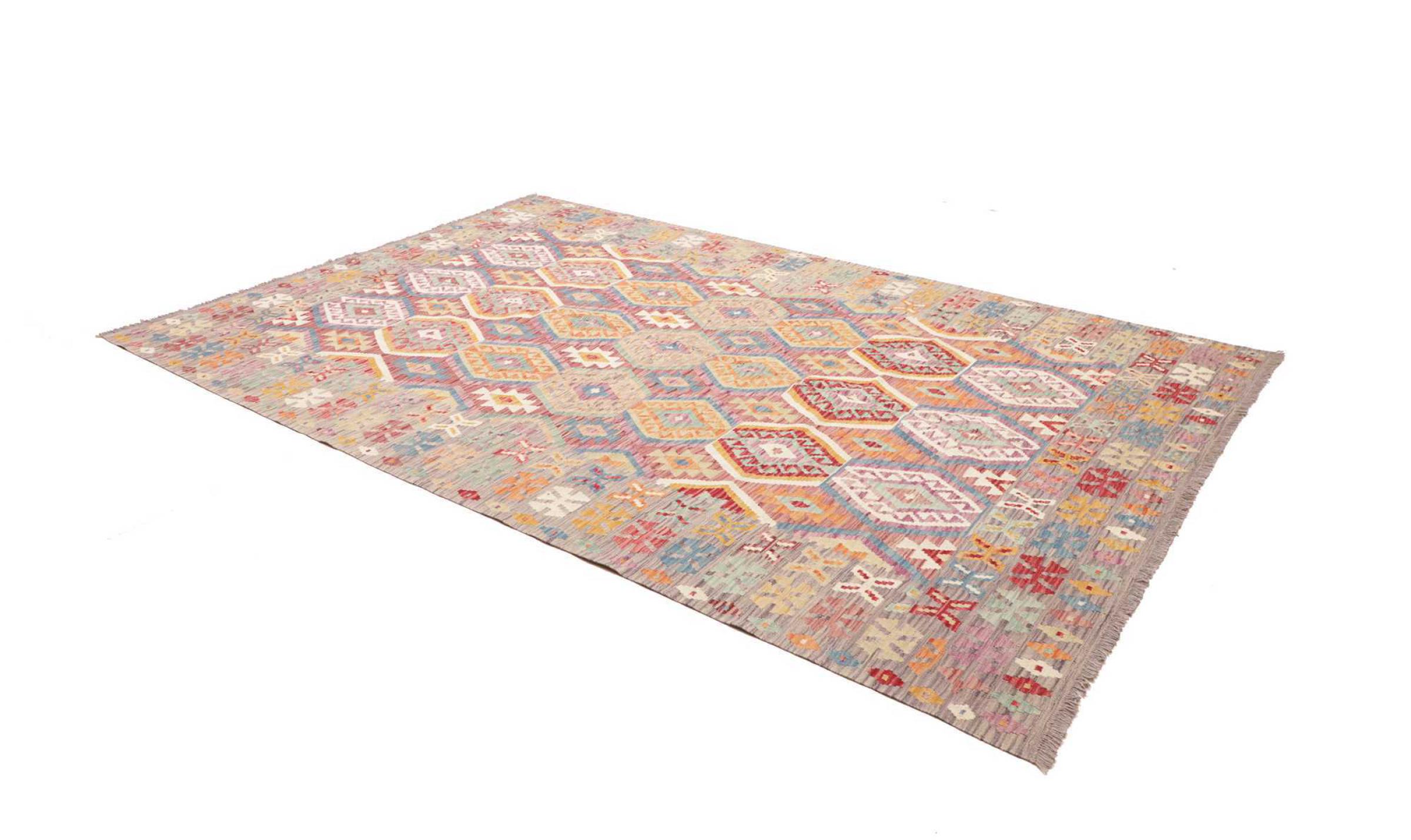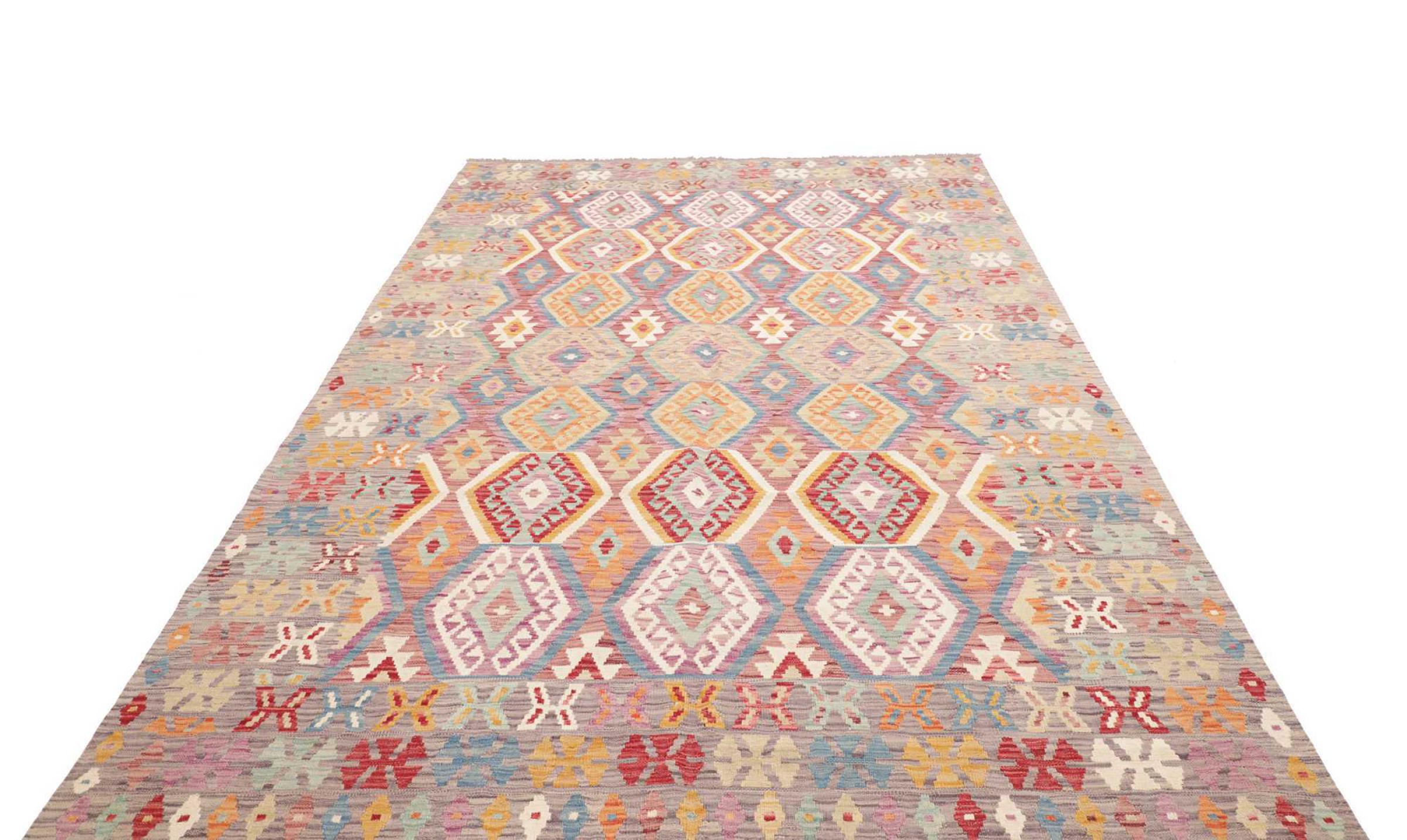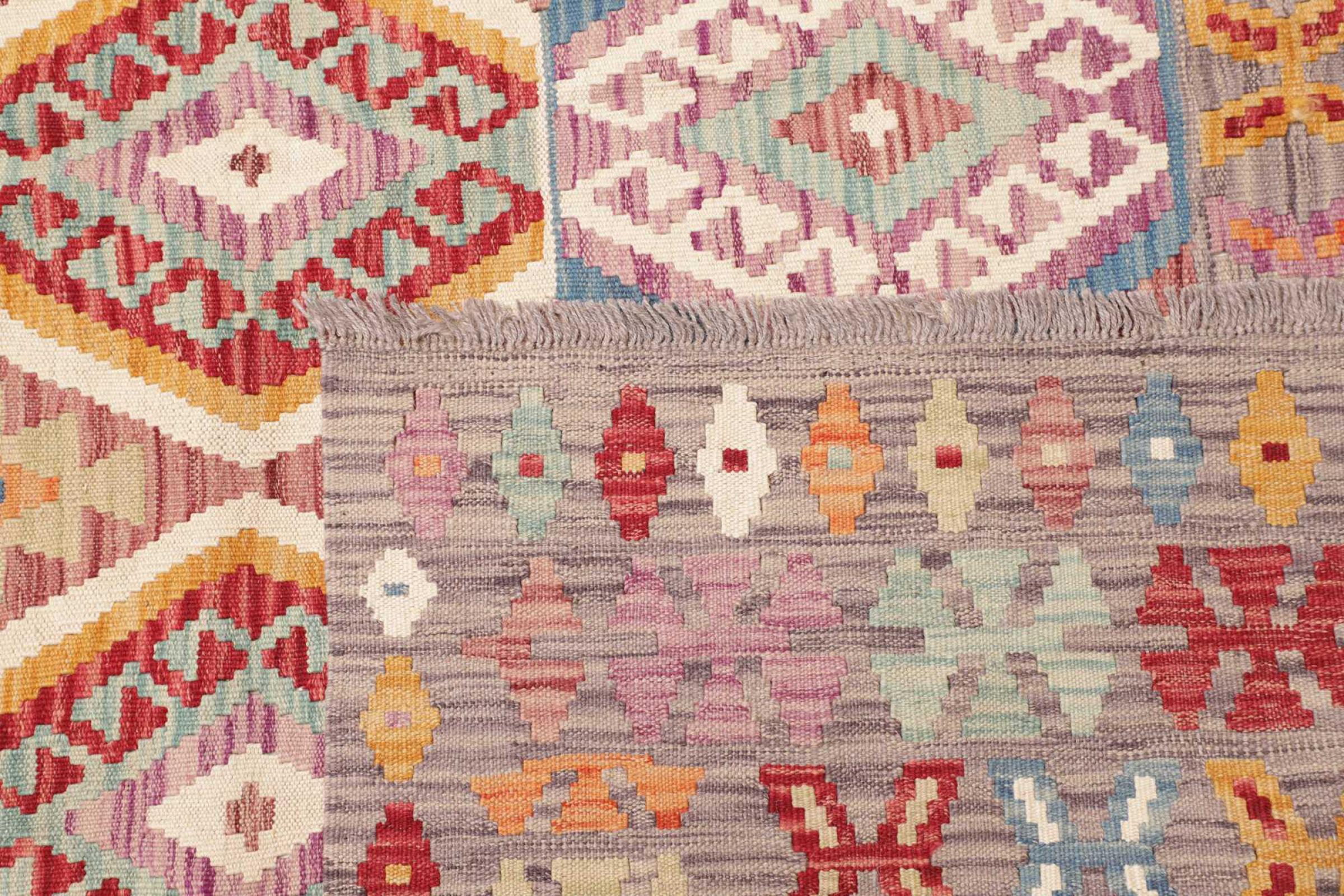 This rug was made as a flat weave by hand on a loom. Flatweave is the term used to describe rugs that have no pile. As the name promises, these rugs are woven and not knotted. This results in a flat rug with a structured surface. Flatweaves are not as soft and usually thinner than knotted rugs. At the same time they are much less complex to manufacture and can usually be laid out from both sides (front and back). Their patterns are usually geometric, which is determined by the fabric.