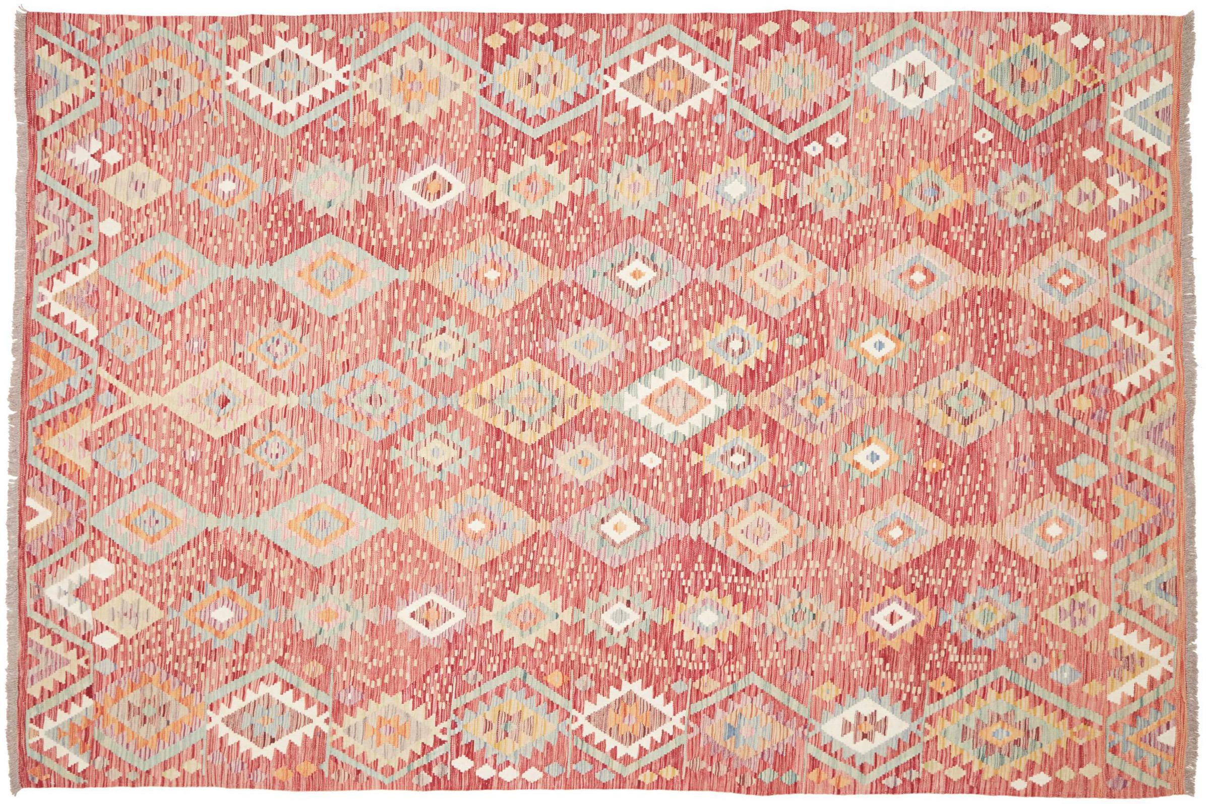 This rug was made as a flat weave by hand on a loom. Flatweave is the term used to describe rugs that have no pile. As the name promises, these rugs are woven and not knotted. This results in a flat rug with a structured surface. Flatweaves are not as soft and usually thinner than knotted rugs. At the same time they are much less complex to manufacture and can usually be laid out from both sides (front and back). Their patterns are usually geometric, which is determined by the fabric.