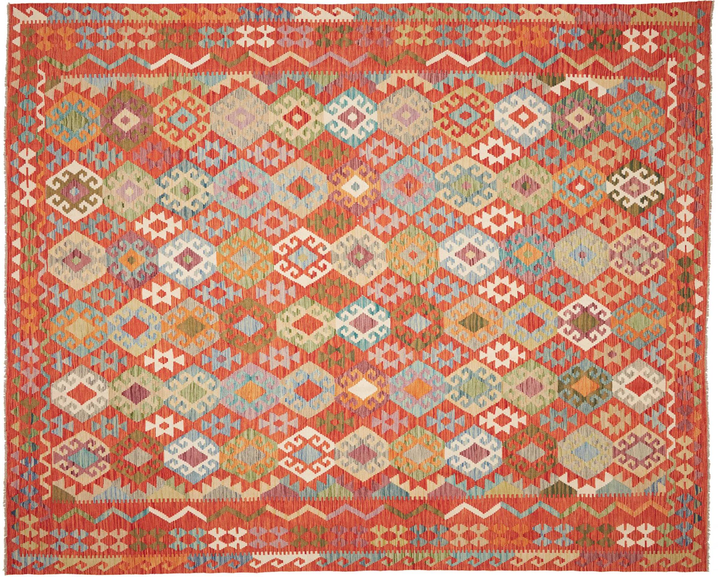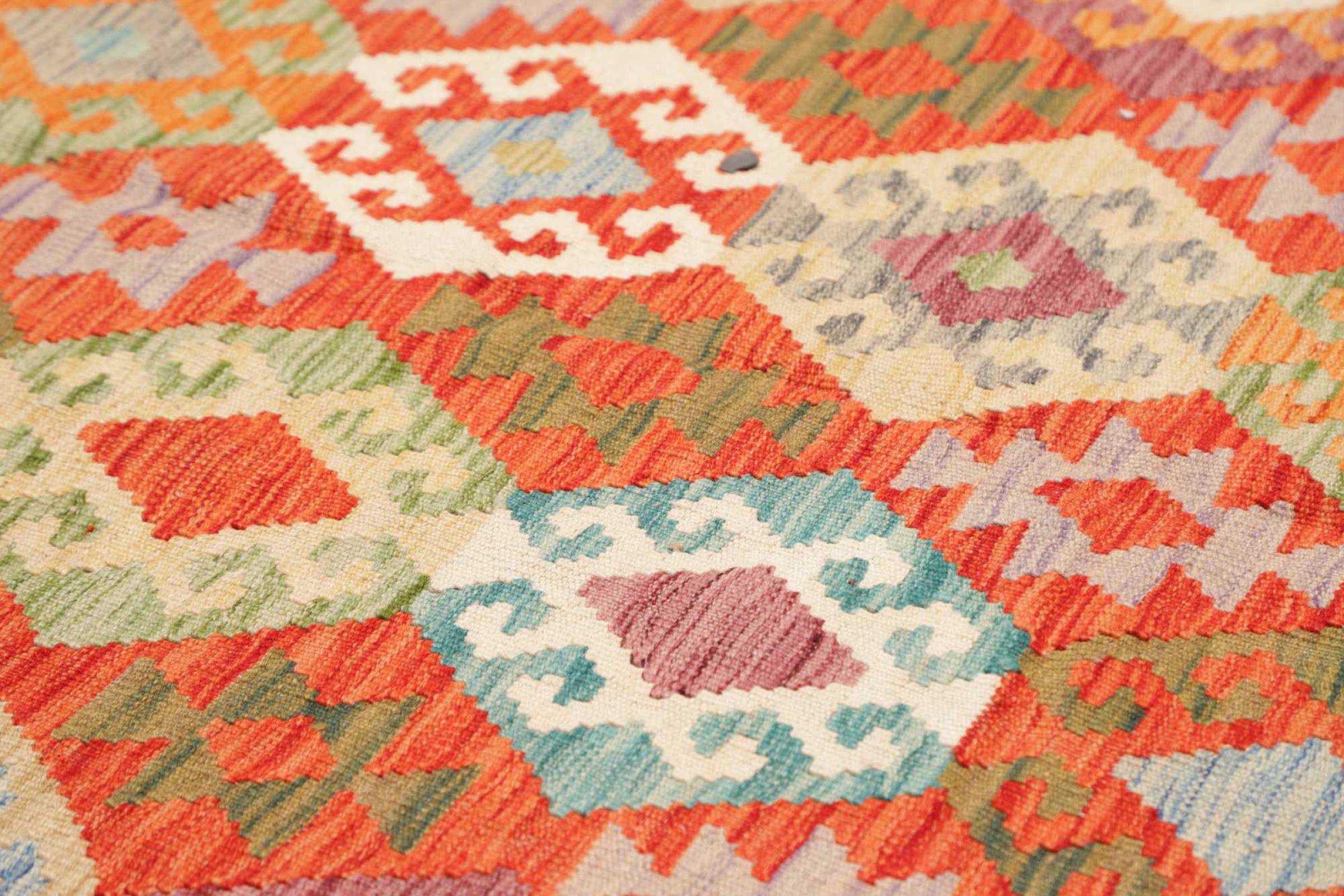 This handwoven Kilim Afghan is a wonderful and unique piece of art. Hard to believe that these modern colours and patterns have already been used centuries ago. This carpet has been woven by hand in old tradition in Afghanistan. It delivers a portion of contemporary history, which you won't find in this specific design a second time. It consists of high-grade natural wool and gives your home a personalised touch.