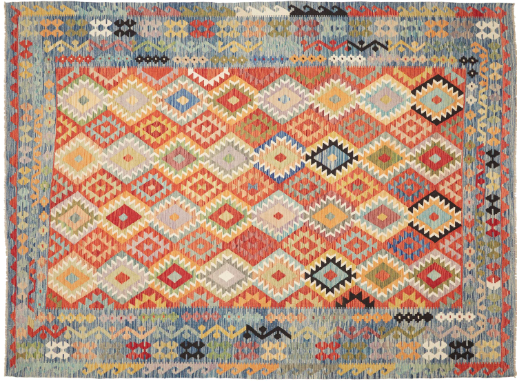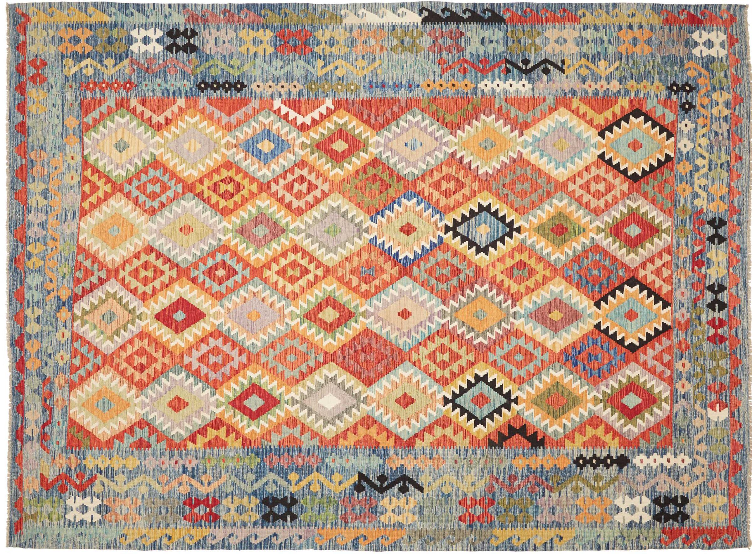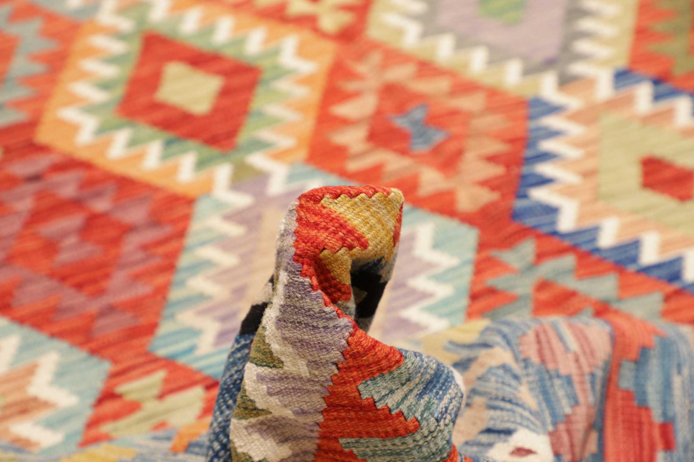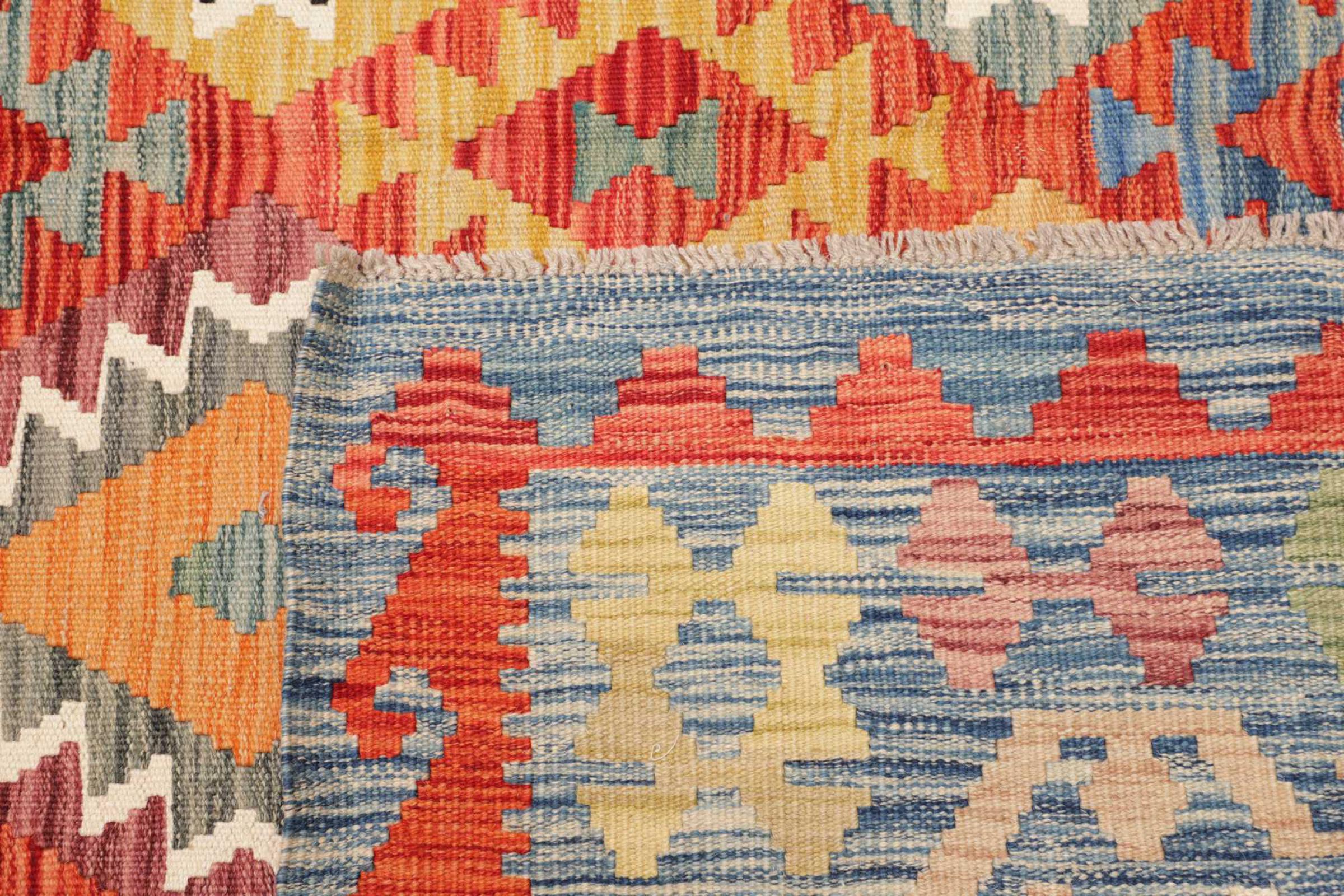 This handwoven Kilim Afghan is a wonderful and unique piece of art. Hard to believe that these modern colours and patterns have already been used centuries ago. This carpet has been woven by hand in old tradition in Afghanistan. It delivers a portion of contemporary history, which you won't find in this specific design a second time. It consists of high-grade natural wool and gives your home a personalised touch.