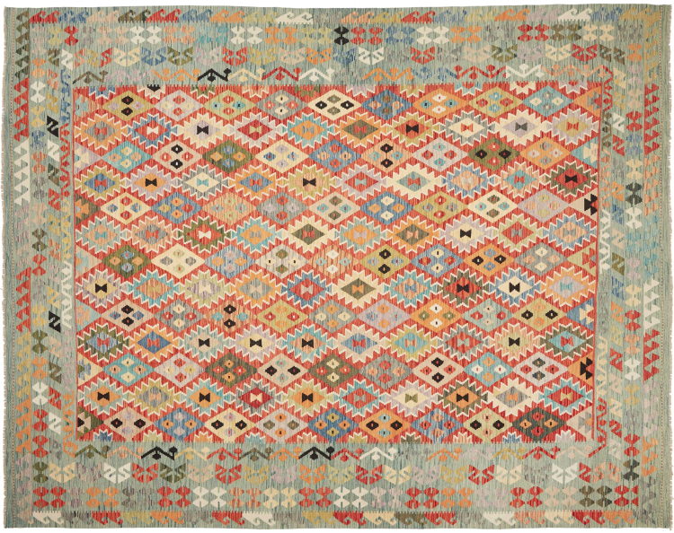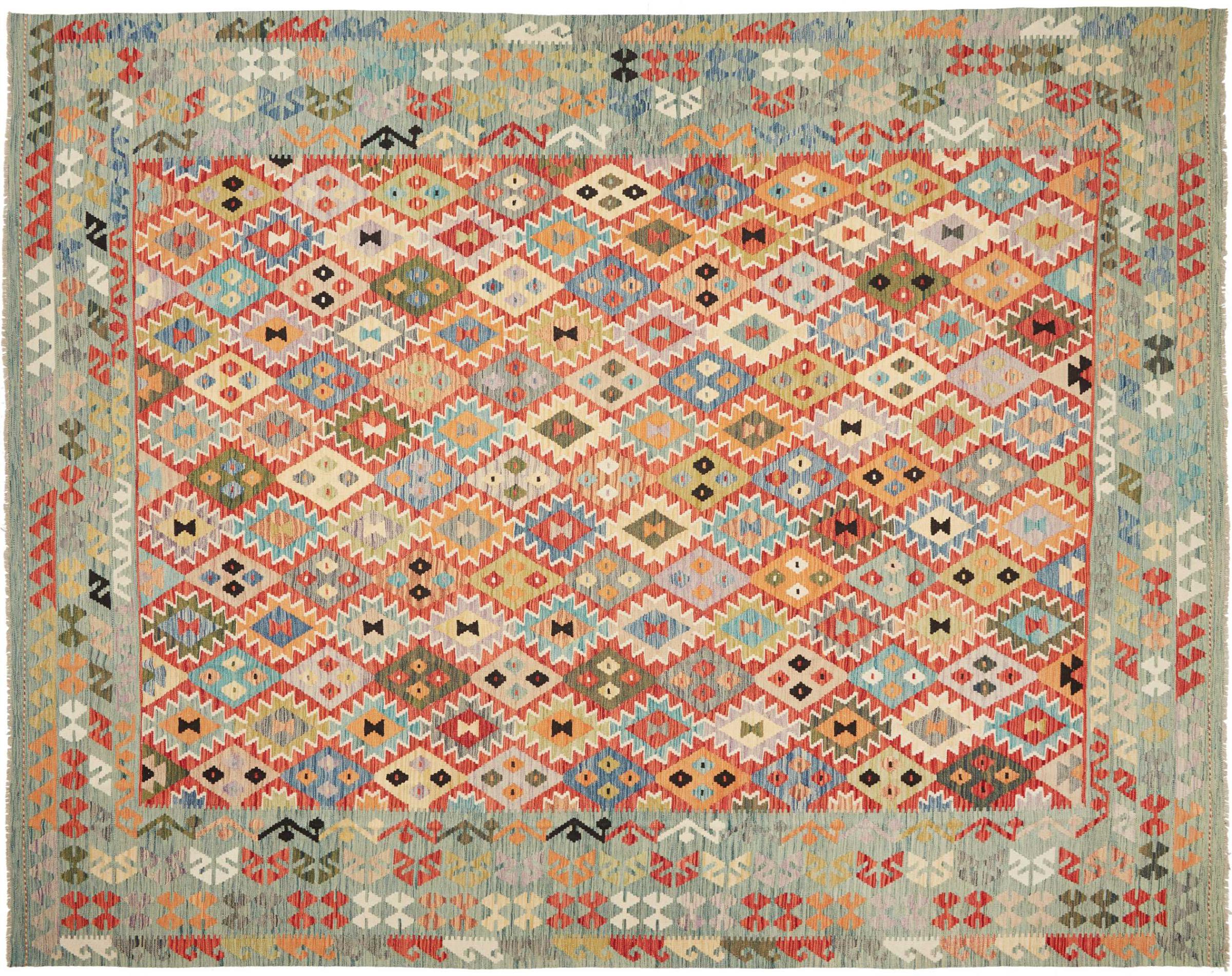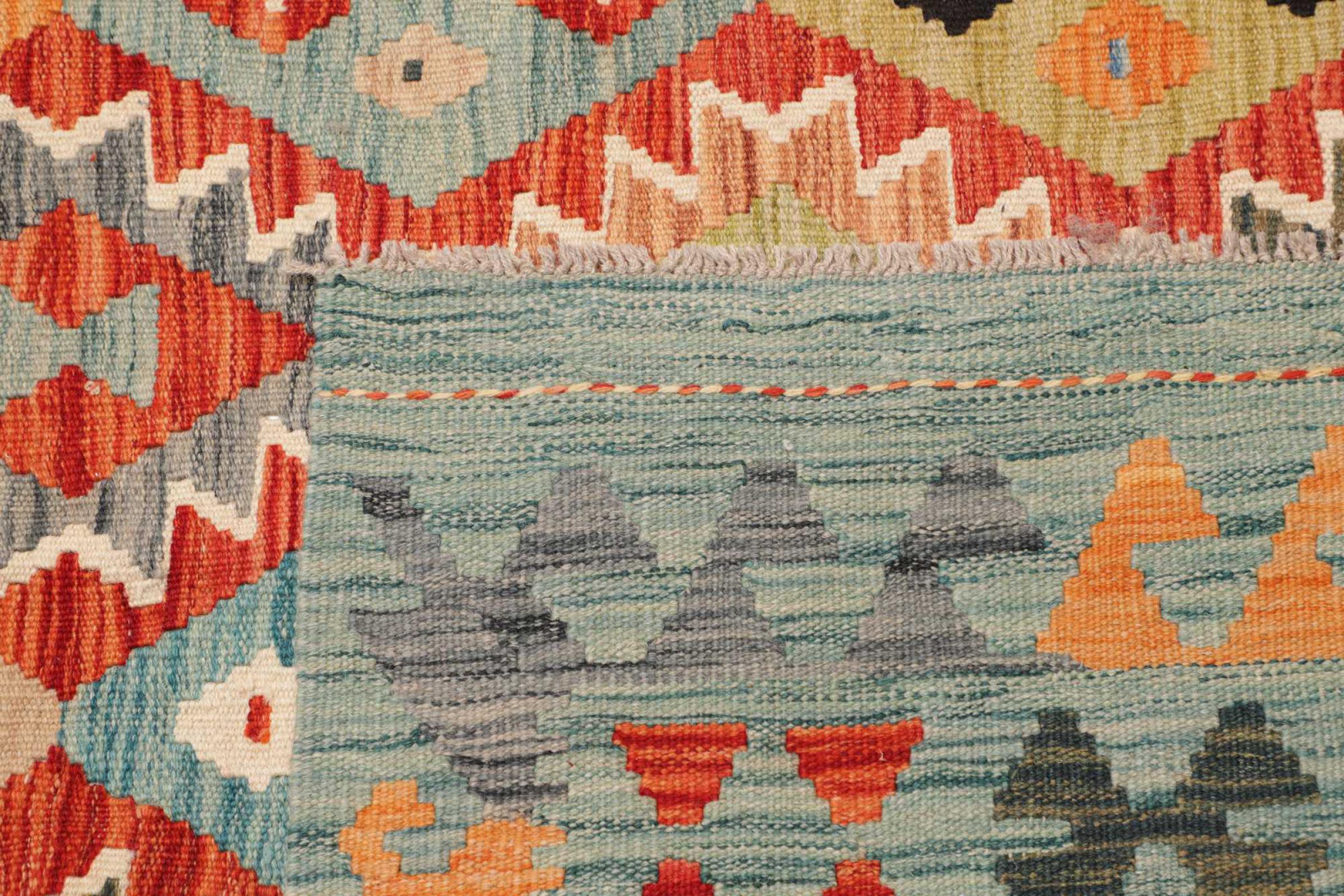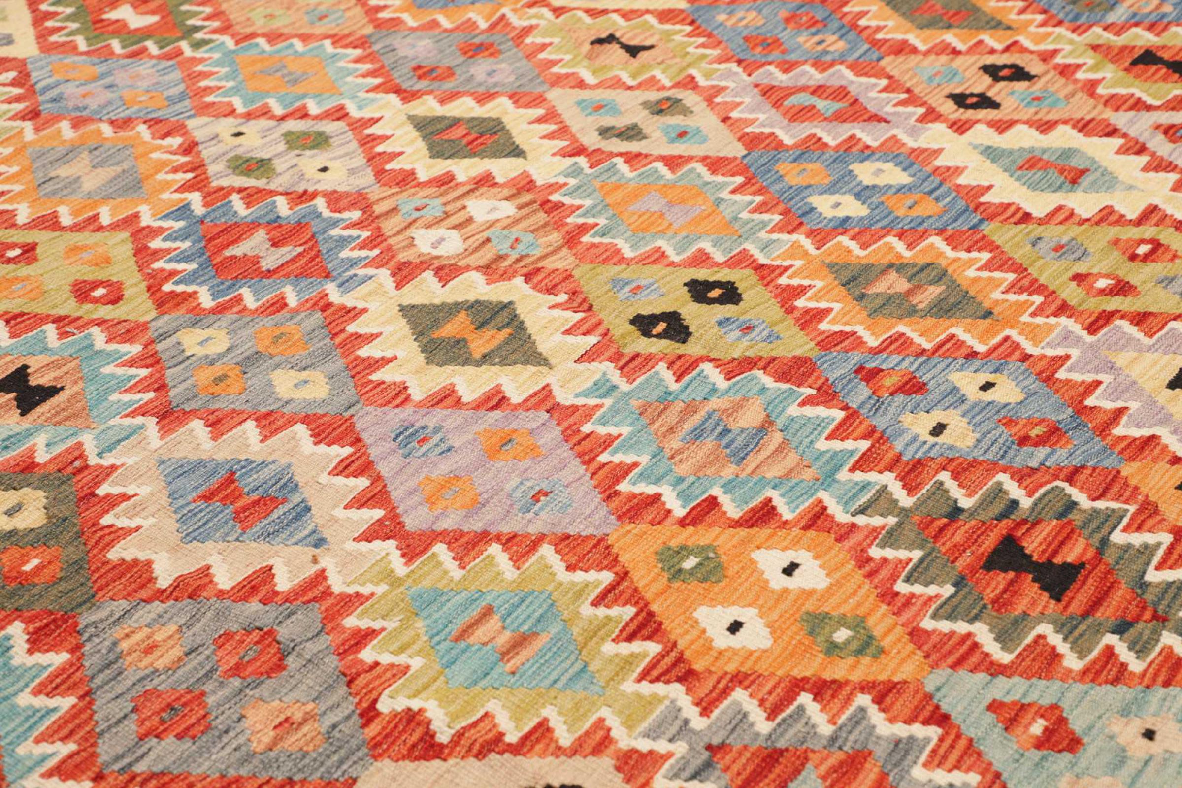 This handwoven Kilim Afghan is a wonderful and unique piece of art. Hard to believe that these modern colours and patterns have already been used centuries ago. This carpet has been woven by hand in old tradition in Afghanistan. It delivers a portion of contemporary history, which you won't find in this specific design a second time. It consists of high-grade natural wool and gives your home a personalised touch.