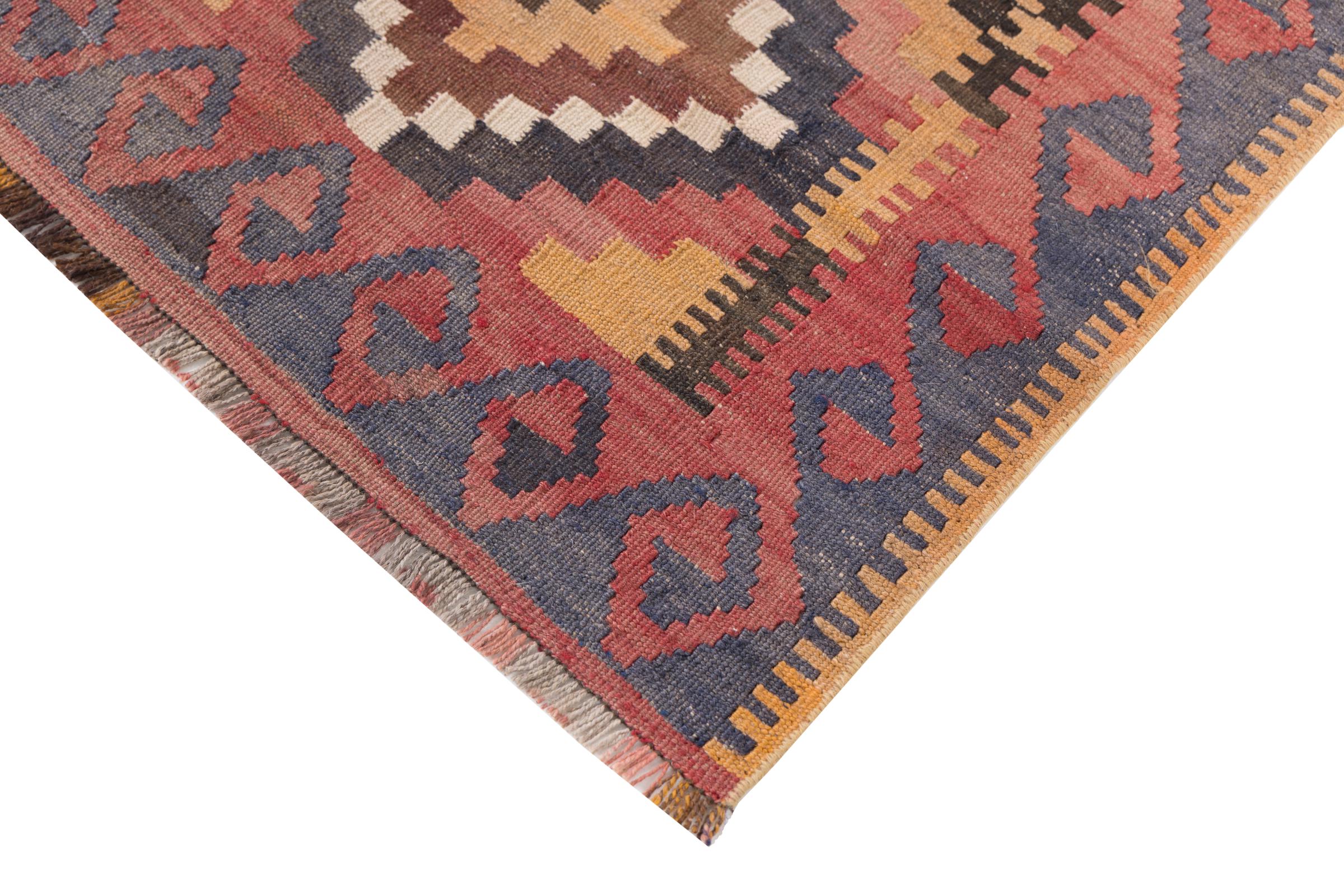This handwoven Kilim Afghan is a wonderful and unique piece of art. Hard to believe that these modern colours and patterns have already been used centuries ago. This carpet has been woven by hand in old tradition in Afghanistan. It delivers a portion of contemporary history, which you won't find in this specific design a second time. It consists of high-grade natural wool and gives your home a personalised touch.