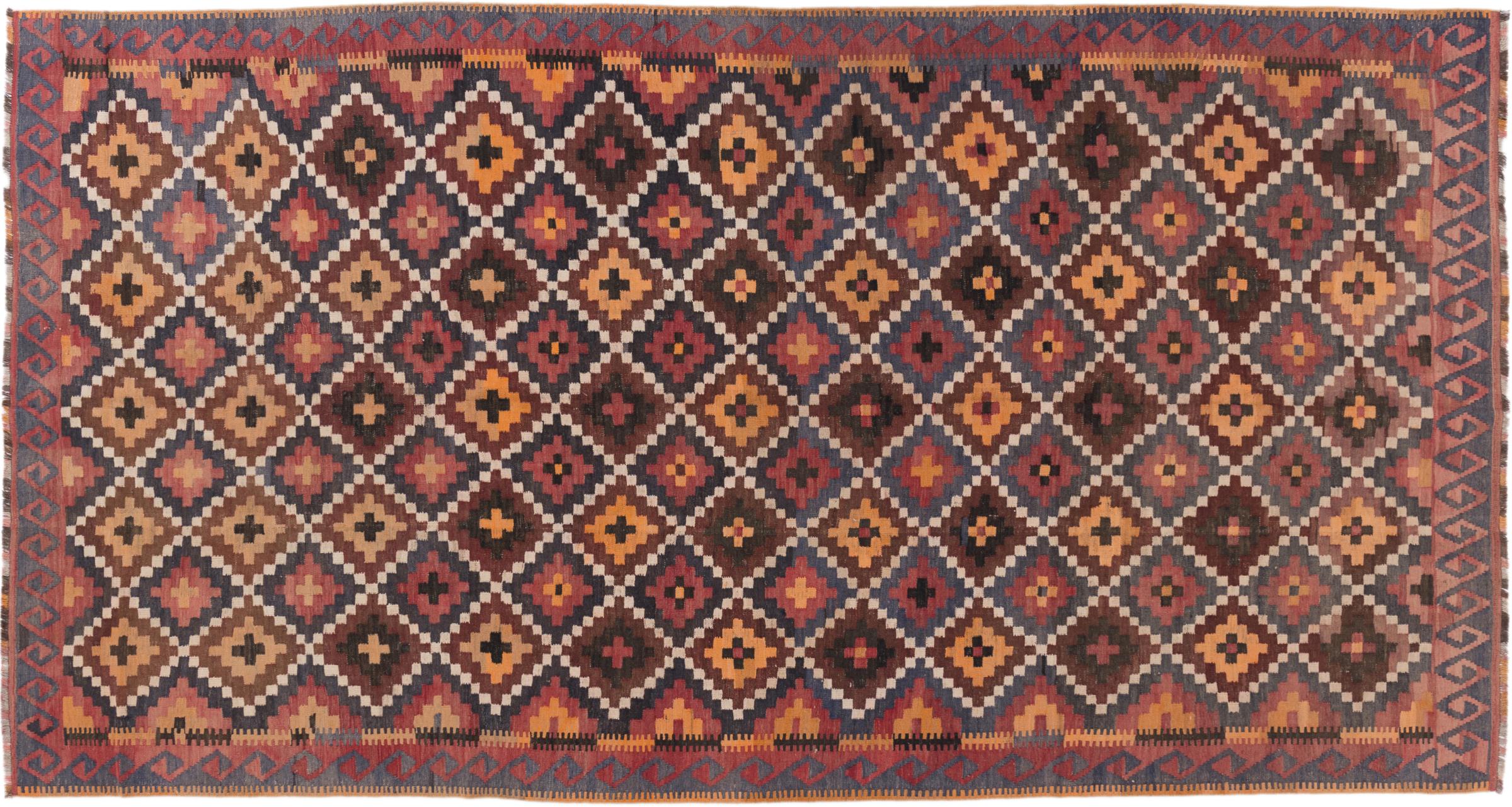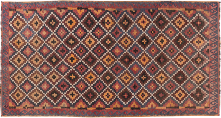 This rug was made as a flat weave by hand on a loom. Flatweave is the term used to describe rugs that have no pile. As the name promises, these rugs are woven and not knotted. This results in a flat rug with a structured surface. Flatweaves are not as soft and usually thinner than knotted rugs. At the same time they are much less complex to manufacture and can usually be laid out from both sides (front and back). Their patterns are usually geometric, which is determined by the fabric.