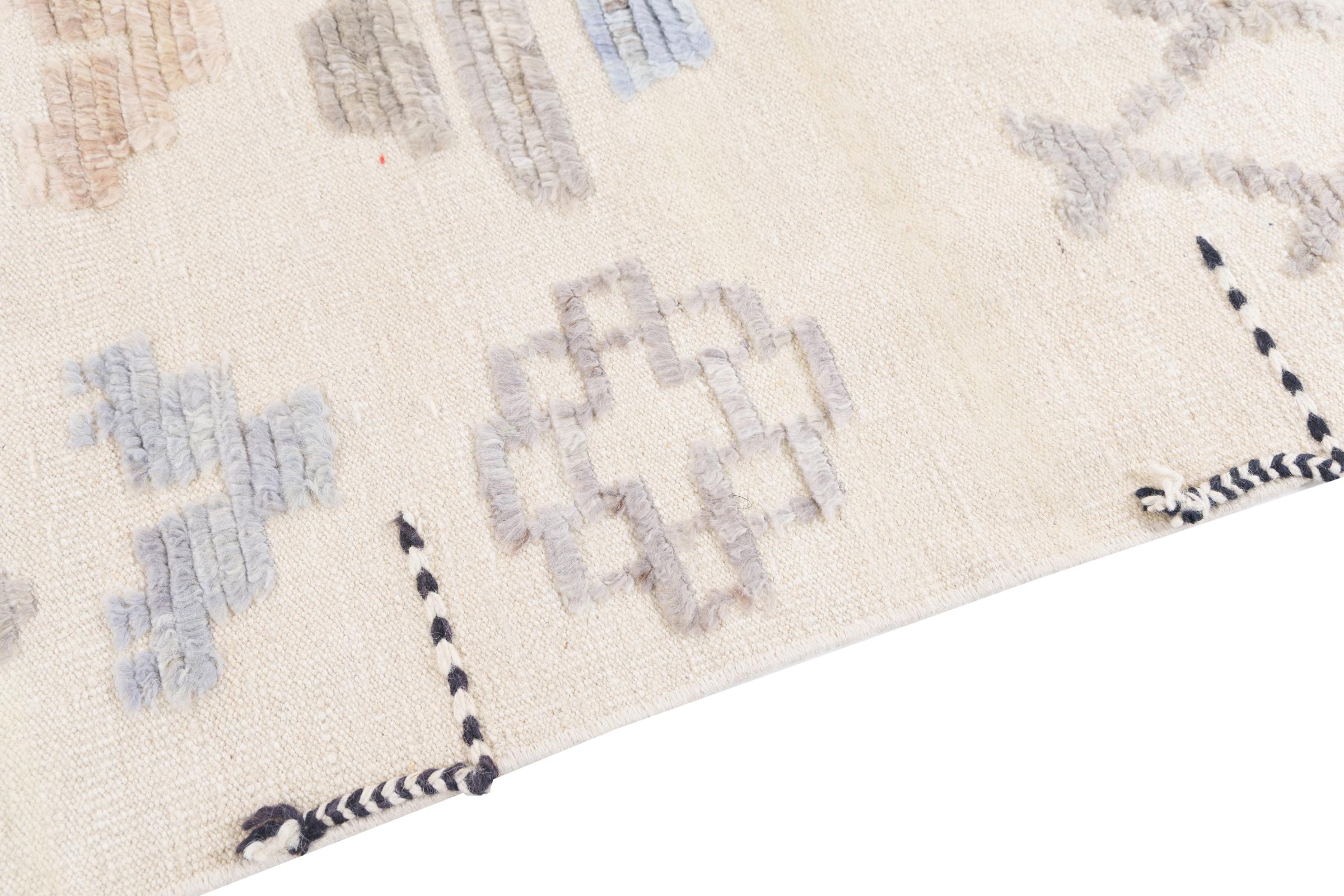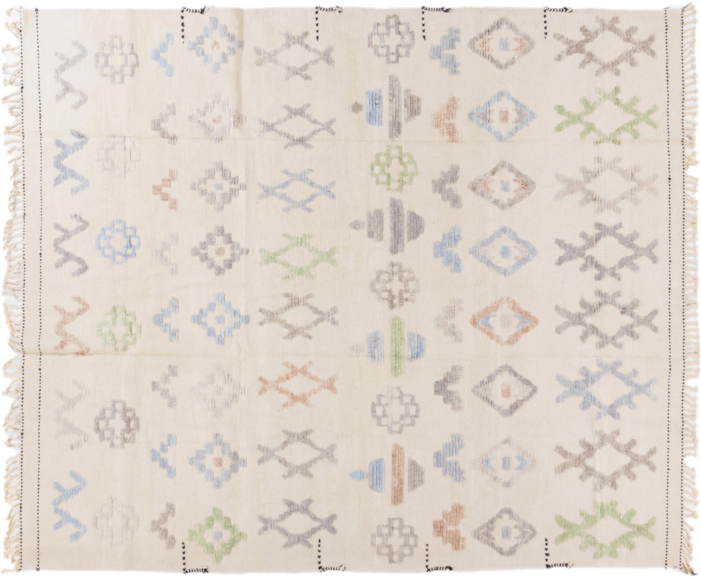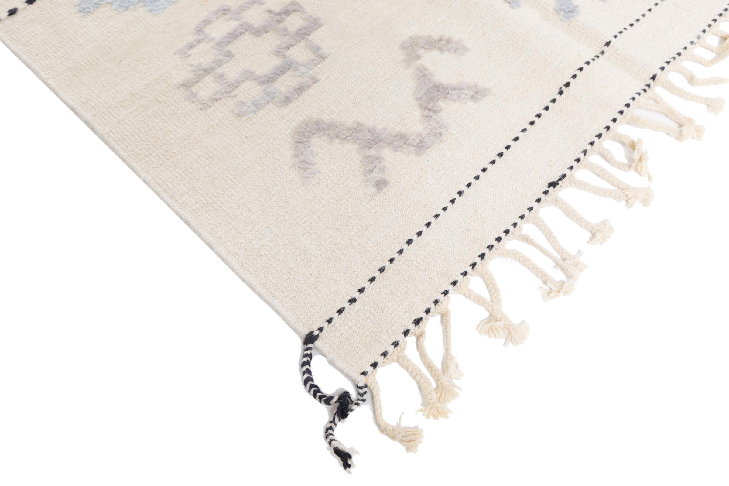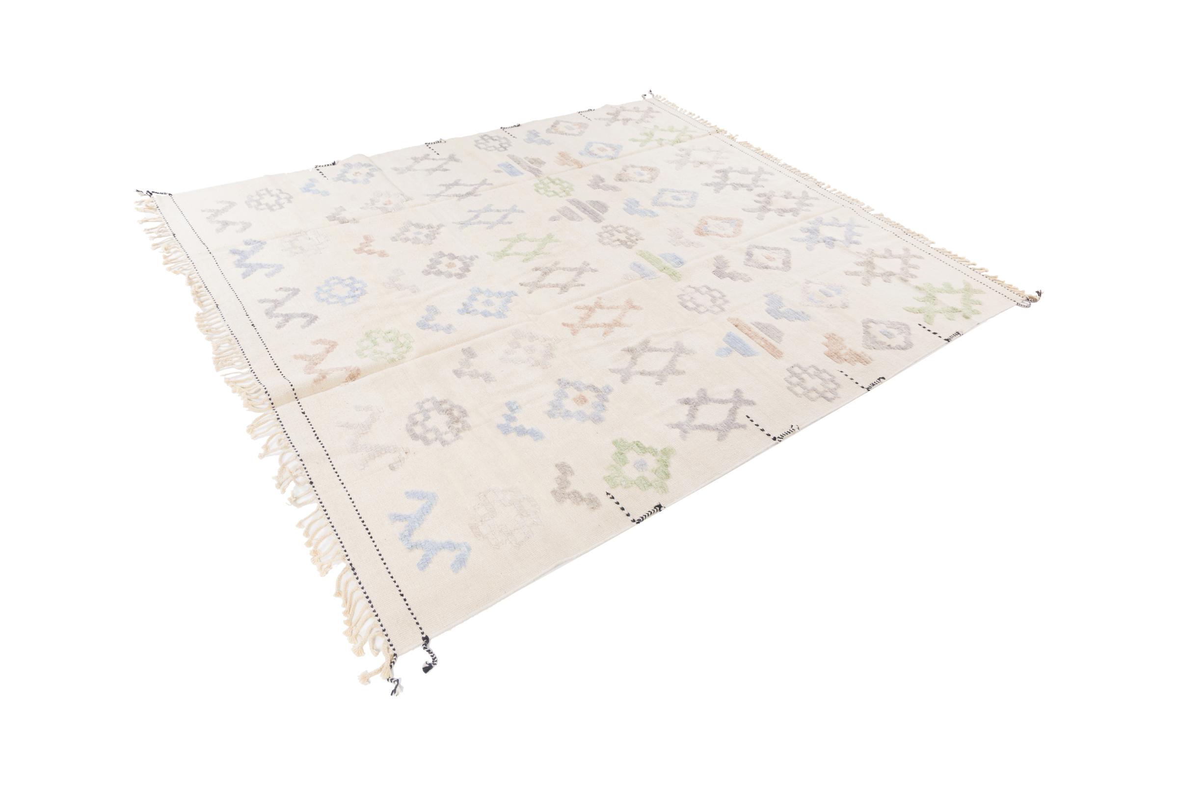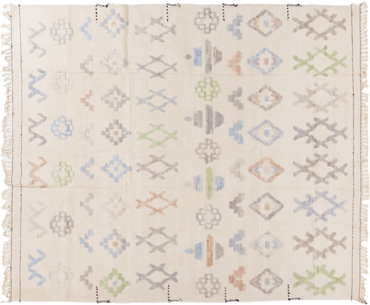 This rug was made as a flat weave by hand on a loom. Flatweave is the term used to describe rugs that have no pile. As the name promises, these rugs are woven and not knotted. This results in a flat rug with a structured surface. Flatweaves are not as soft and usually thinner than knotted rugs. At the same time they are much less complex to manufacture and can usually be laid out from both sides (front and back). Their patterns are usually geometric, which is determined by the fabric.